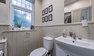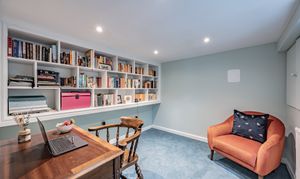 Below the main floor, the fully tanked and freshly carpeted cellar offers additional living or working space with two windows looking out to the driveway, making it feel like a natural extension of the home. Under the stairs, a porcelain-tiled area includes plumbing perfectly set up for conversion into an additional WC if desired. This area also houses the boiler. As part of a high-end flood defence system, under the cellar features five professionally installed pumps with a dedicated electrical unit. All documentation is available from the current owners, who have cared for the home for over 20 years. A separate office room, also with a window and fitted shelving, provides an ideal workspace.