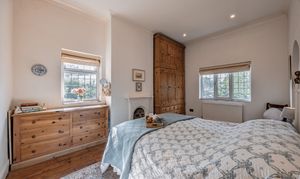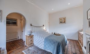Upstairs, the main bedroom impresses with high ceilings, original wooden floors, and an original cast iron fireplace. Dual-aspect windows, tiled window sills, and spotlights bring together old and new seamlessly. A charming archway leads to a walk-in dressing area with a deep storage cupboard, this space also offers potential as a cot room.