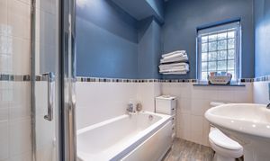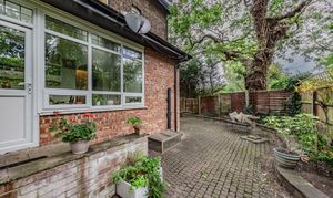 An archway leads to the property’s extension, where you’ll find a bright sunroom with two skylights, a large window, and direct access to the rear garden. A downstairs WC with a window adds convenience. Steps lead down to a private, cobbled courtyard style garden adorned with roses, a tranquil and entirely unoverlooked outdoor space that feels like a true escape. An original outhouse at the rear, possibly once used for coal storage, now provides useful external storage, along with an outside tap and flower pots bursting with blooms, including hydrangeas and tomatoes. The front garden features two traditional lampposts, a lawned area, and a delightful mix of plants and flowers, an eclectic and peaceful setting where mature trees absorb surrounding sounds, enhancing the sense of seclusion.