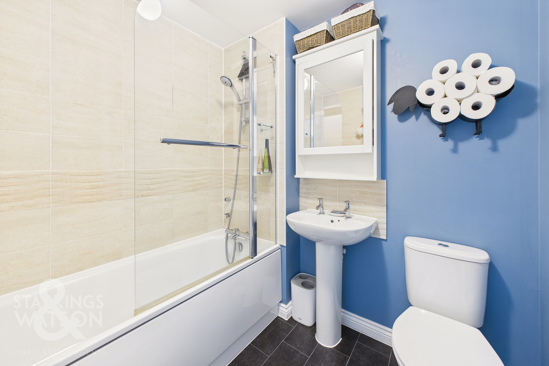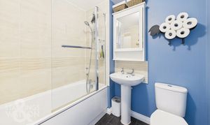 Ascending the stairs to the first floor landing, doors lead to two bedrooms. The larger of the two is a well proportioned double room with carpeted flooring and a rear facing aspect. The second bedroom is currently utilised as a single room but would make an ideal home office or studio. Centrally located on this floor, the family bathroom offers a shower over the bath with a glass splashback.