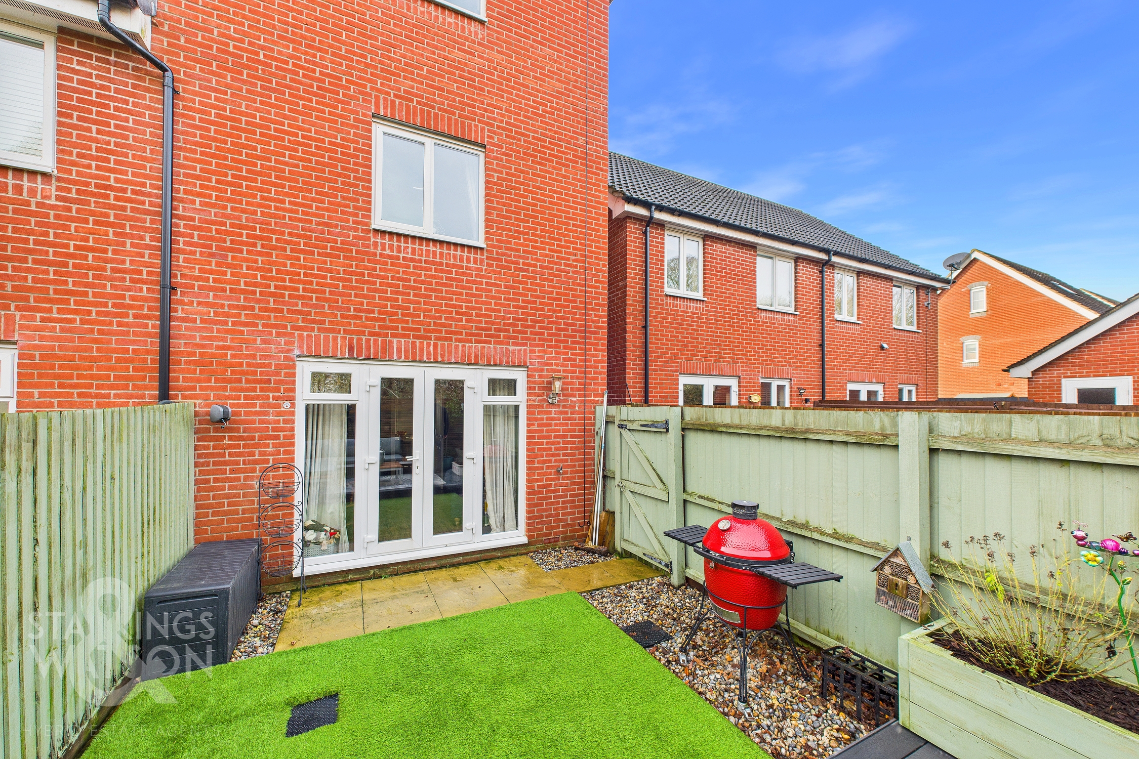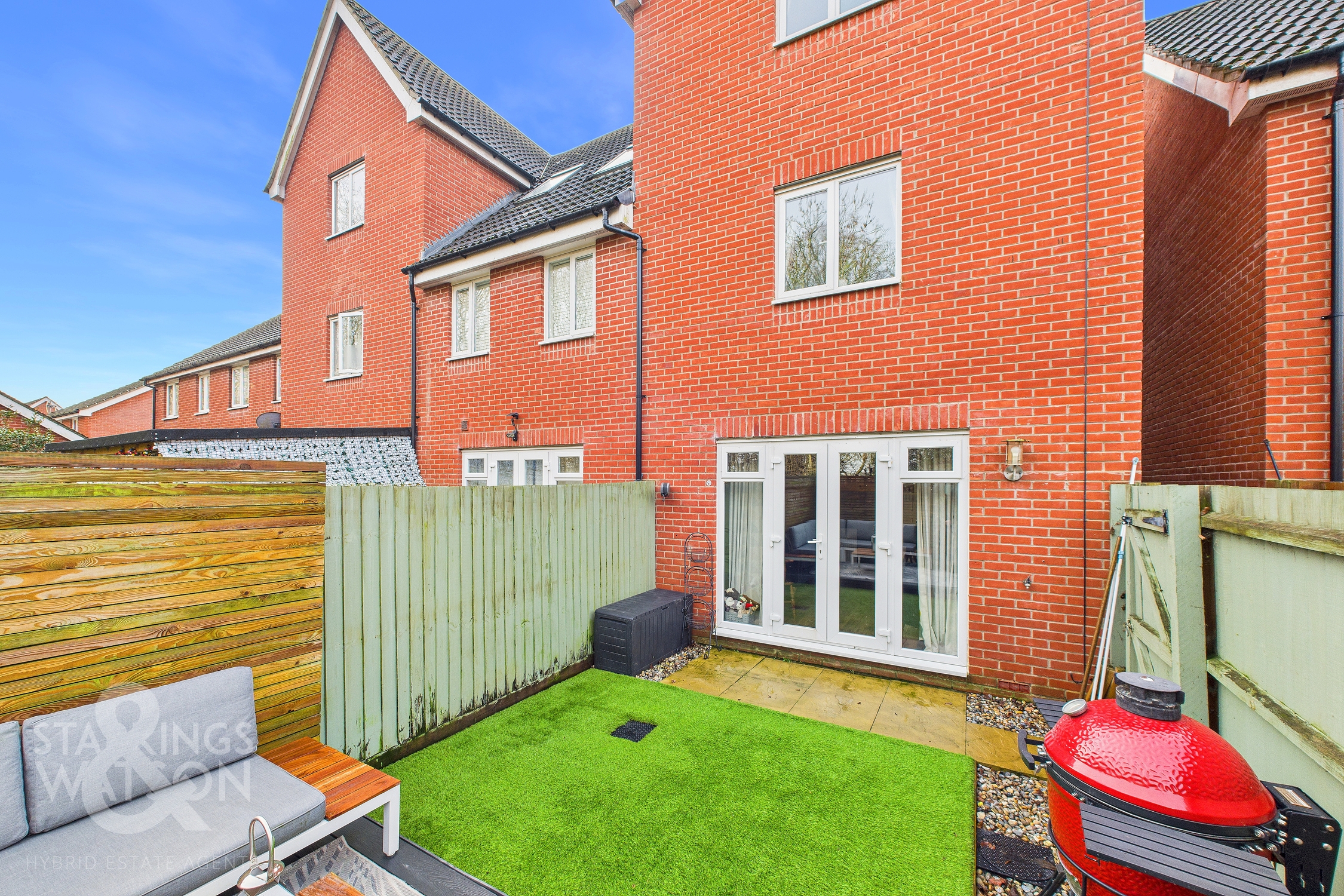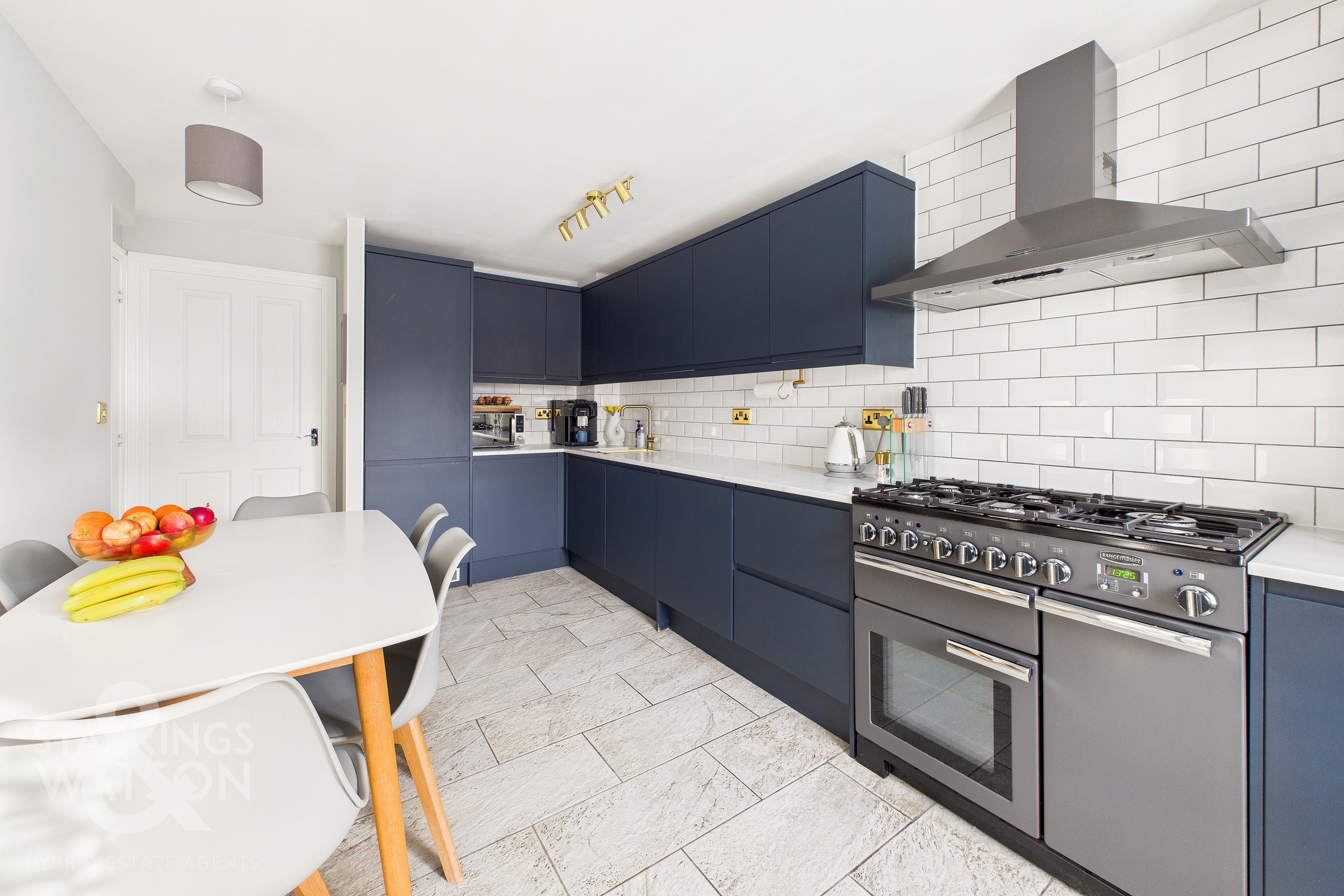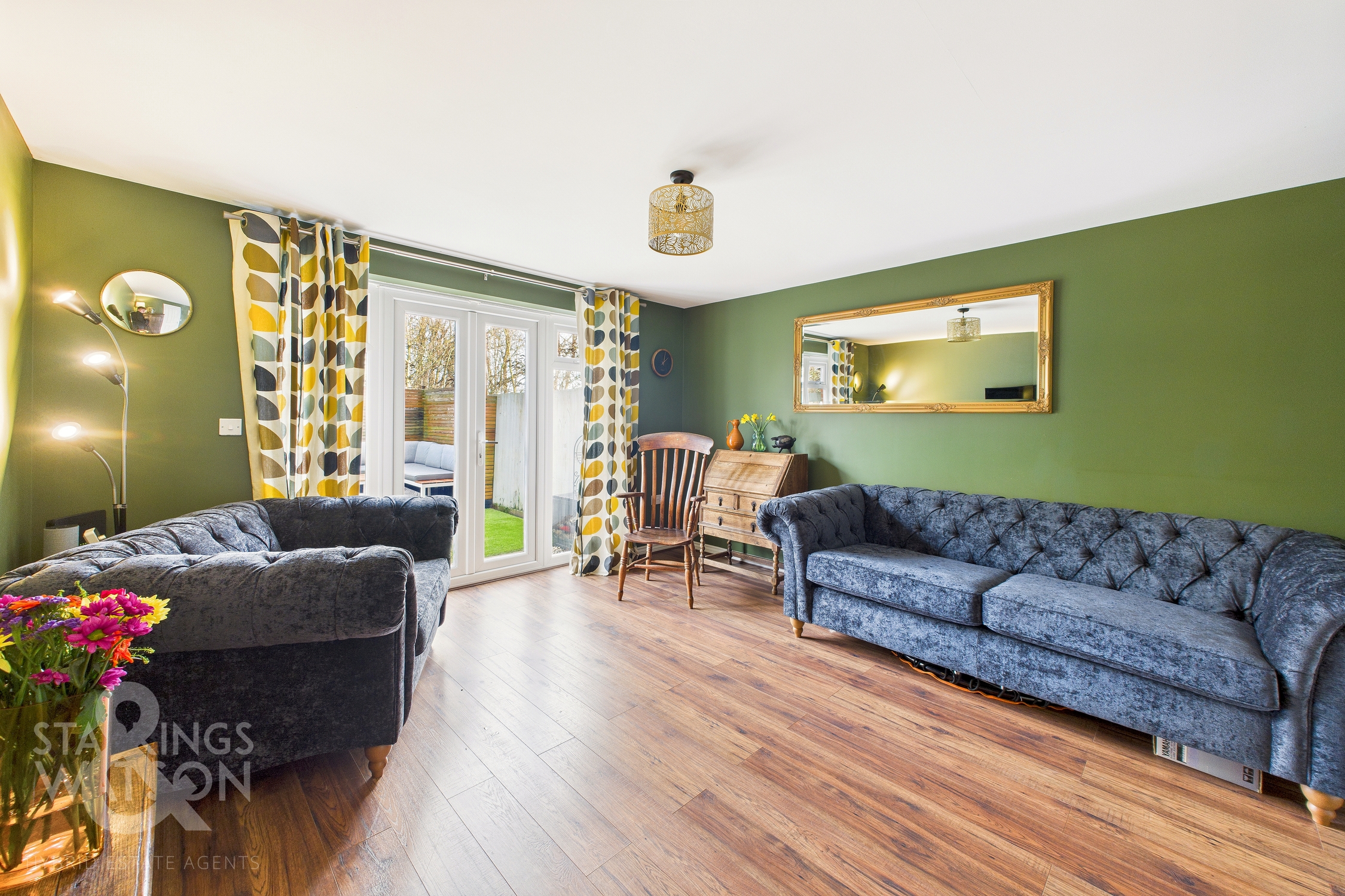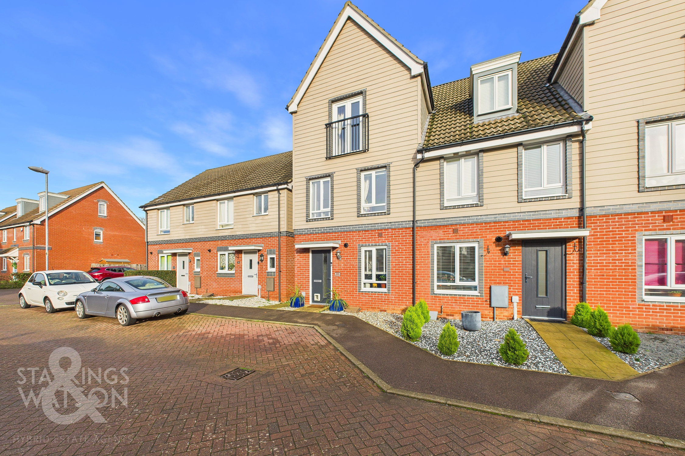 This IMMACULATELY PRESENTED end terrace TOWN HOUSE is situated on the edge of this popular development, with a gorgeous TREE LINED BACKING providing beautiful views and privacy. The interior stretches to just over 1120 Sq. ft (stms), split over three floors. The accommodation includes the 16’ OPEN PLAN KITCHEN/DINING ROOM, boasting a stunning HIGH SPECIFICATION including INTEGRATED APPLIANCES. A ground floor W.C offers convenience, whilst the 13’ SITTING ROOM enjoys views of the garden from uPVC double glazed FRENCH DOORS. The next two floors include FOUR BEDROOMS, with the smallest room currently used as a single bedroom and could make an ideal HOME OFFICE/STUDY. Three bedrooms are serviced by a three piece FAMILY BATHROOM including a shower over the bath, whilst the MAIN BEDROOM includes a private ENSUITE SHOWER ROOM. Stepping outside, the PRIVATE GARDEN is FULLY ENCLOSED and landscaped, with a TREE-LINED REAR ASPECT. DRIVEWAY PARKING is available for multiple vehicles sitting in front of the ENBLOC GARAGE.