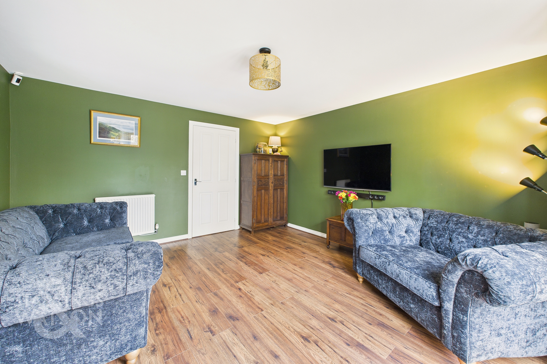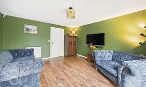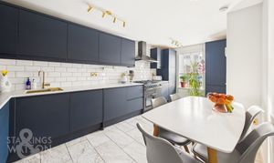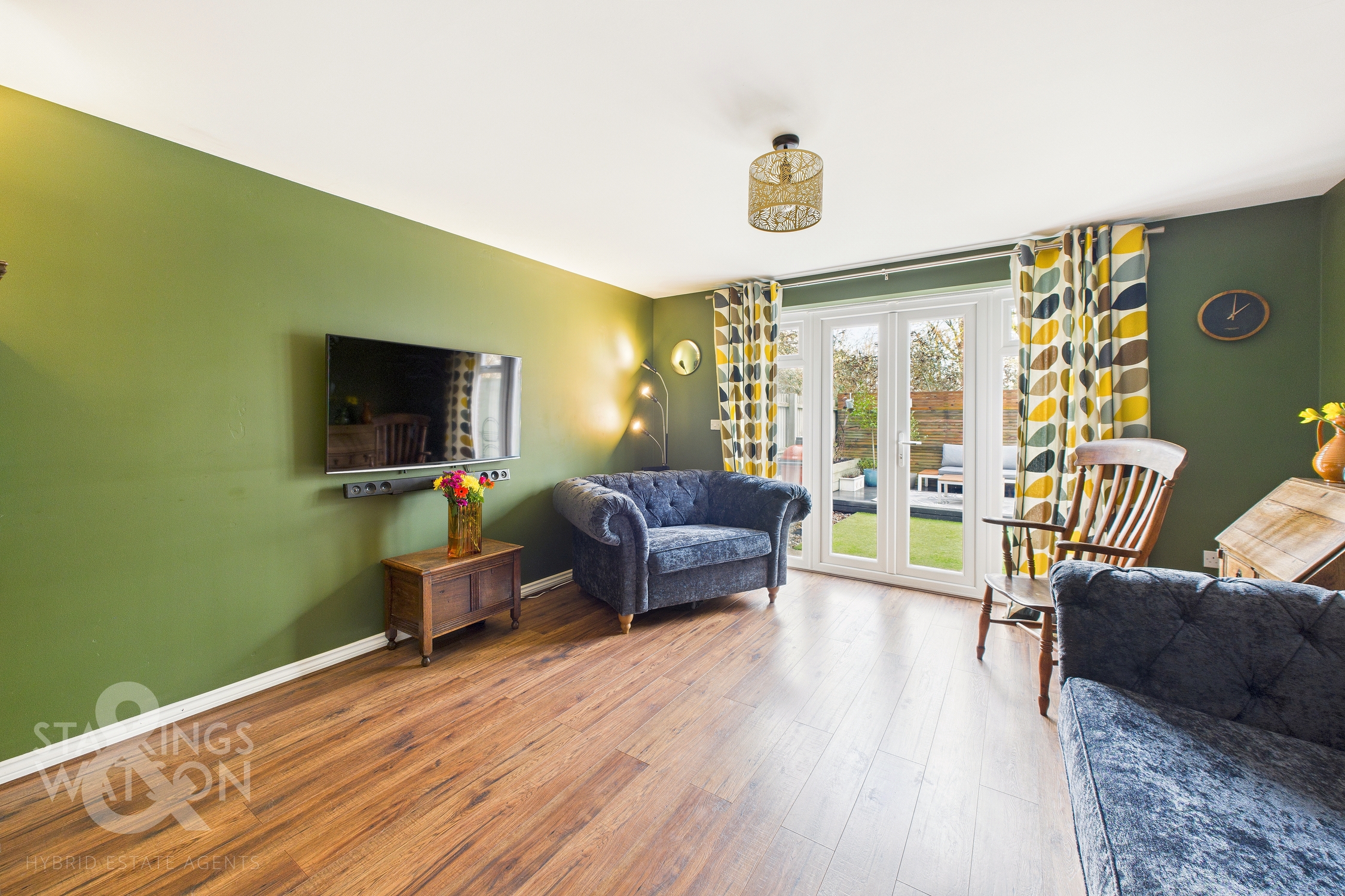 Stepping inside, the entrance hall features tiled flooring underfoot, designed for ease of maintenance, with stairs rising to the first floor. A door opens into the impressive 16’ open plan kitchen and dining room, which offers plentiful storage through a range of wall and base units. Integrated appliances include a dishwasher, washing machine, and fridge freezer. Alongside this high specification kitchen, there is ample room for formal dining. A door from the kitchen leads into the 13’ sitting room, which features hard flooring underfoot. This versatile space allows for a variety of soft furnishing layouts and is finished with uPVC double glazed French doors that flood the room with natural light and open directly to the garden.