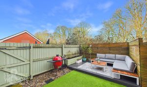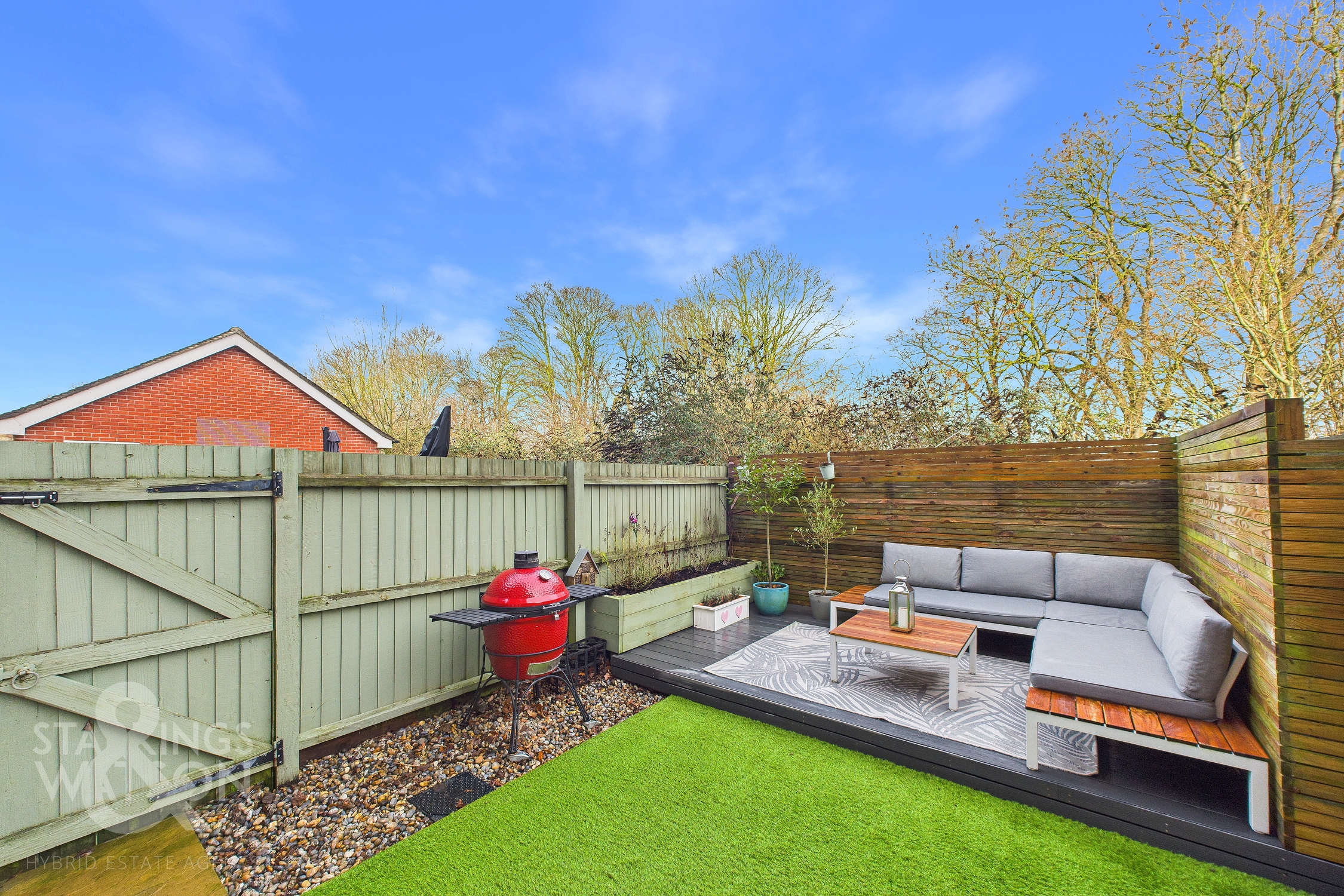 THE GREAT OUTDOORS Stepping outside, the rear garden is private, fully enclosed by timber panel fencing, and offers a peaceful outlook over surrounding greenery. To the left, a wooden latch and brace gate provides convenient access from the side of the property to the front. Designed with low maintenance in mind, the garden initially offers a flagstone patio and shingle area, leading onto a neat synthetic lawn. At the far end of the garden, a raised composite decking area provides the perfect elevated spot for outdoor furniture and alfresco dining during the warmer months.