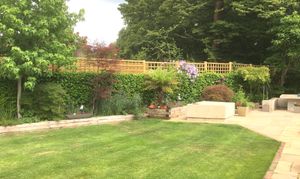 Mature Rear Garden (75' wide max x 39' deep max) laid to patios and lawn, seating and storage areas with timber fencing and gated access on both sides.