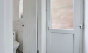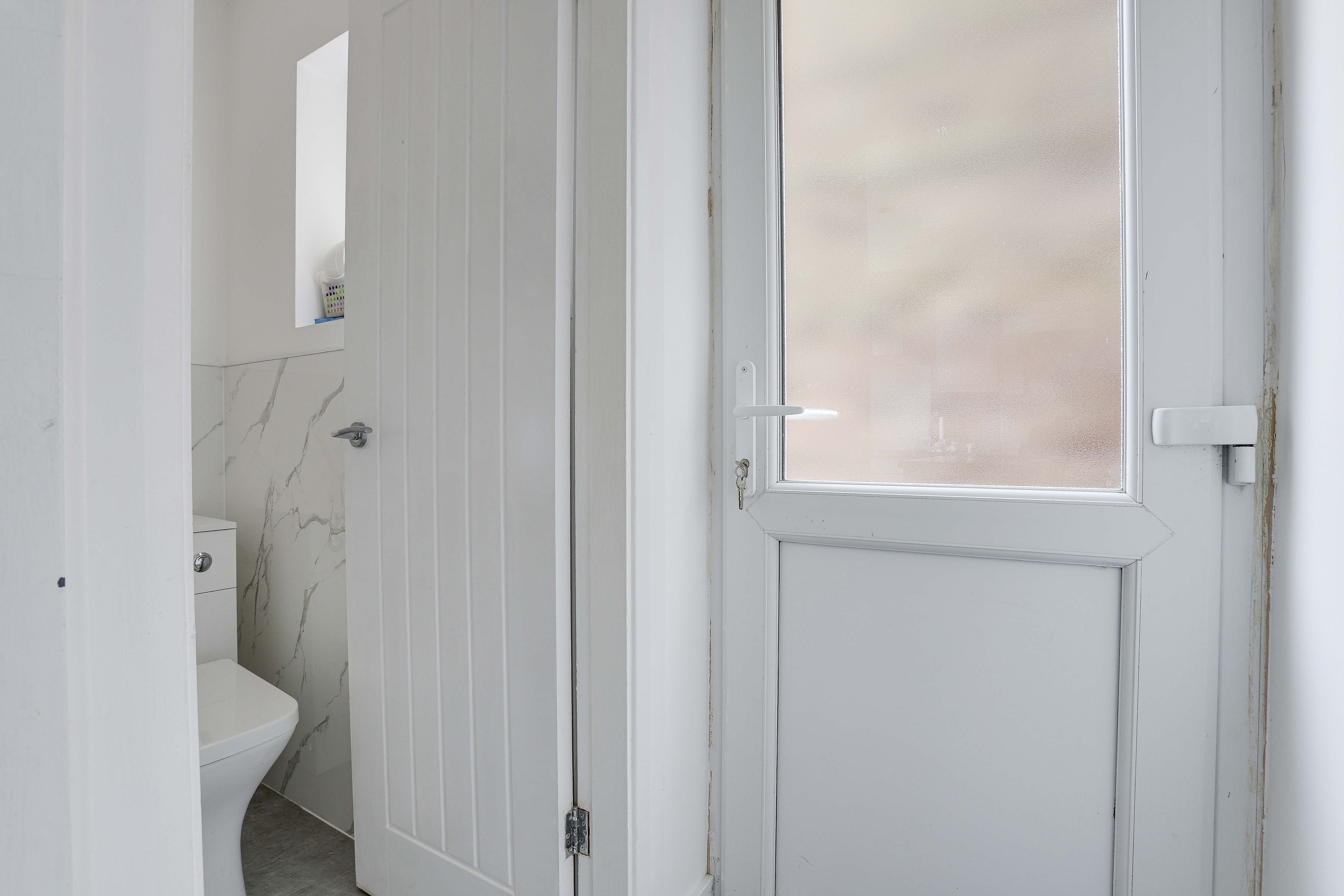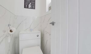 This space has a concealed dual flush WC, vinyl flooring, partially tiled walls, and a UPVC double-glazed obscure window to the side elevation.