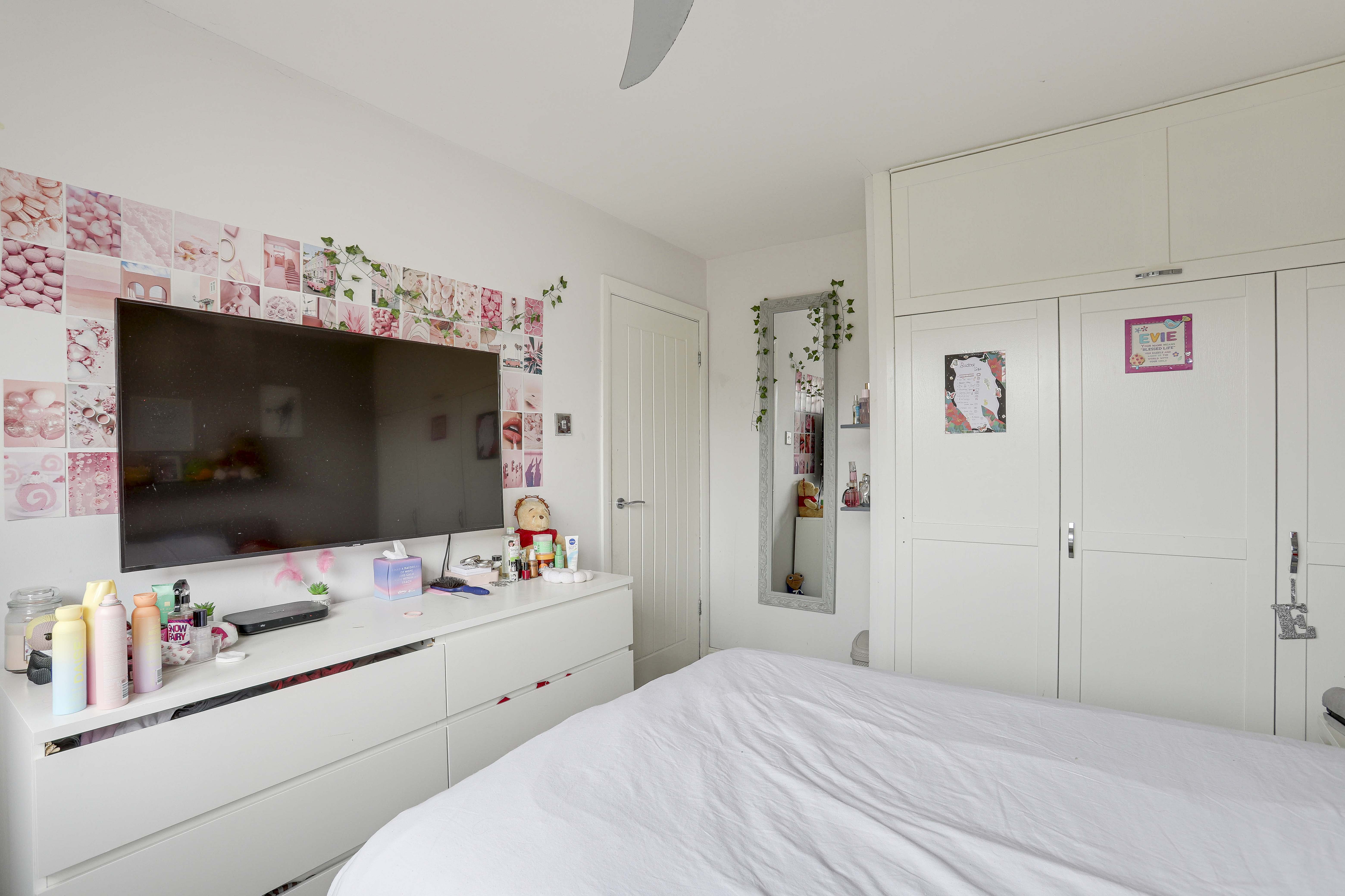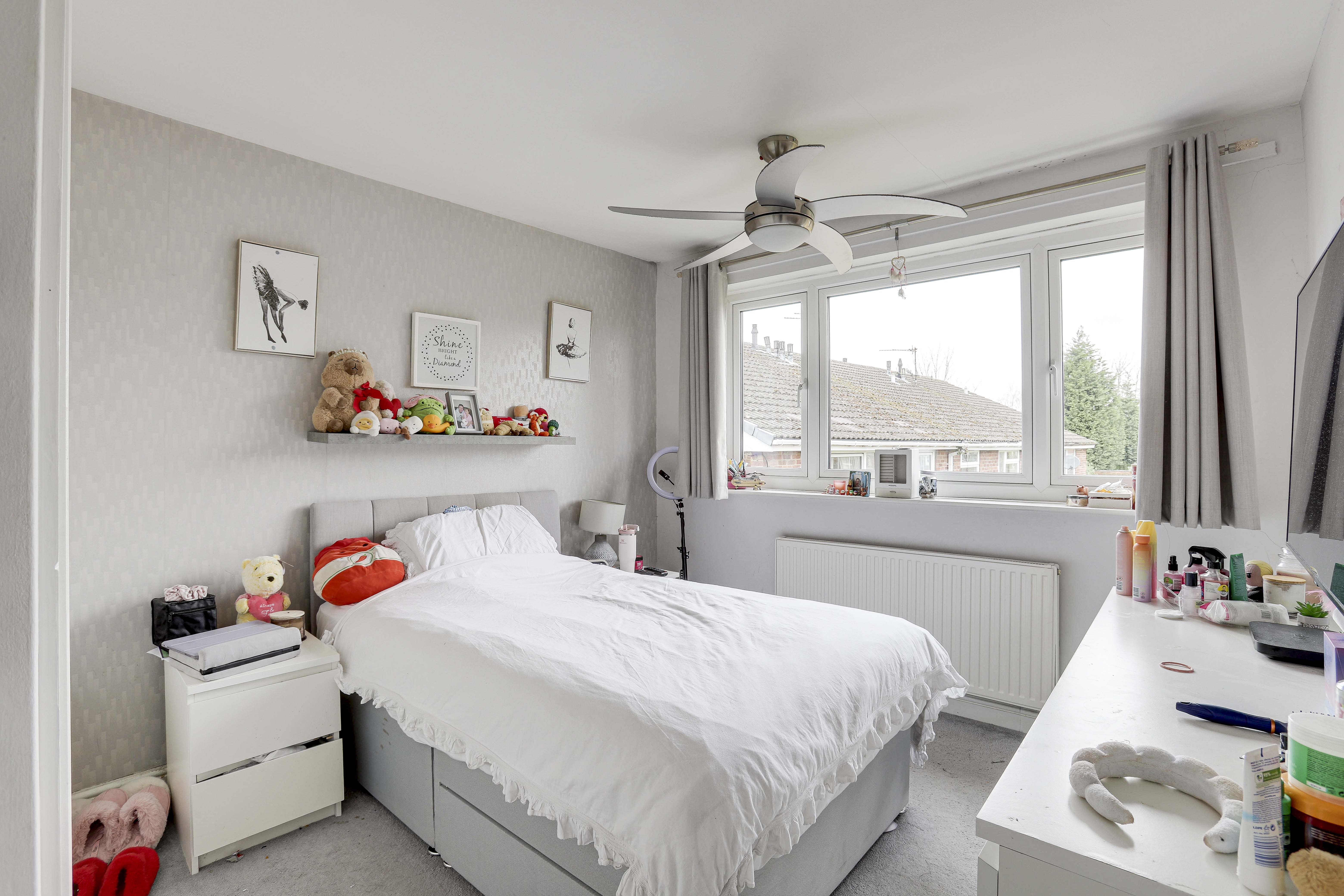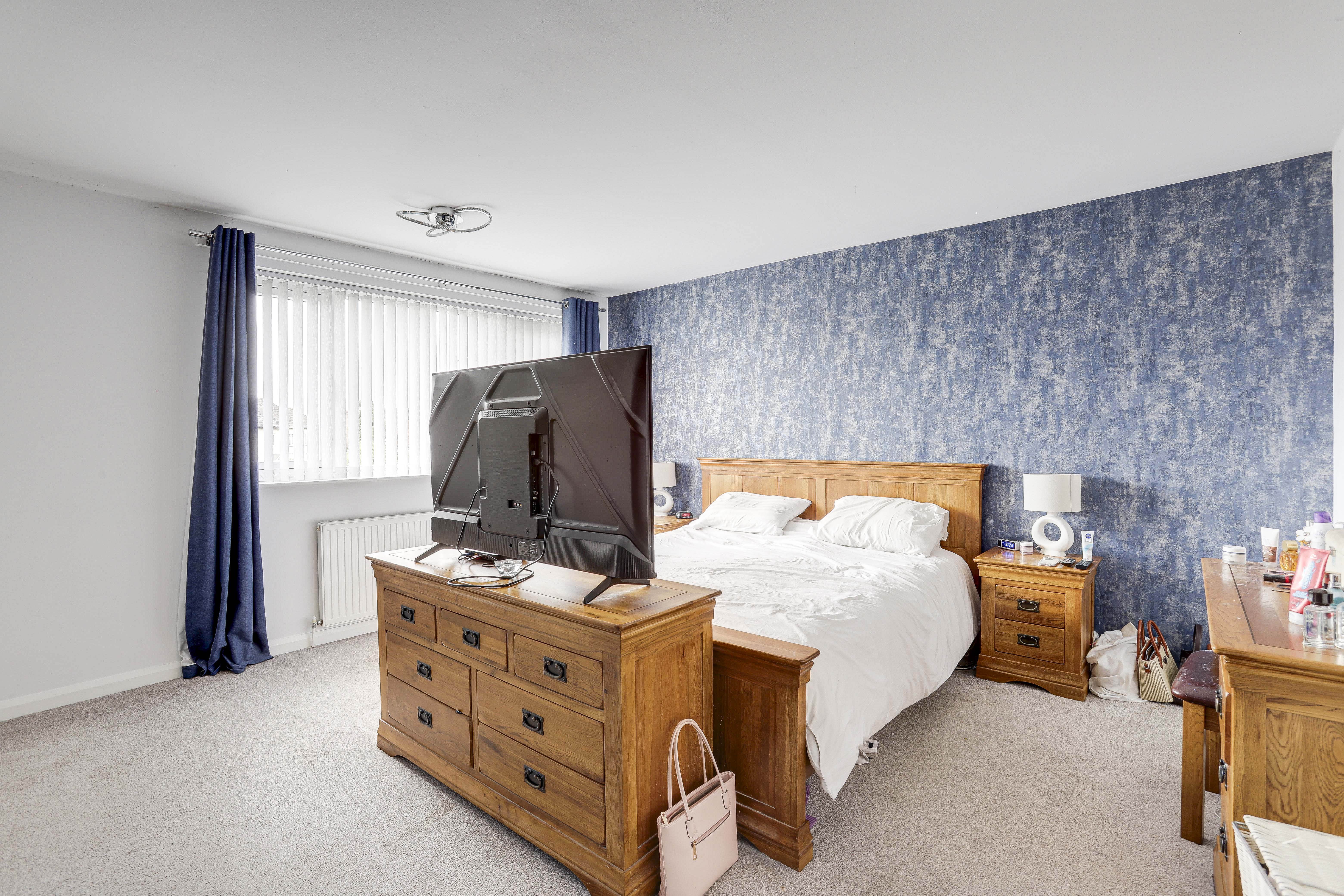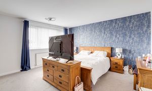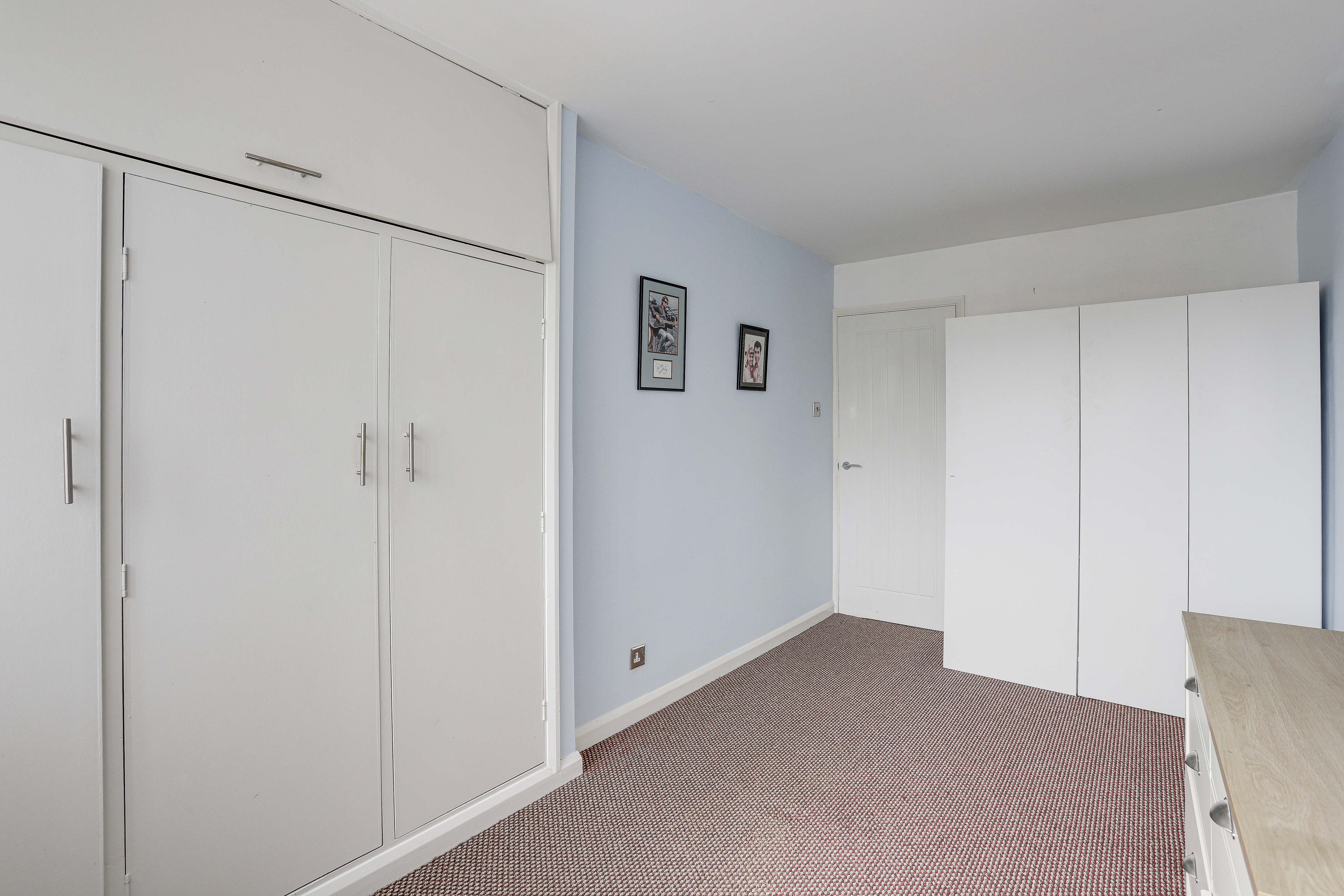 The second bedroom has a UPVC double-glazed window to the rear elevation, carpeted flooring, a radiator, and an in-built triple wardrobe with an overhead cupboard.