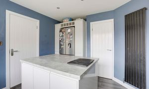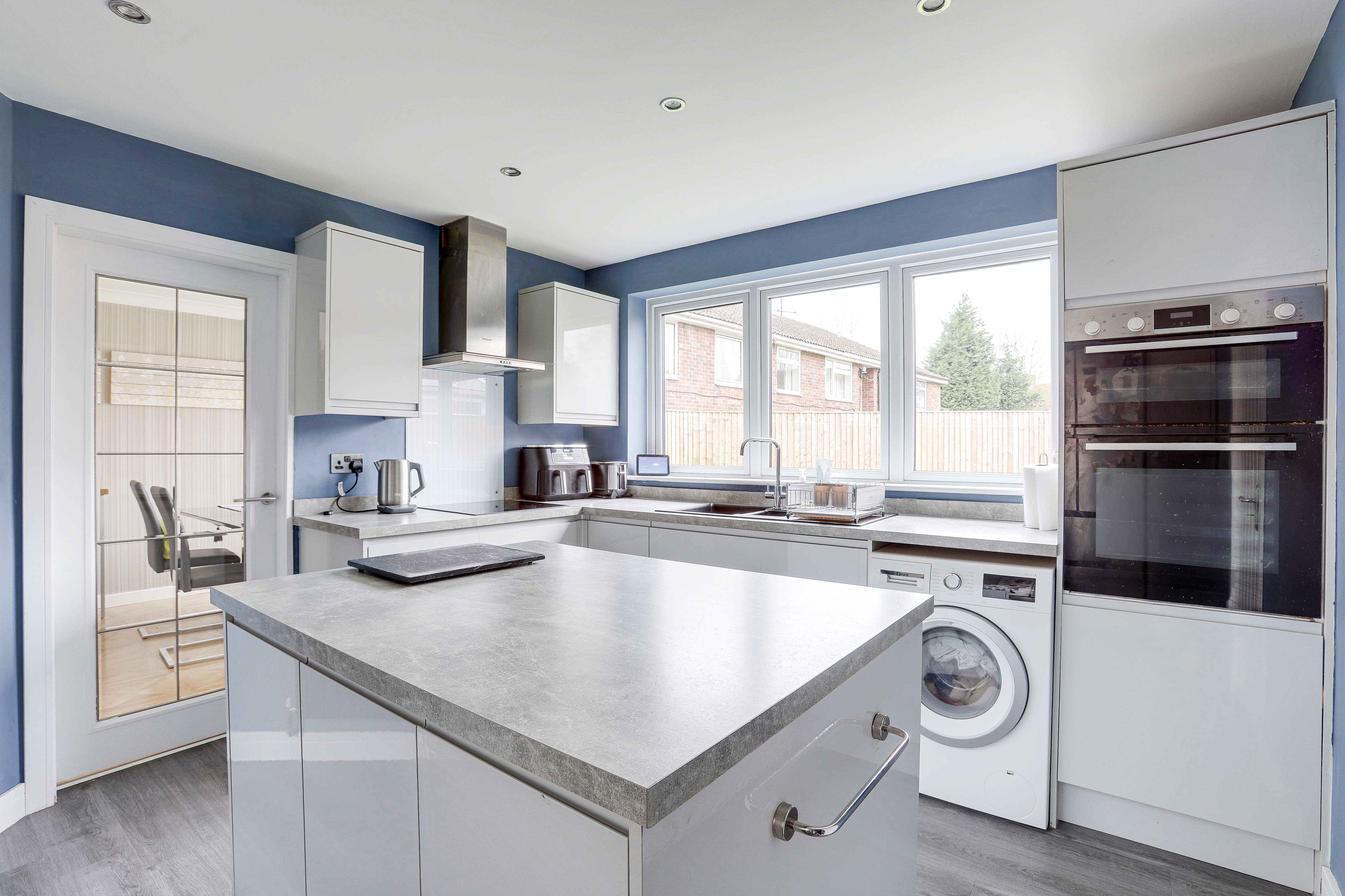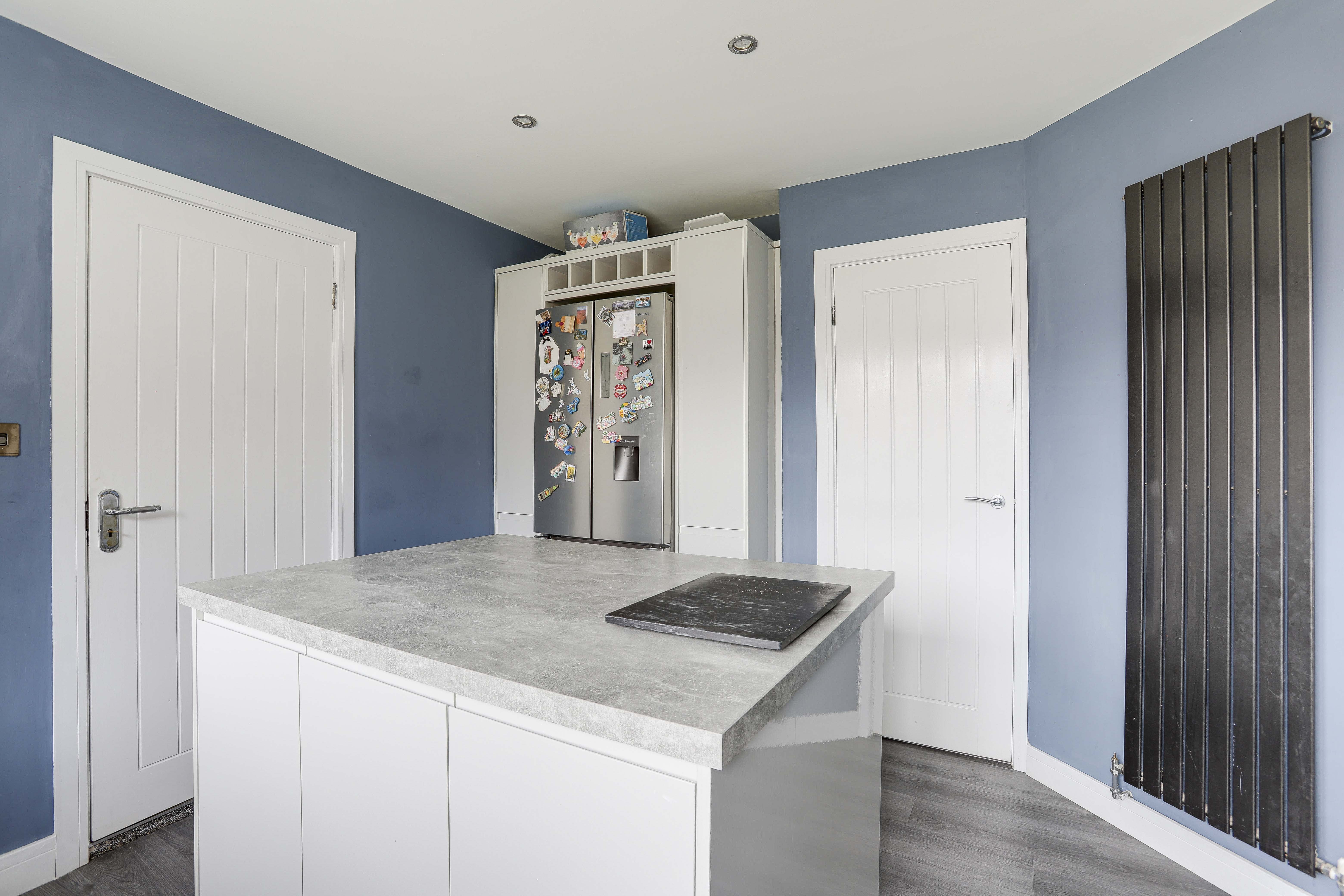 The kitchen has a range of fitted gloss handleless base and wall units with a grey concrete-effect laminate worktop and a breakfast bar island, a composite sink and a half with a swan neck mixer tap and drainer, an integrated double oven, an electric hob with an extractor hood and splashback, an integrated dishwasher, space for an American-style fridge freezer, space and plumbing for a washing machine, wood-effect flooring, a vertical radiator, recessed spotlights, an in-built pantry cupboard, and a UPVC double-glazed window to the rear elevation.
