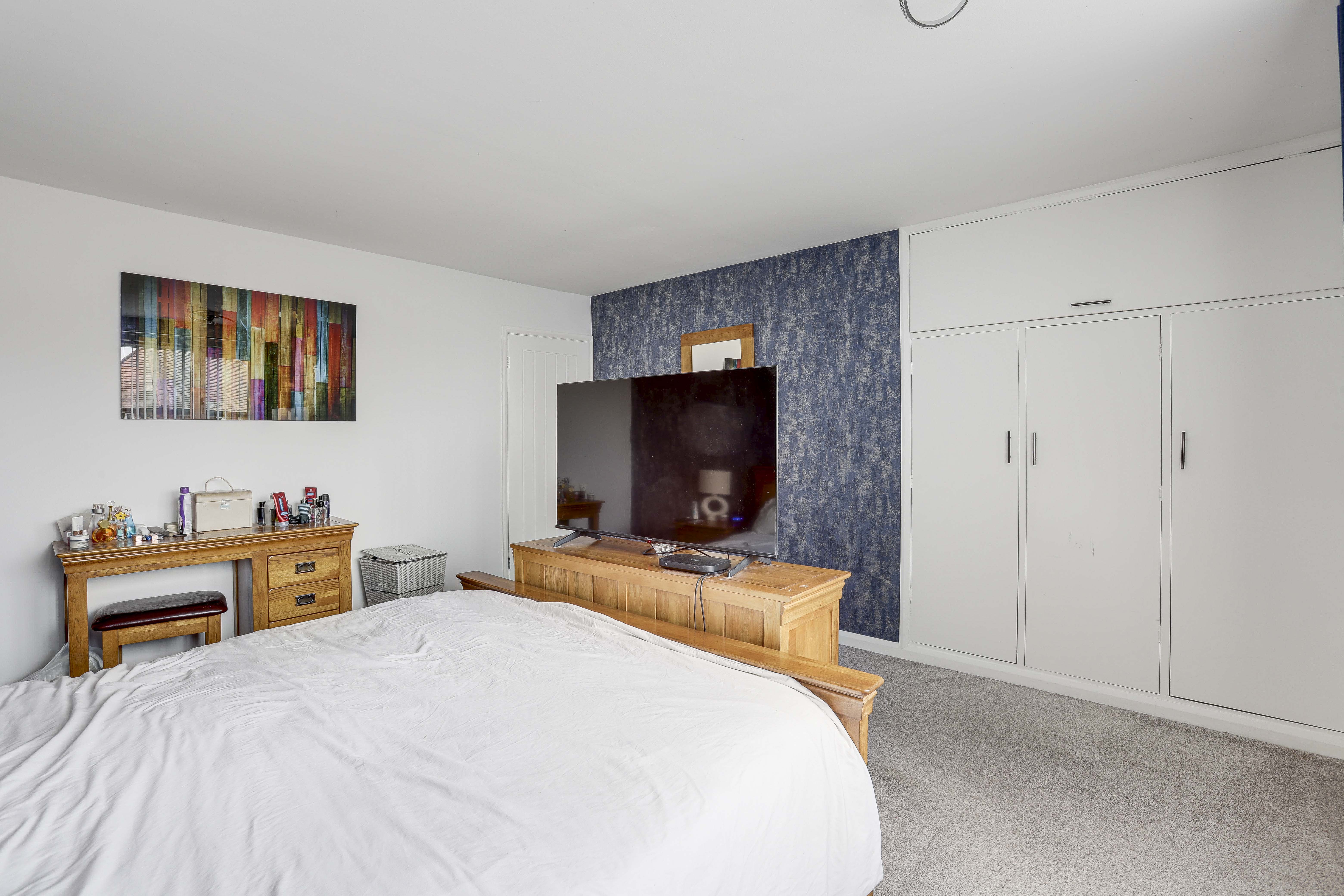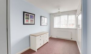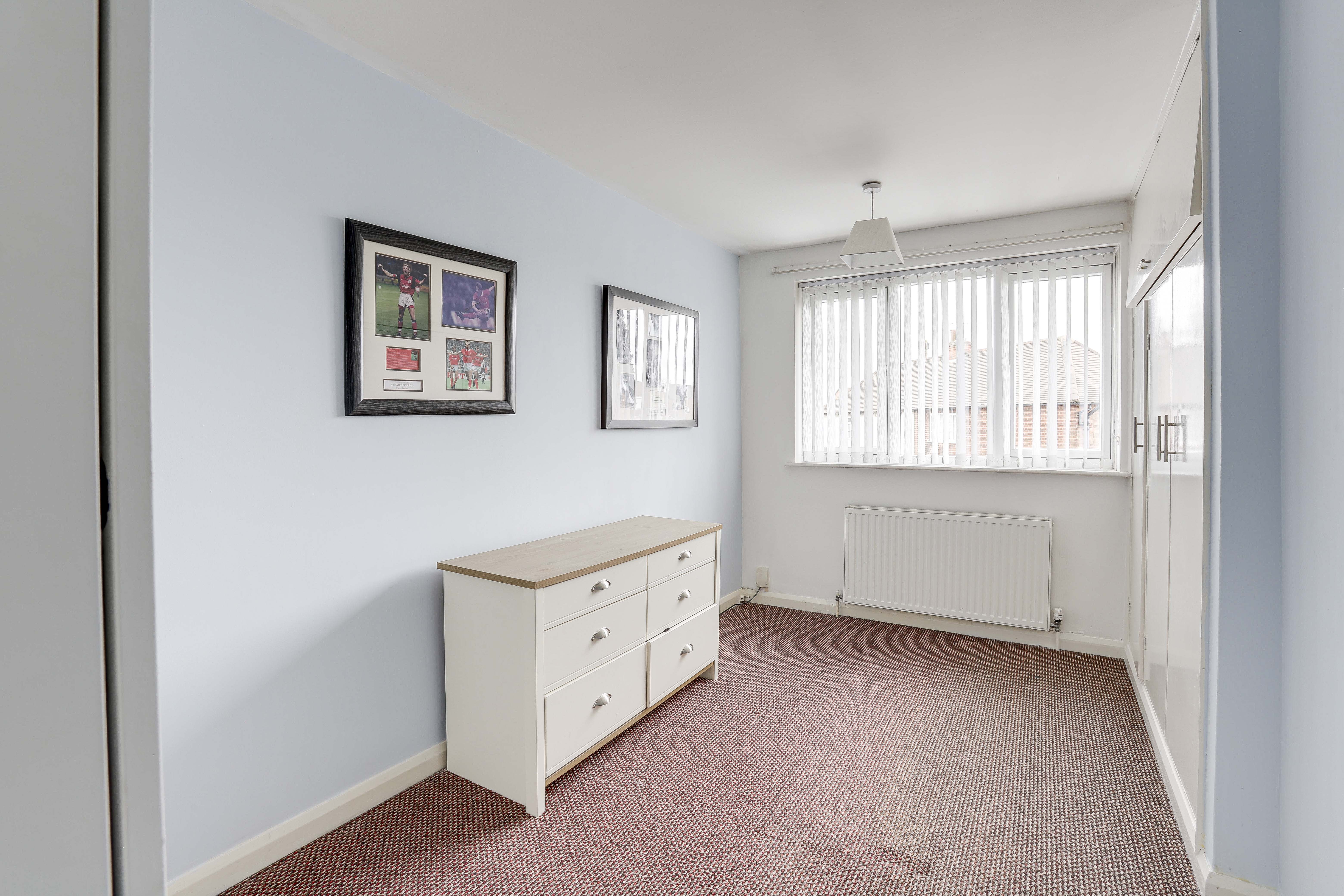 The third bedroom has a UPVC double-glazed window to the front elevation, carpeted flooring, a radiator, and an in-built triple wardrobe with an overhead cupboard.