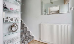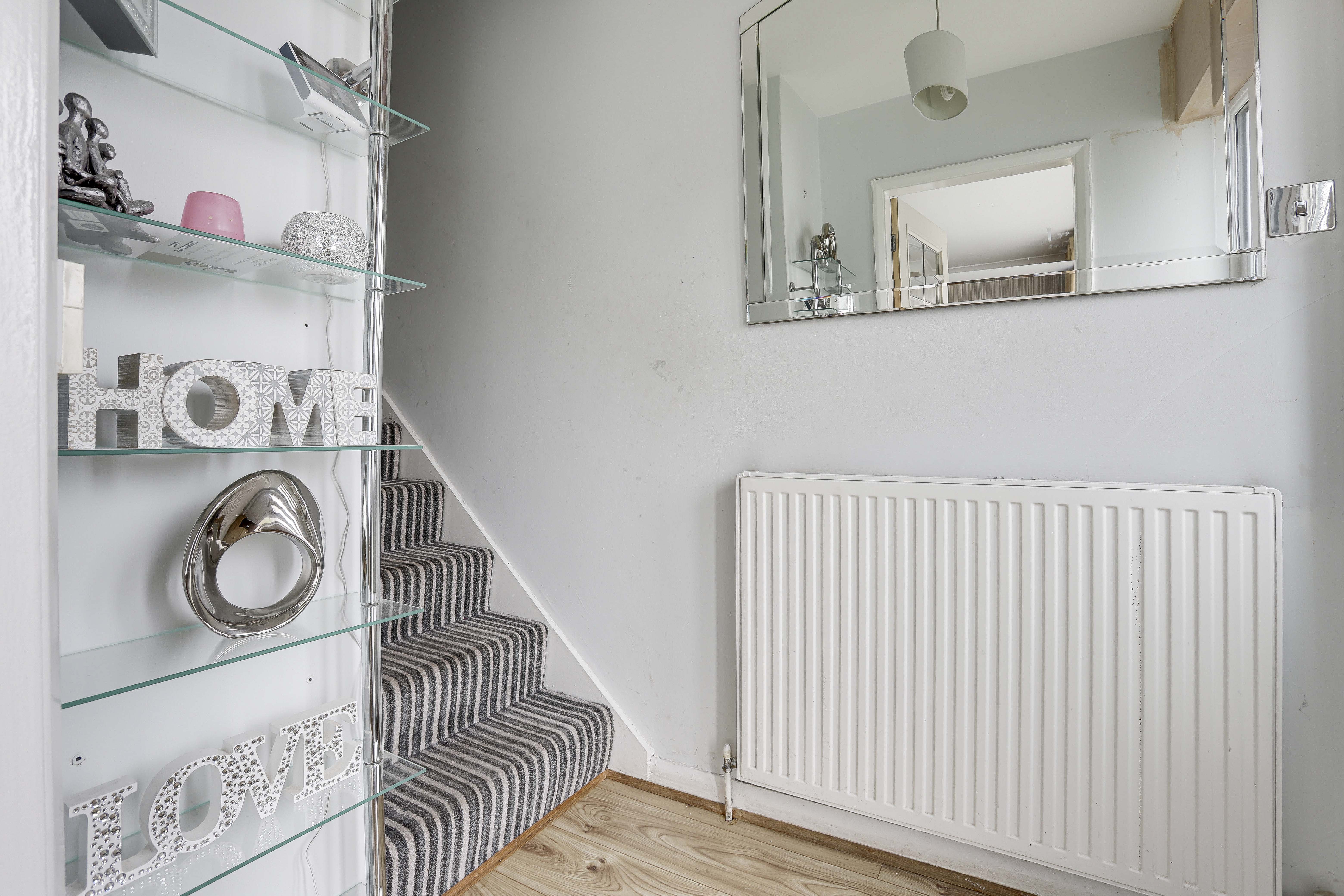 The entrance hall has wood-effect flooring, a radiator, carpeted stairs, a UPVC double-glazed obscure panel window to the front elevation, and a single composite door providing access into the accommodation.