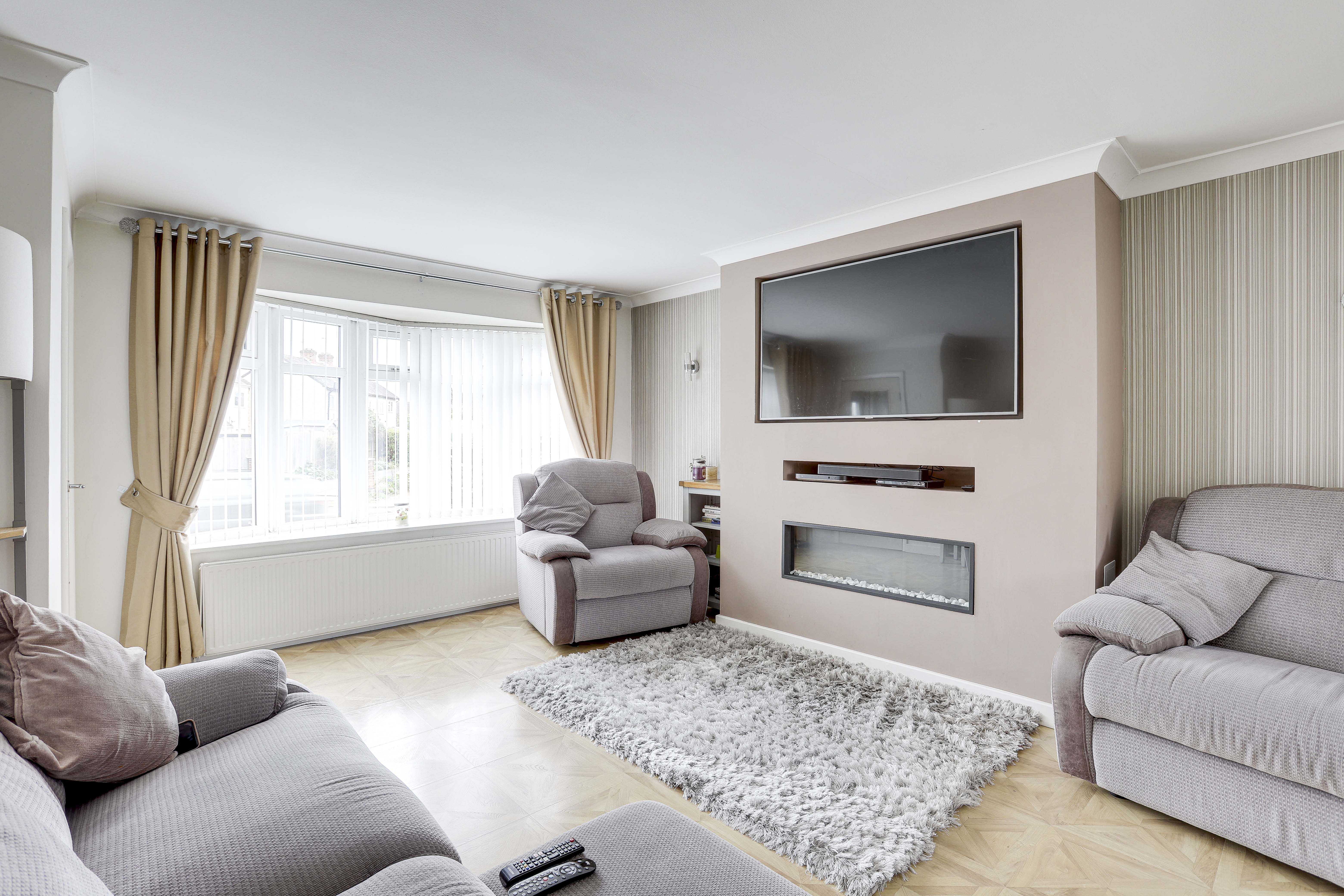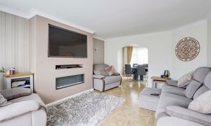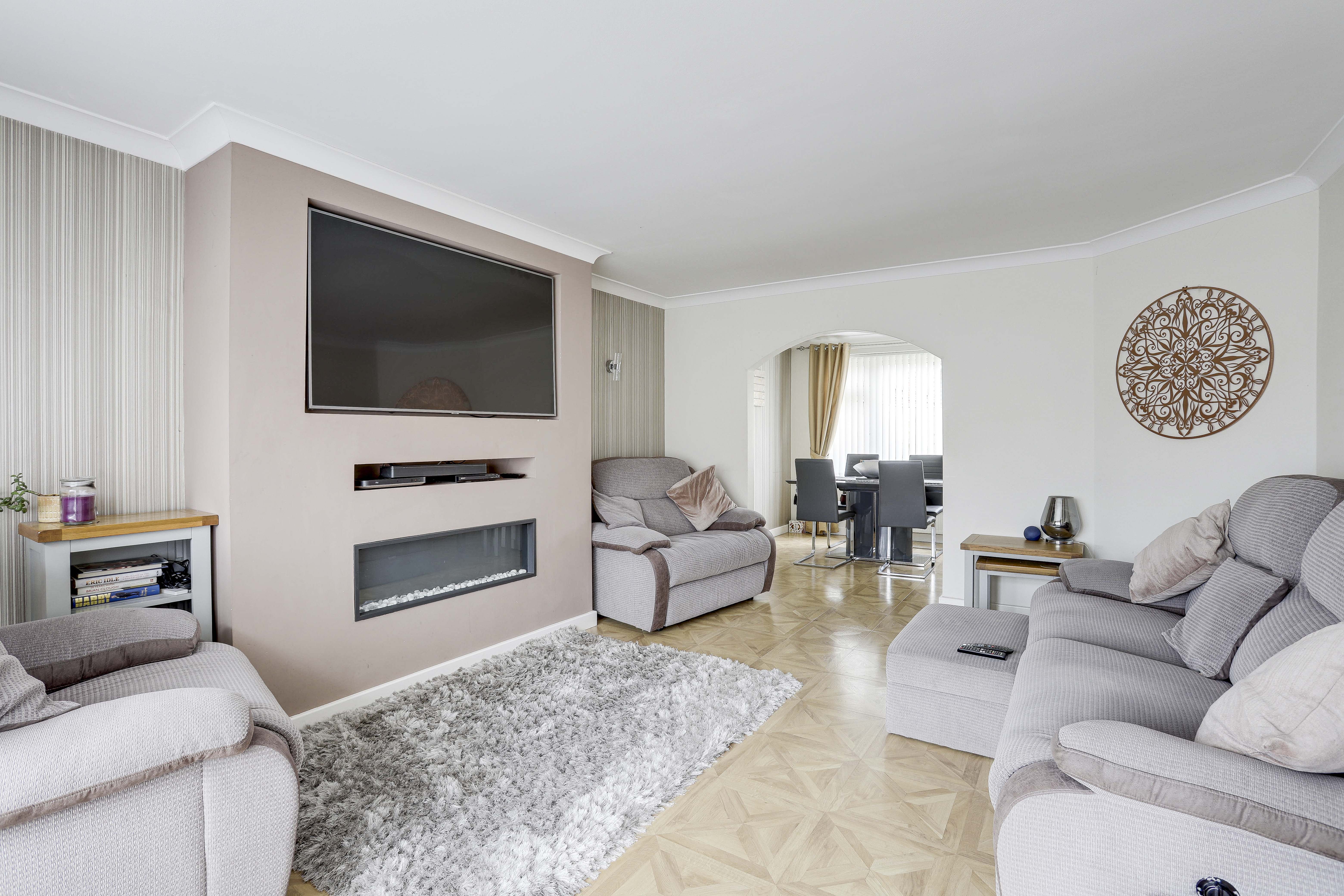 The living room has a UPVC double-glazed bow window to the front elevation, Versailles parquet style flooring, a radiator, a media wall with a TV point and a wall-mounted linear fireplace, coving to the ceiling, and open access into the dining room.