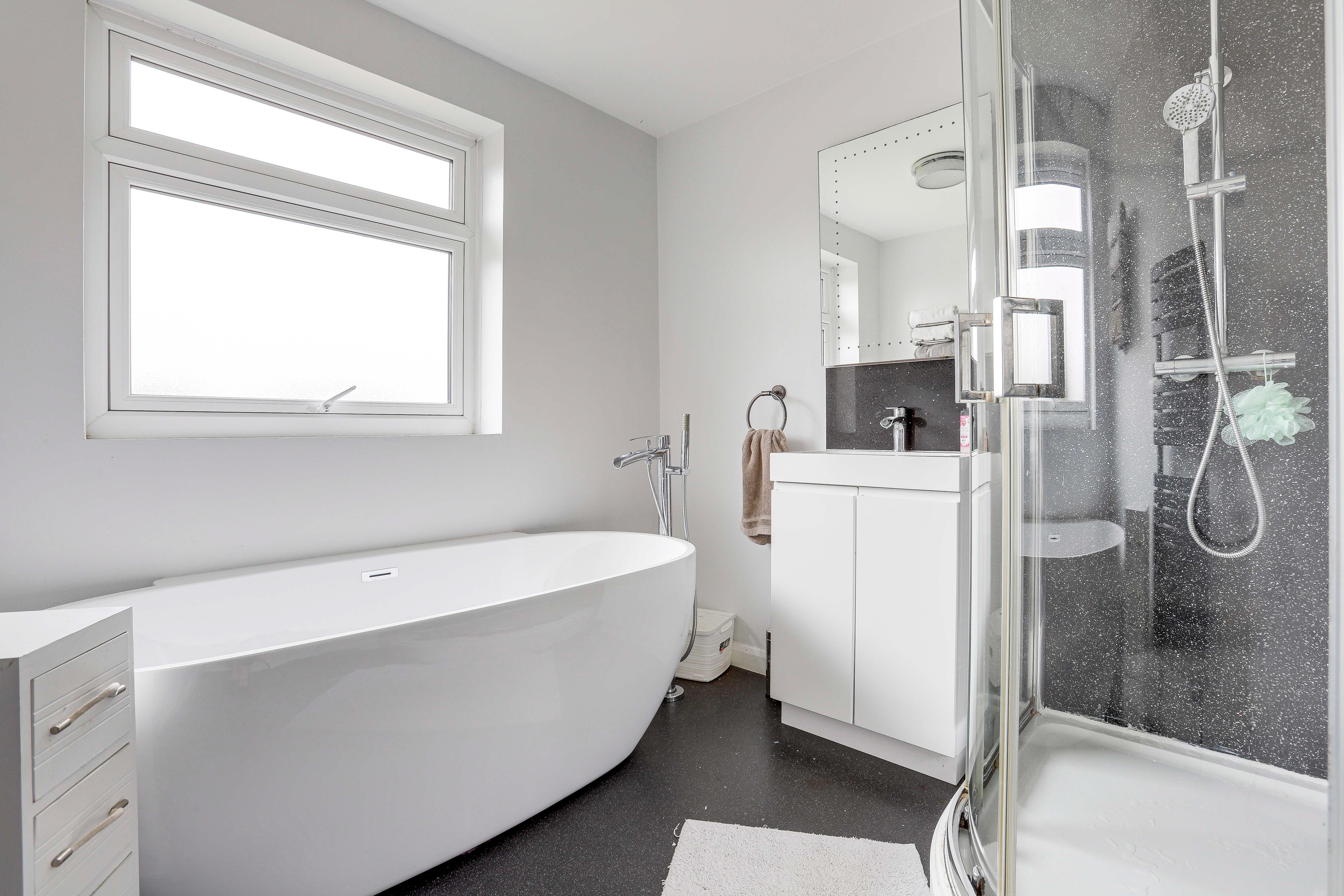 The bathroom has a vanity unit wash basin with fitted storage underneath, a modern oval freestanding acrylic bathtub with a floor standing mixer tap and handheld shower head, a corner fitted shower enclosure with an overhead rainfall shower and a handheld shower head, a heated towel rail, vinyl flooring, waterproof splashback, and a UPVC double-glazed obscure window to the rear elevation.