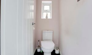This space has a low level dual flush WC, vinyl flooring, coving to the ceiling, and a UPVC double-glazed obscure window to the side elevation.
