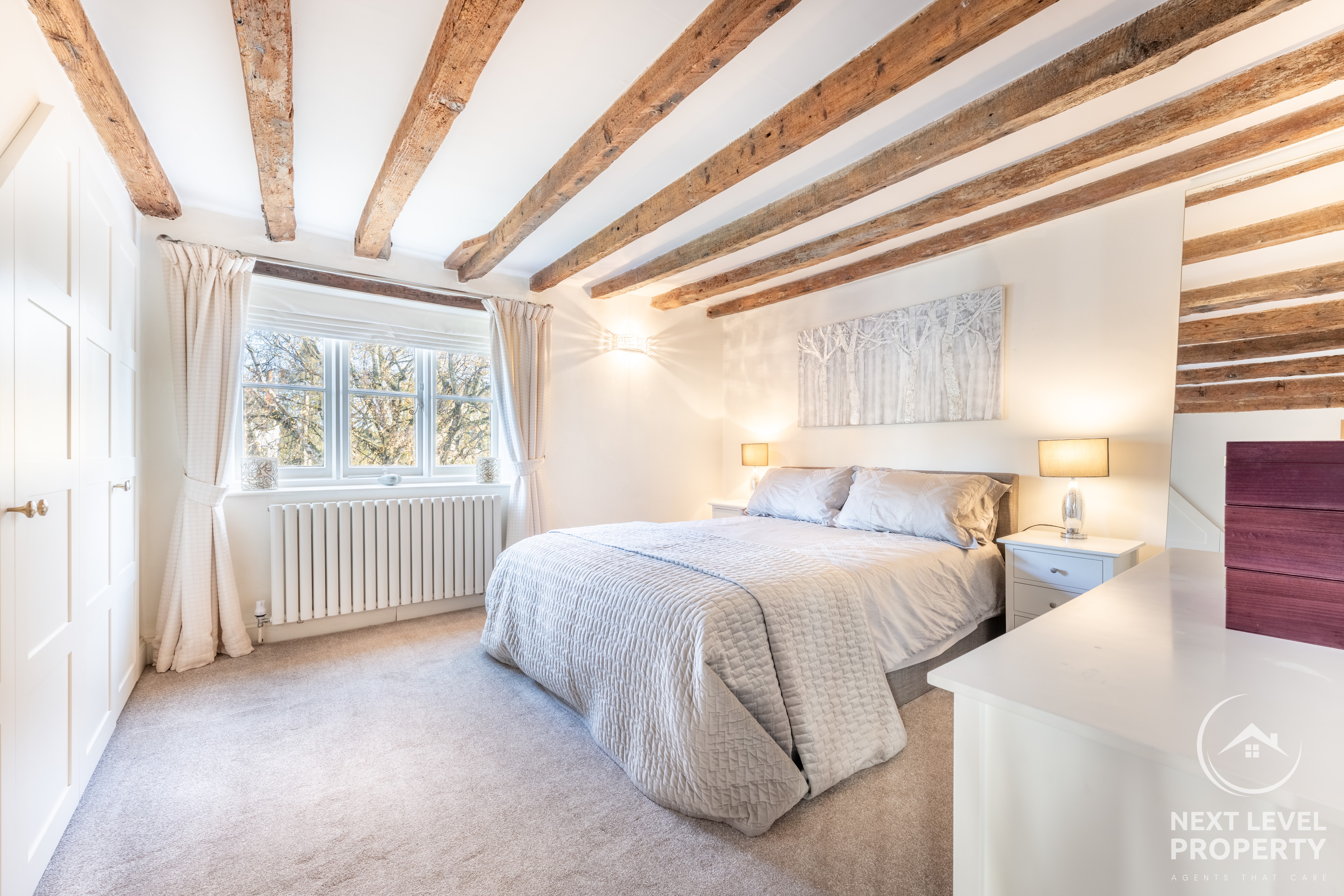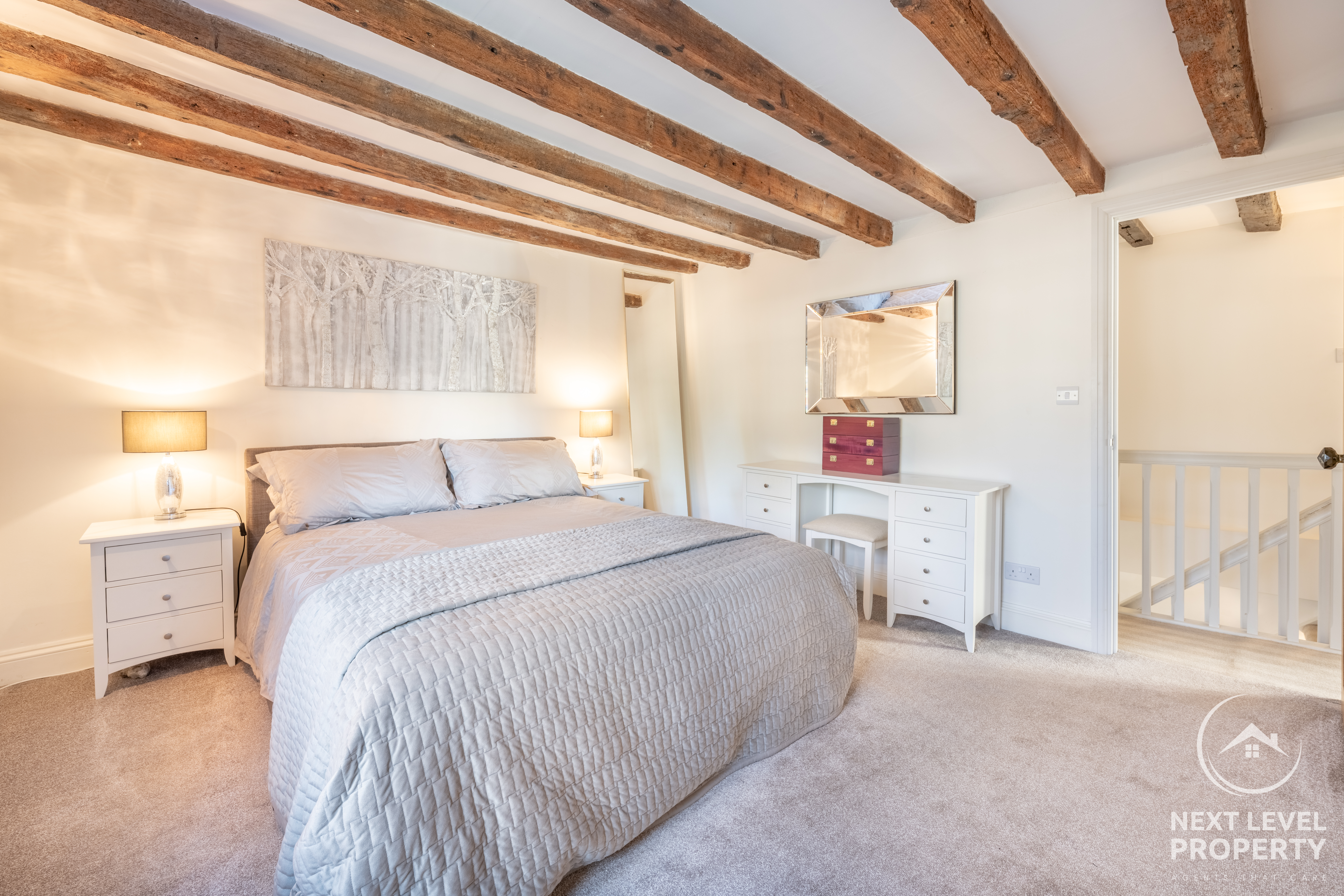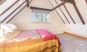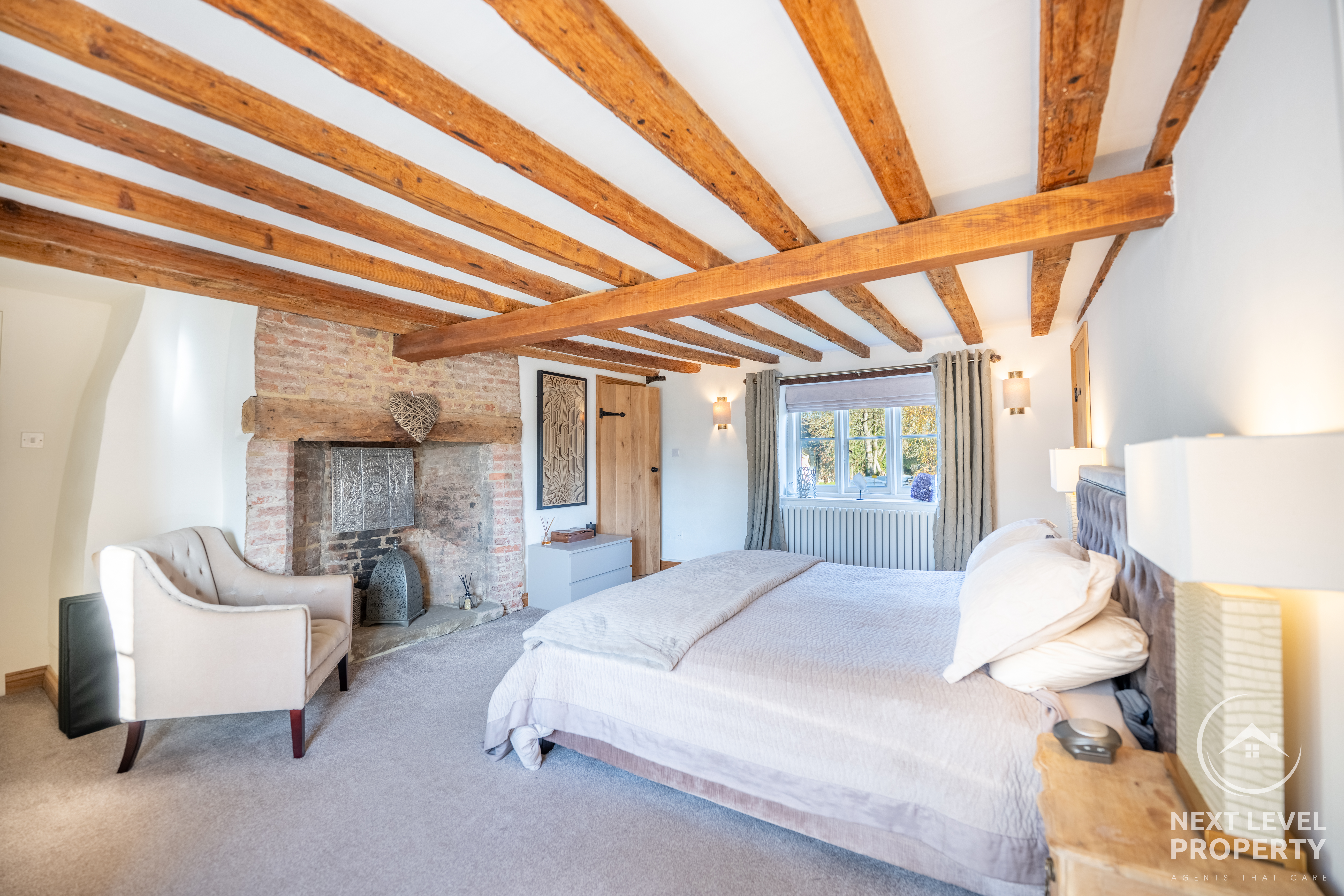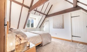 Upstairs, the bedrooms each have their own quiet personality. Some tuck themselves beneath vaulted ceilings, others reveal exposed beams or a walk-in wardrobe, while the principal bedroom enjoys the soft romance of its own feature fireplace. Morning light moves across these rooms differently each day — a reminder of the home’s age, its angles, its charm.