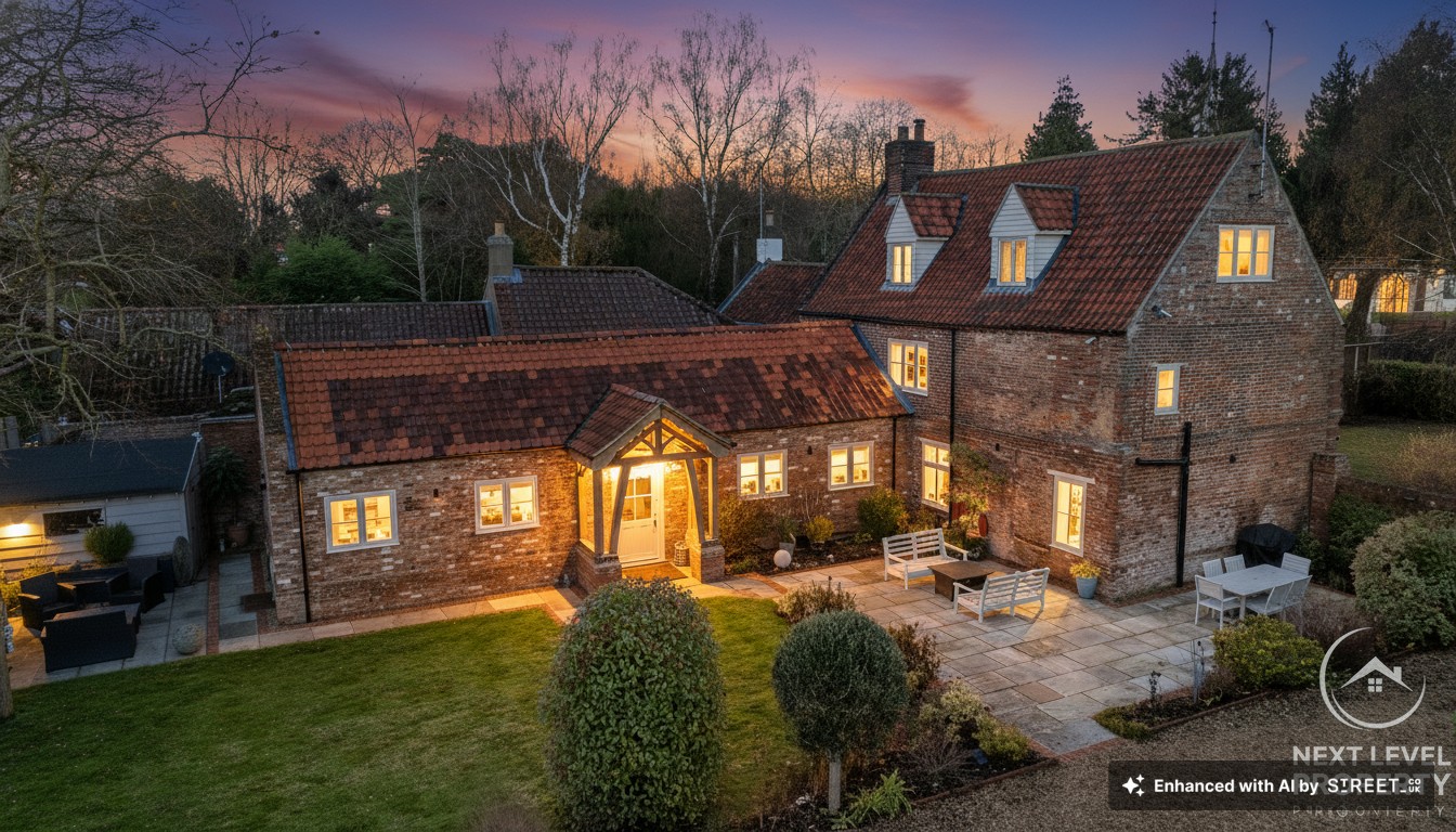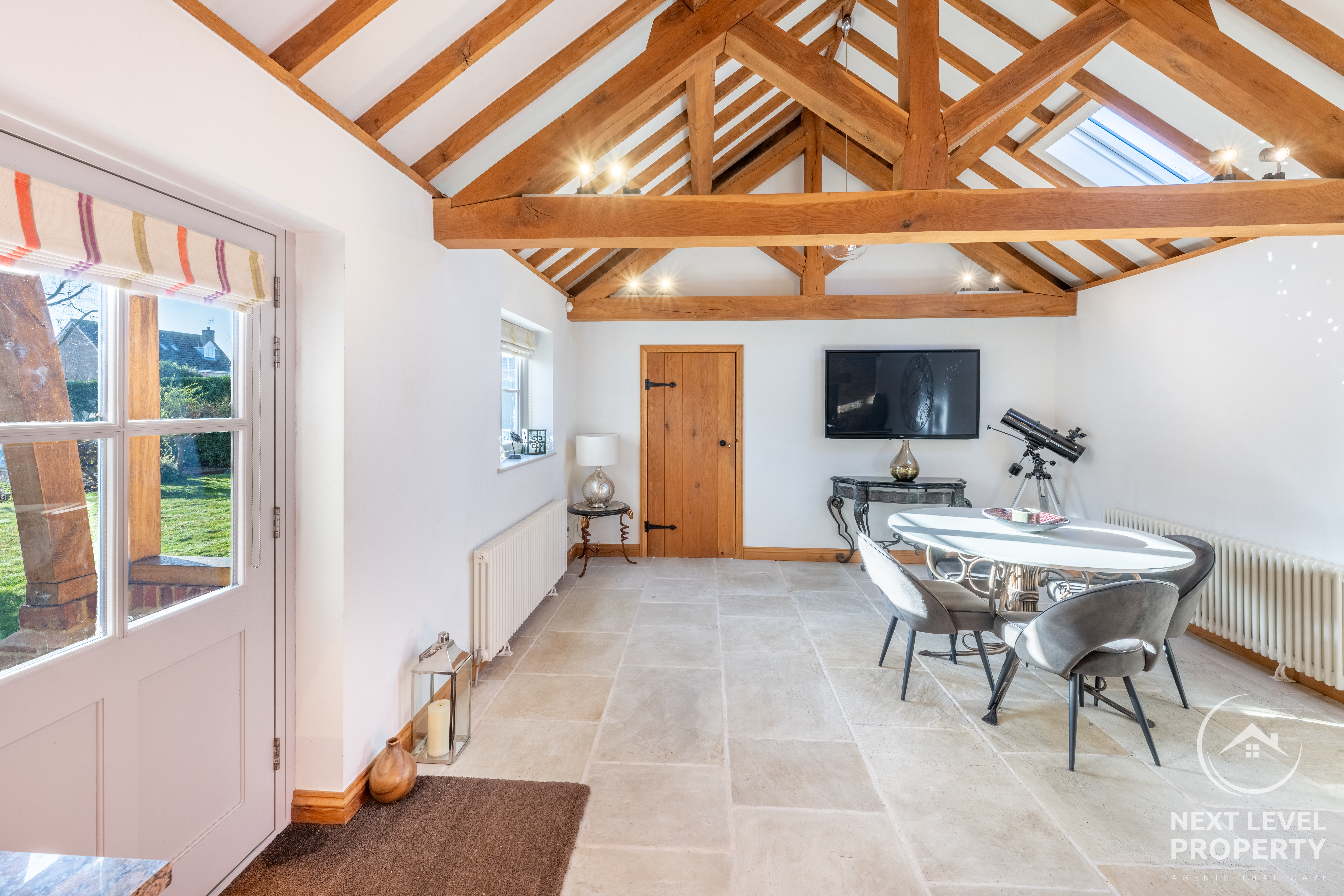 Step through the oak porch and the kitchen/diner opens up like a warm welcome — vaulted ceilings lifting your gaze, exposed beams grounding you in its history. The bespoke shaker kitchen, the granite-topped island, the soft rhythm of family life unfolding around it… this is a room designed for gatherings that last long after the plates are cleared.