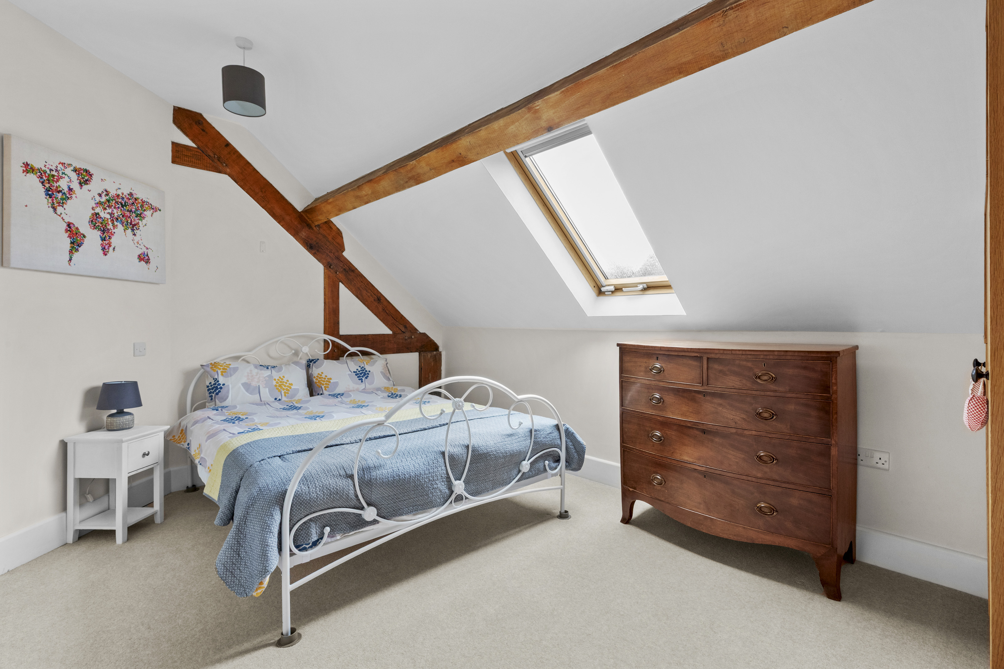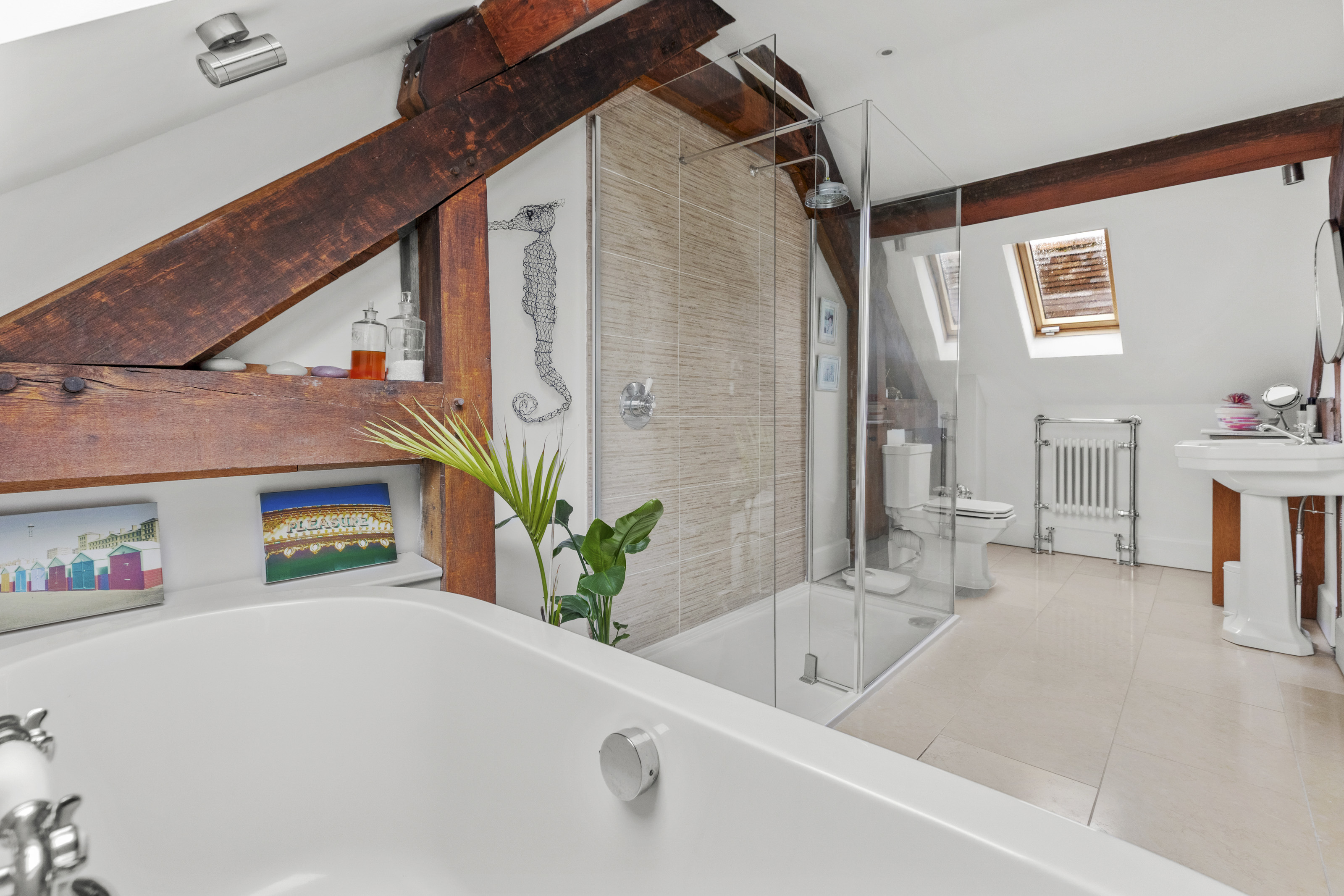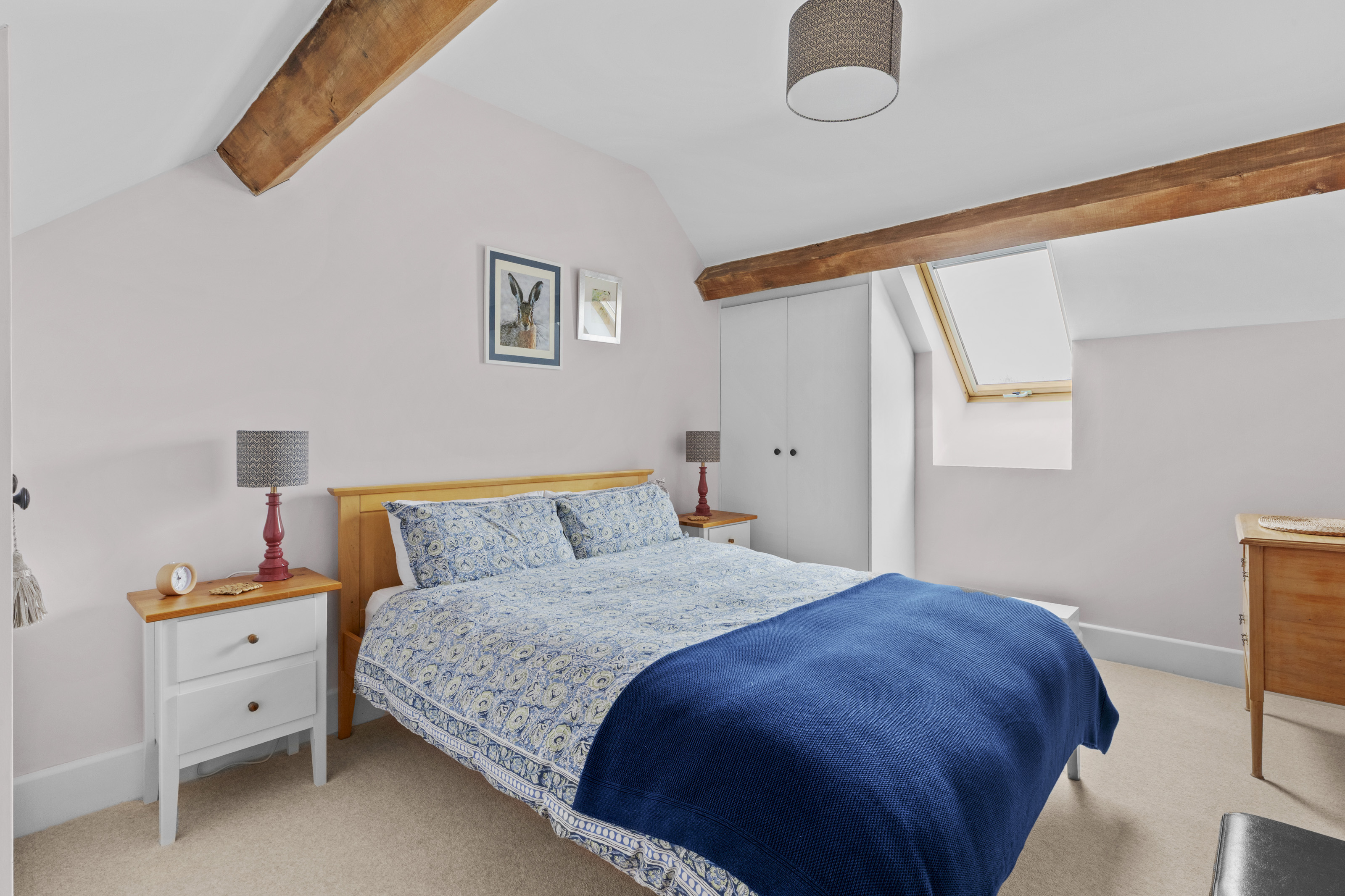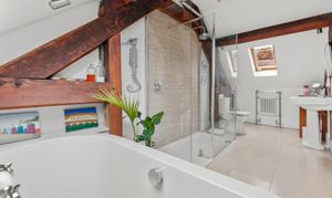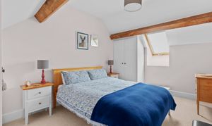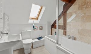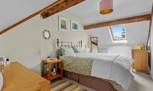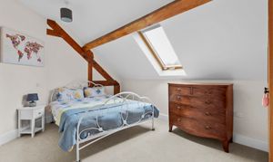 A bespoke oak staircase rises to a spacious first floor, where the property’s contemporary finish is complemented by beautiful exposed beams throughout. The principal suite is particularly impressive, featuring a walk-through dressing area and a luxurious dual-aspect en-suite with a freestanding bath and walk-in double shower. Two further generous double bedrooms, both with fitted wardrobes, are served by a stylish family bathroom fitted with a modern white suite.