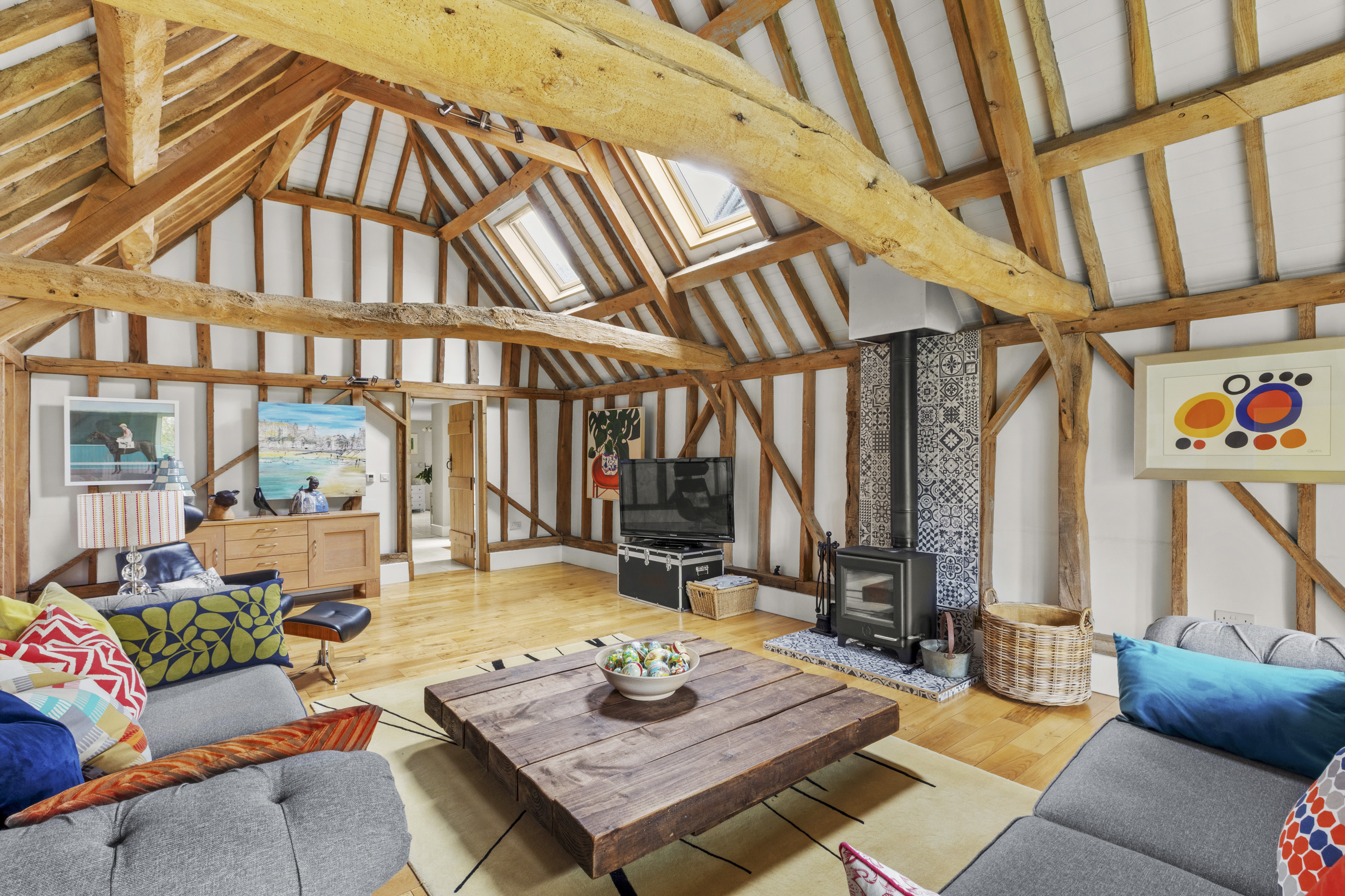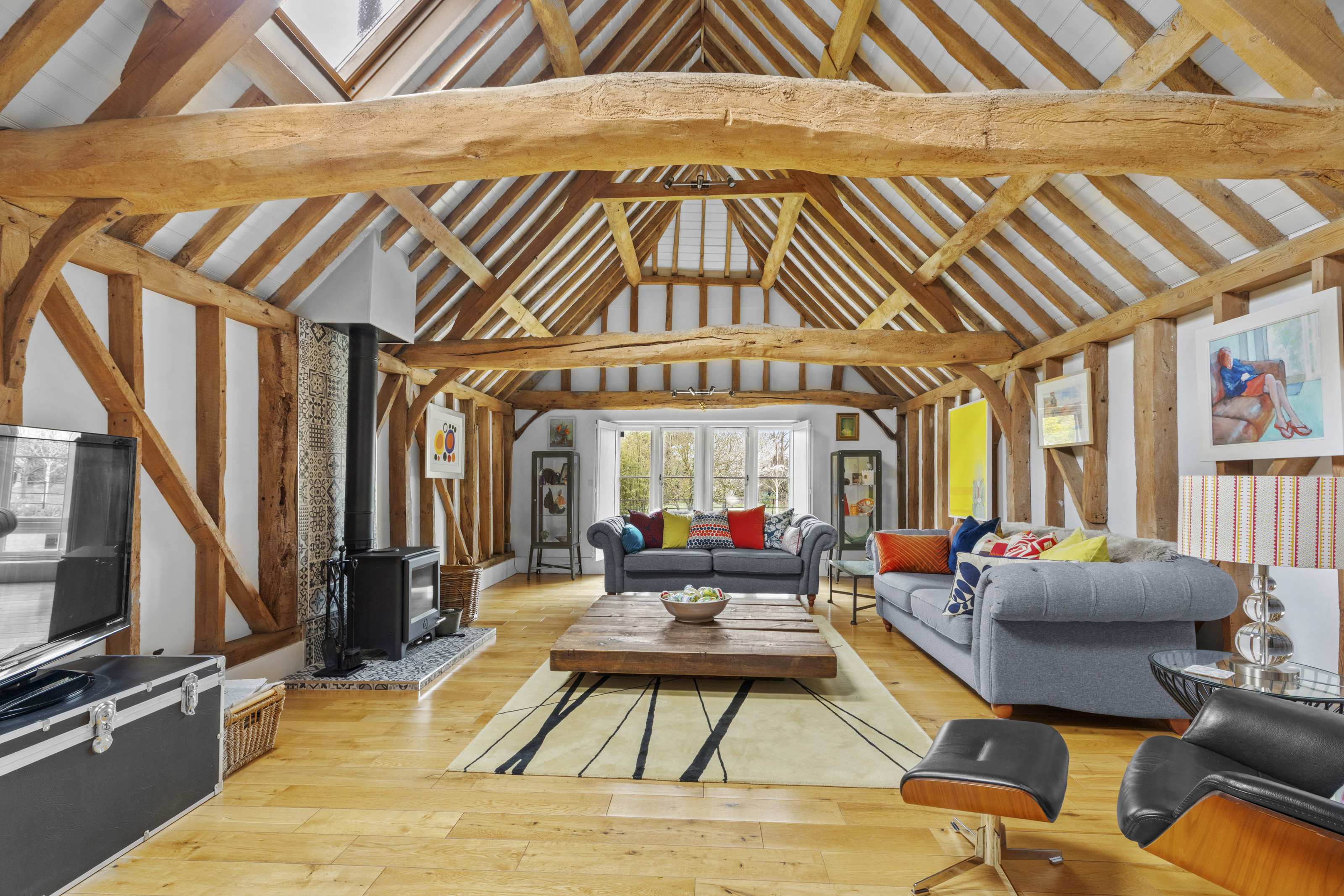- MAGNIFICENT SITTING ROOM WITH VAULTED CEILING, EXPOSED TIMBER BEAMS AND WOOD-BURNING STOVE