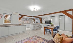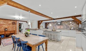 Dorset Down is a truly stunning home, offering an impressive blend of character and contemporary living. At its heart is a magnificent sitting room, featuring a striking vaulted ceiling, exposed timber beams and a charming wood-burning stove, creating a warm yet elegant living space. Equally impressive is the superb kitchen/breakfast room, thoughtfully designed with a central island and breakfast bar, a full range of integrated appliances, granite worktops and stylish stone flooring. This outstanding space effortlessly serves as the hub of the home, with ample room for dining and relaxed family living.