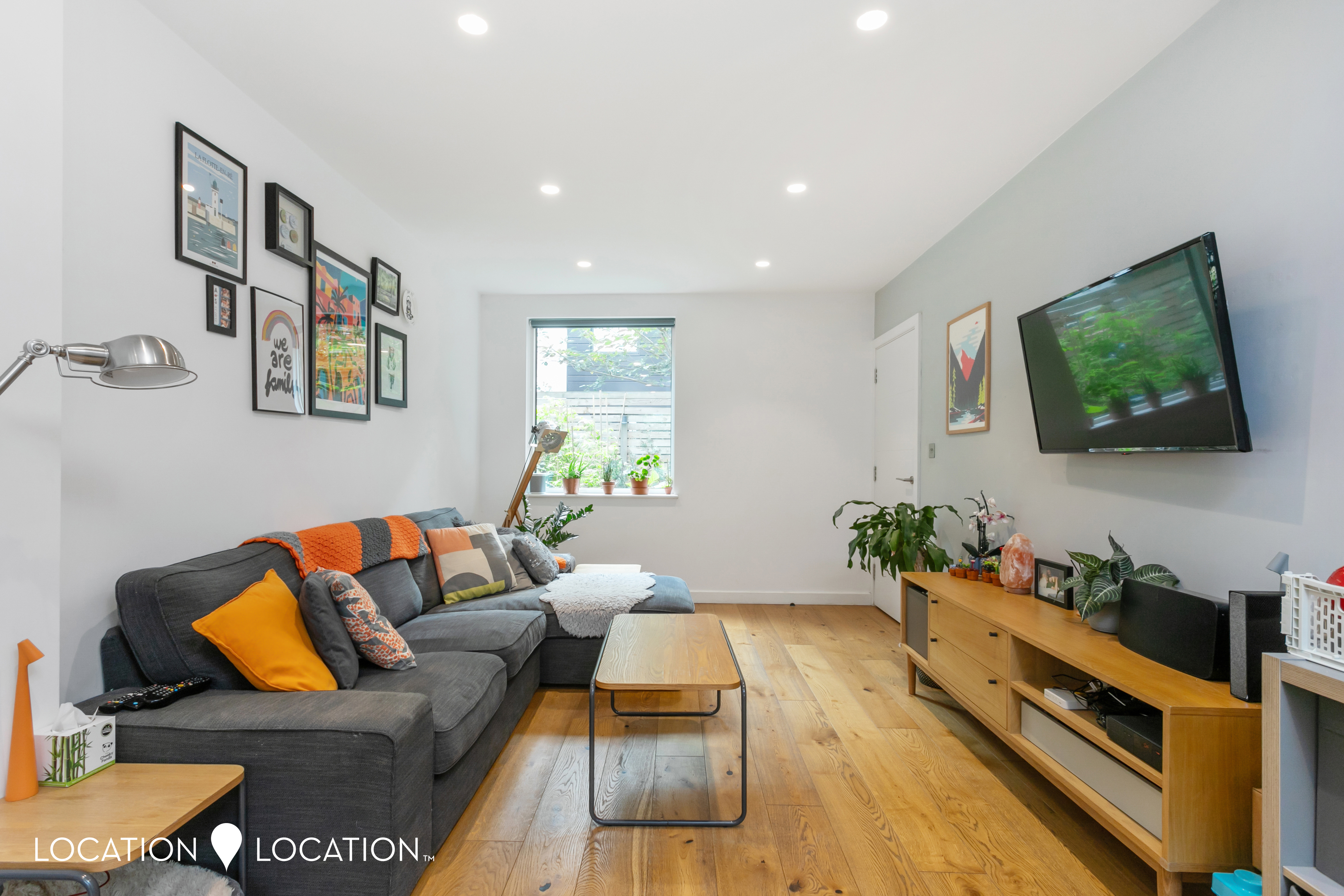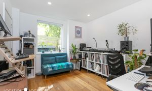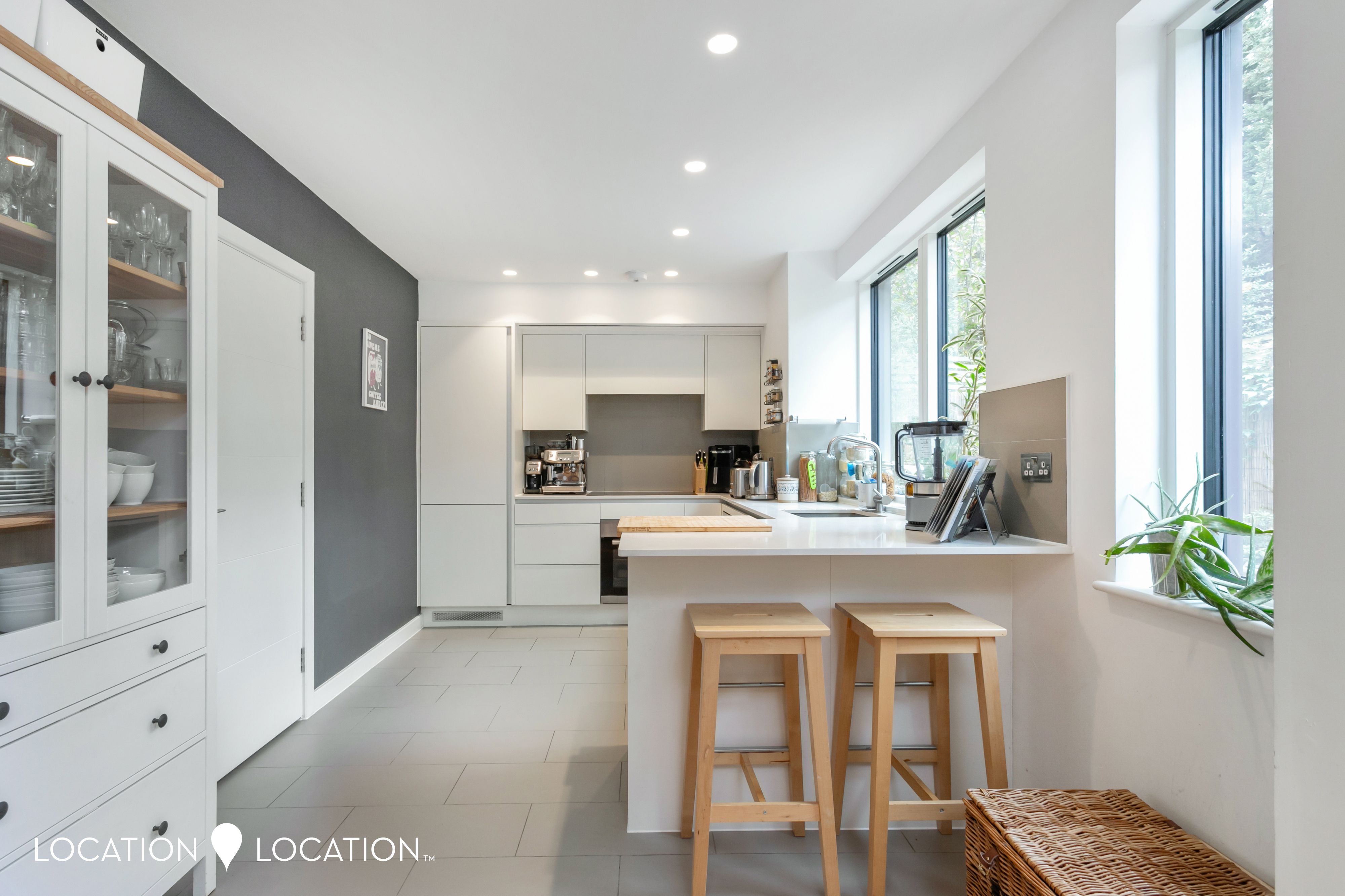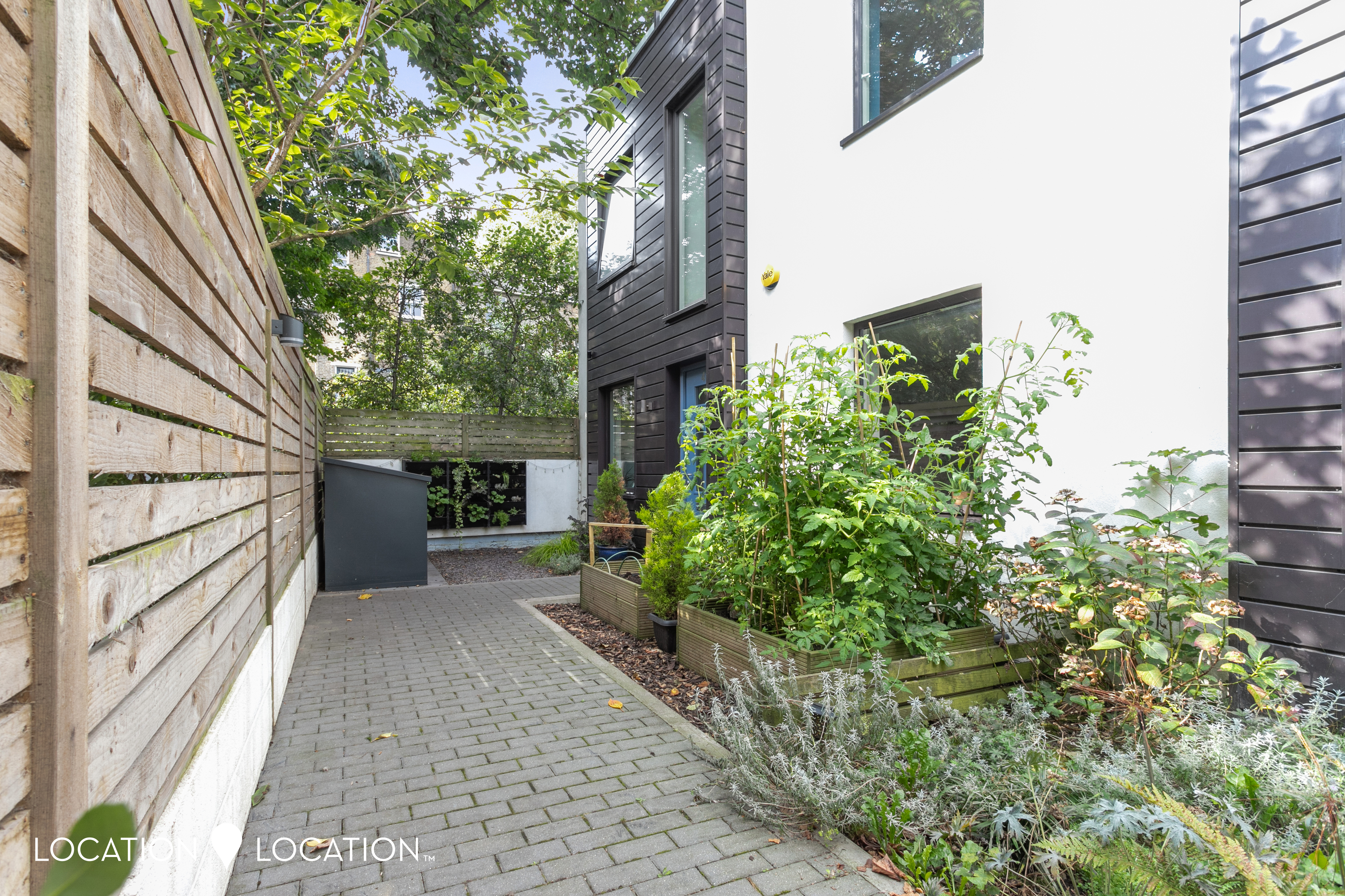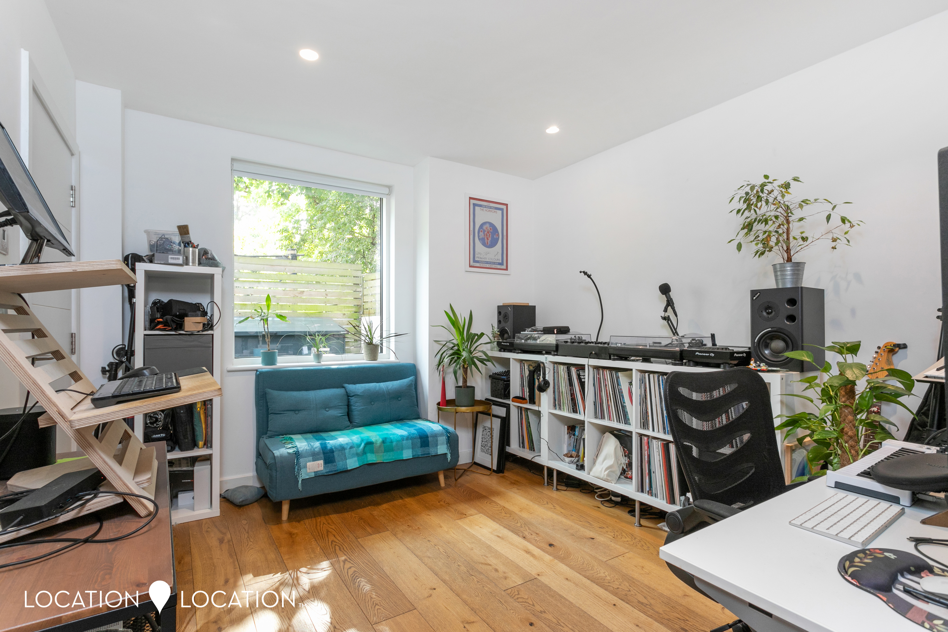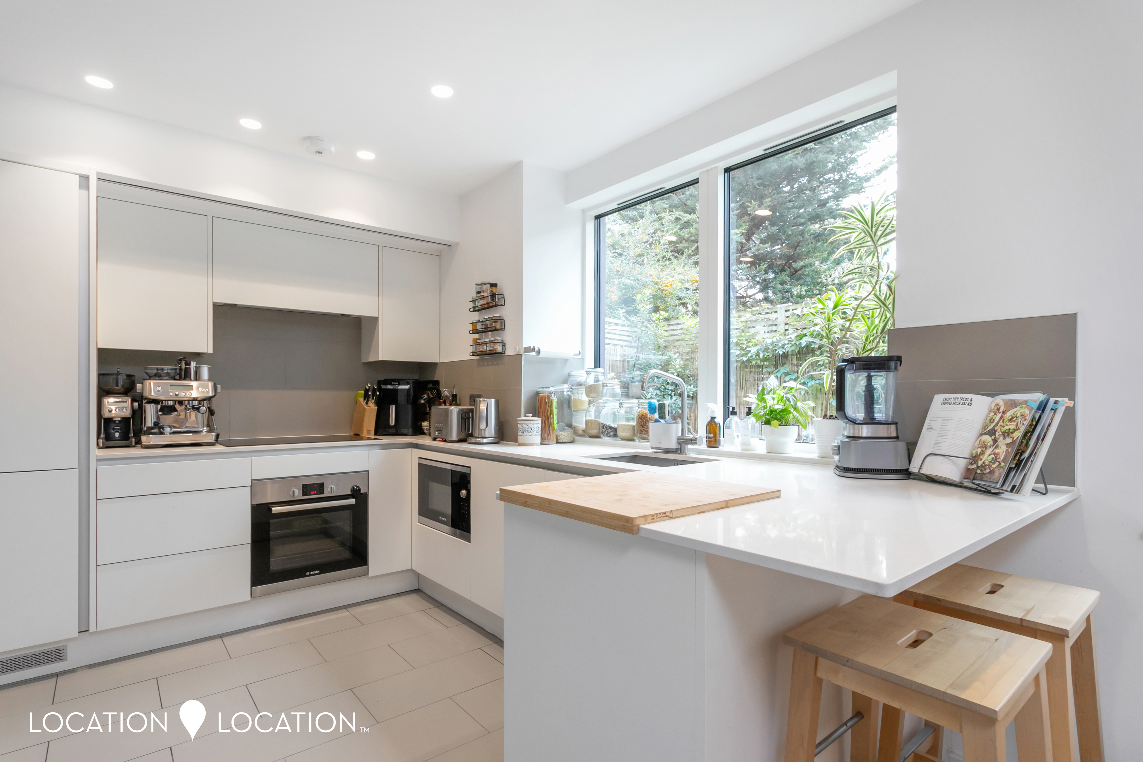 Comprising of a spacious open plan lounge with fully integrated kitchen, complete with breakfast bar. This then leads onto the private garden, semi decked, plenty of natural light and surrounded by leafy views making this a quiet oasis in a vibrant location- together with generous side storage. There is also a ground floor bedroom and bathroom perfect for guests or as a study area.