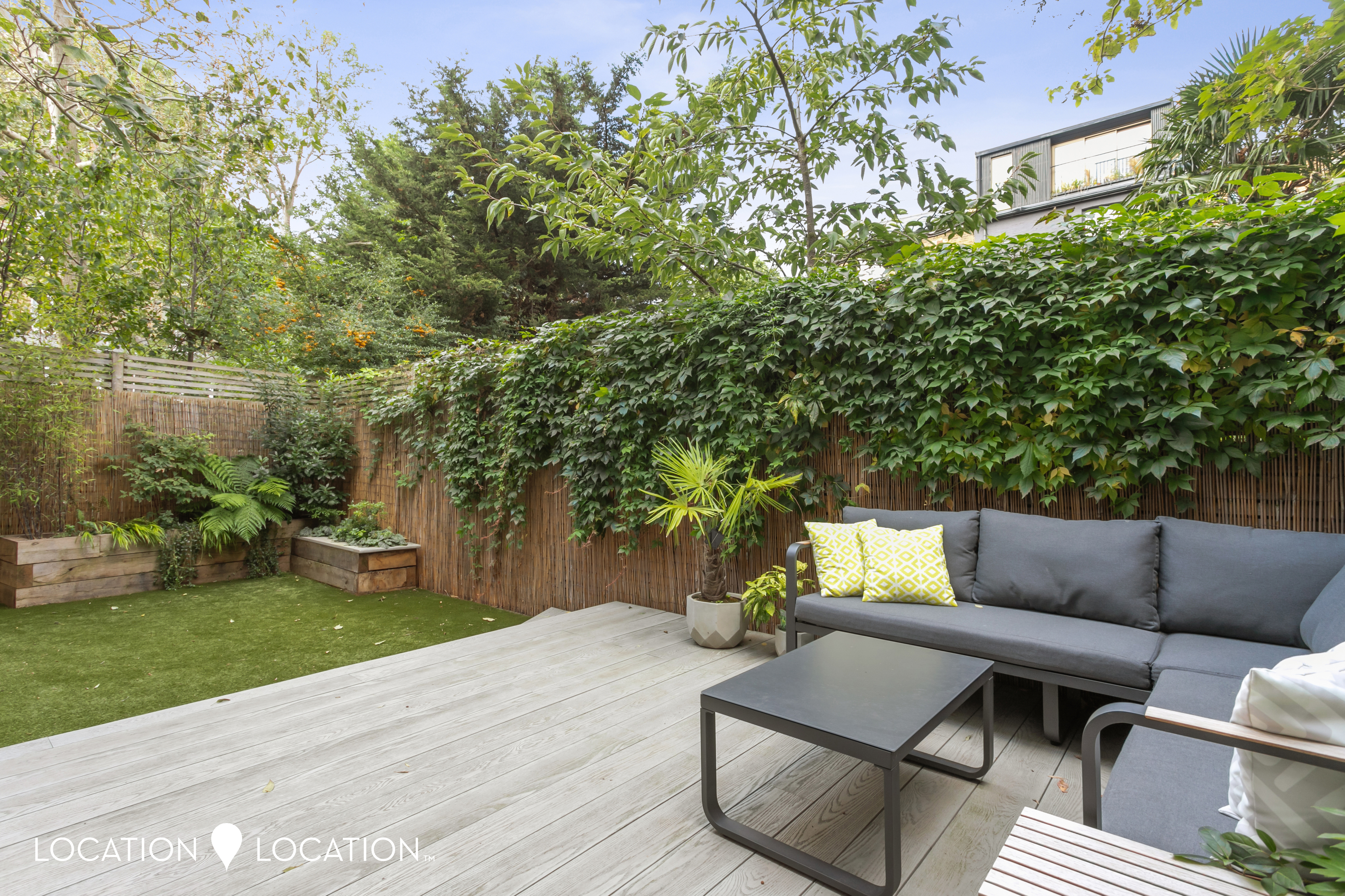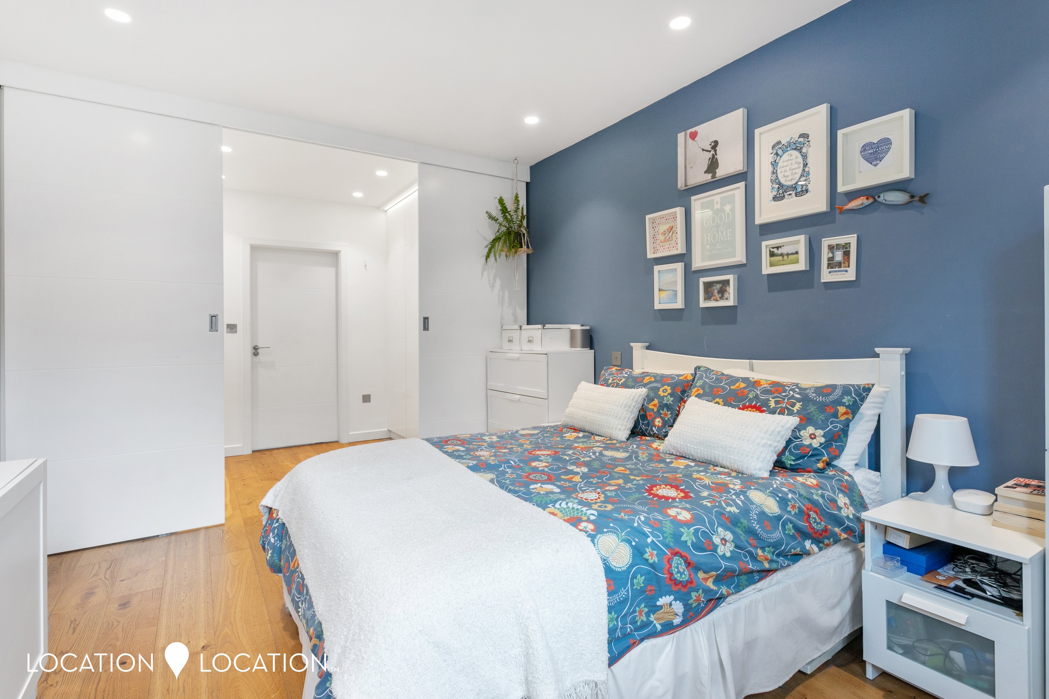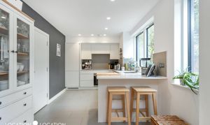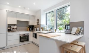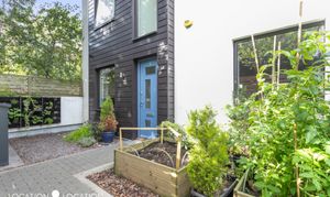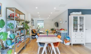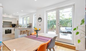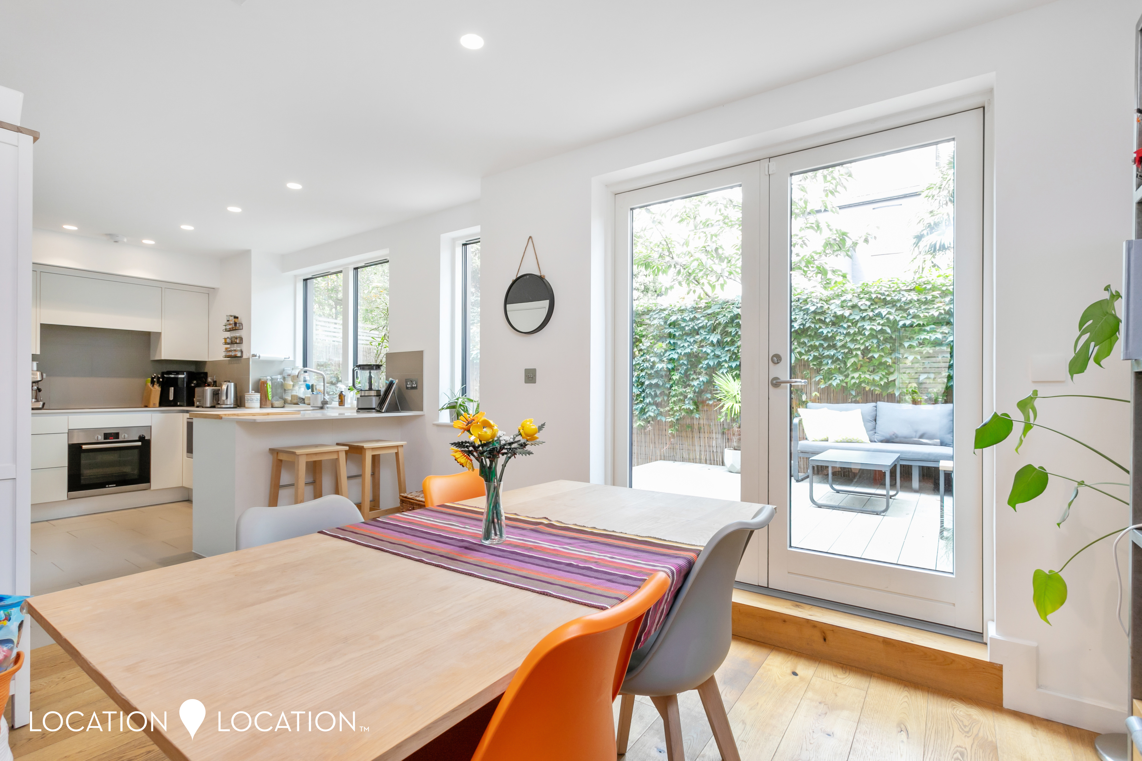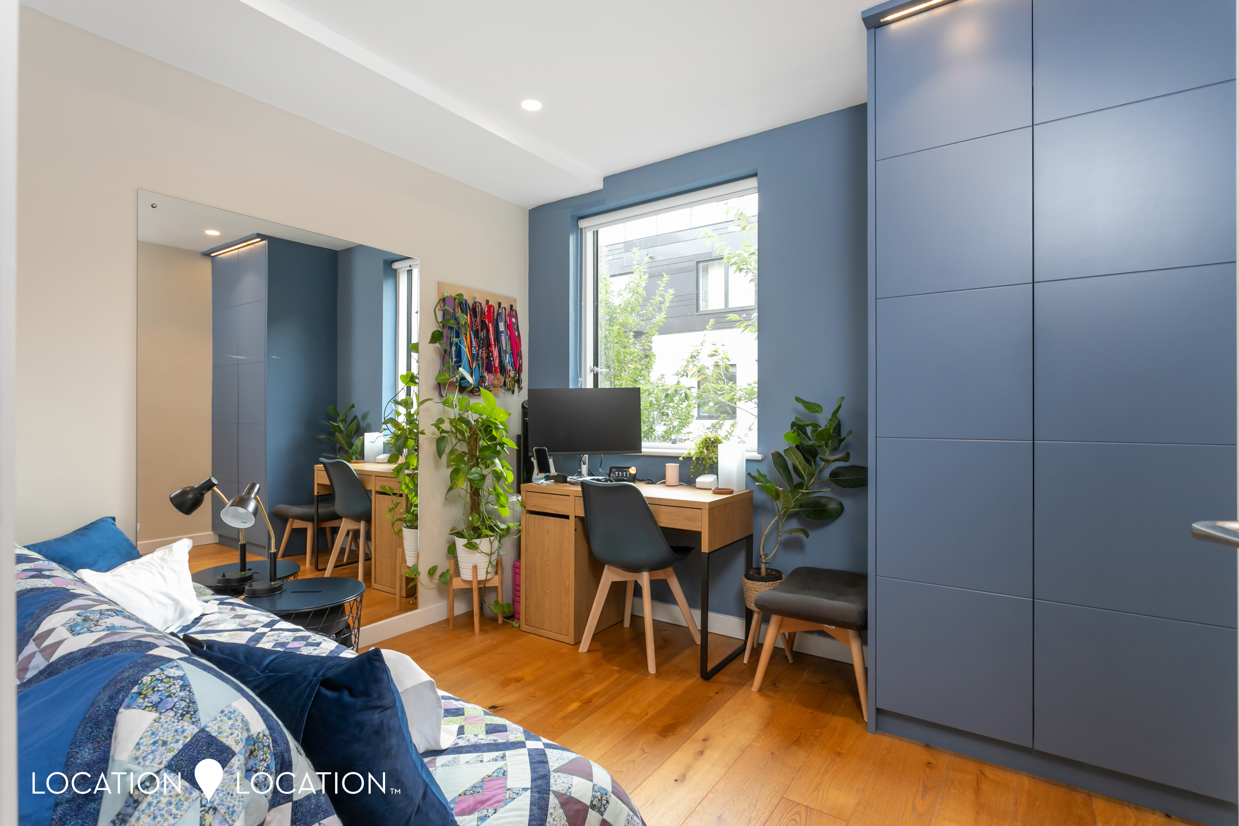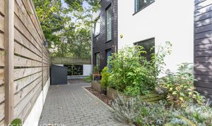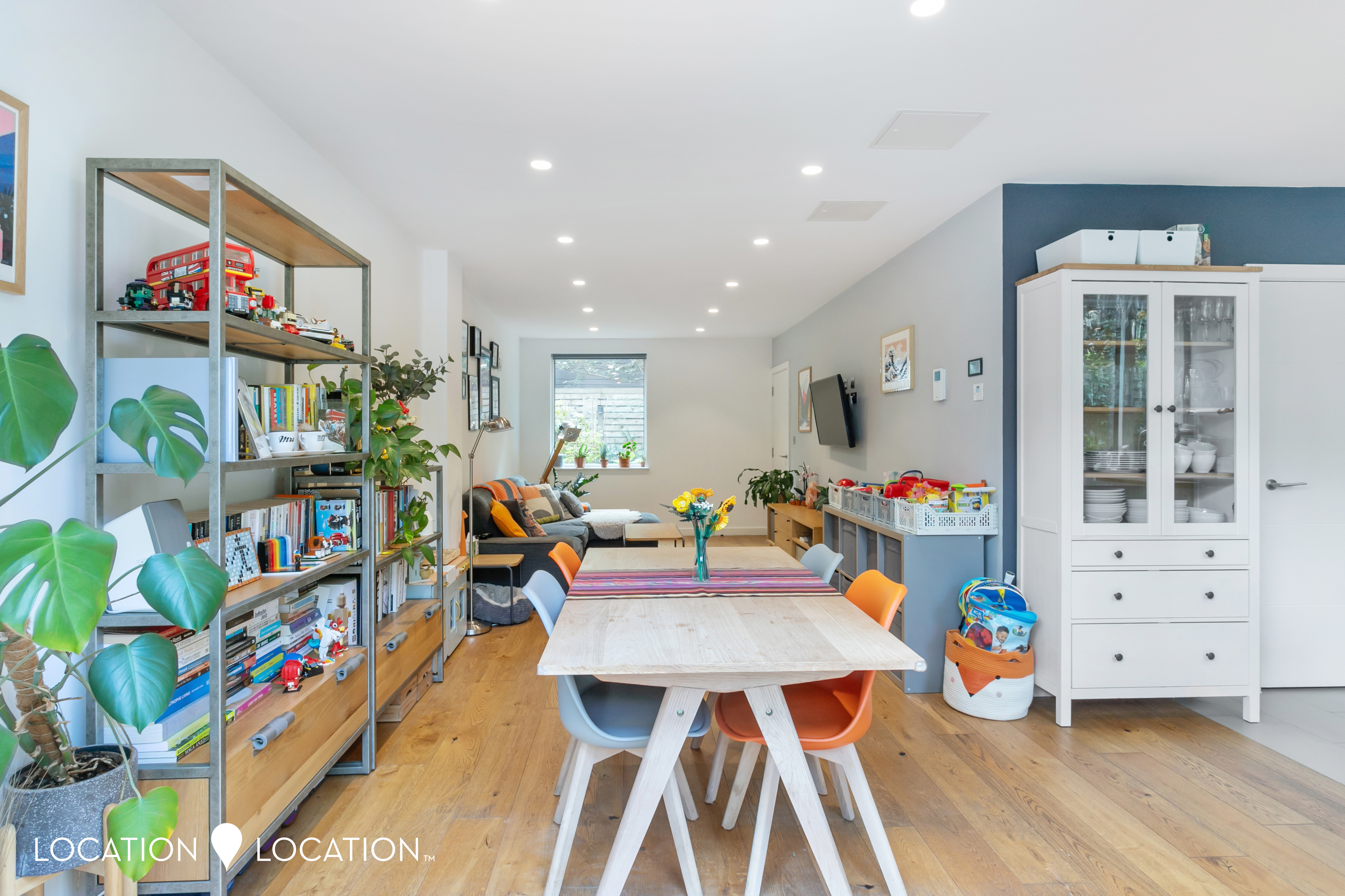 Comprising of a spacious open plan lounge with fully integrated kitchen, complete with breakfast bar. This then leads onto the private garden, semi decked, plenty of natural light and surrounded by leafy views making this a quiet oasis in a vibrant location- together with generous side storage. There is also a ground floor bedroom and bathroom perfect for guests or as a study area.