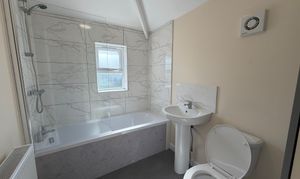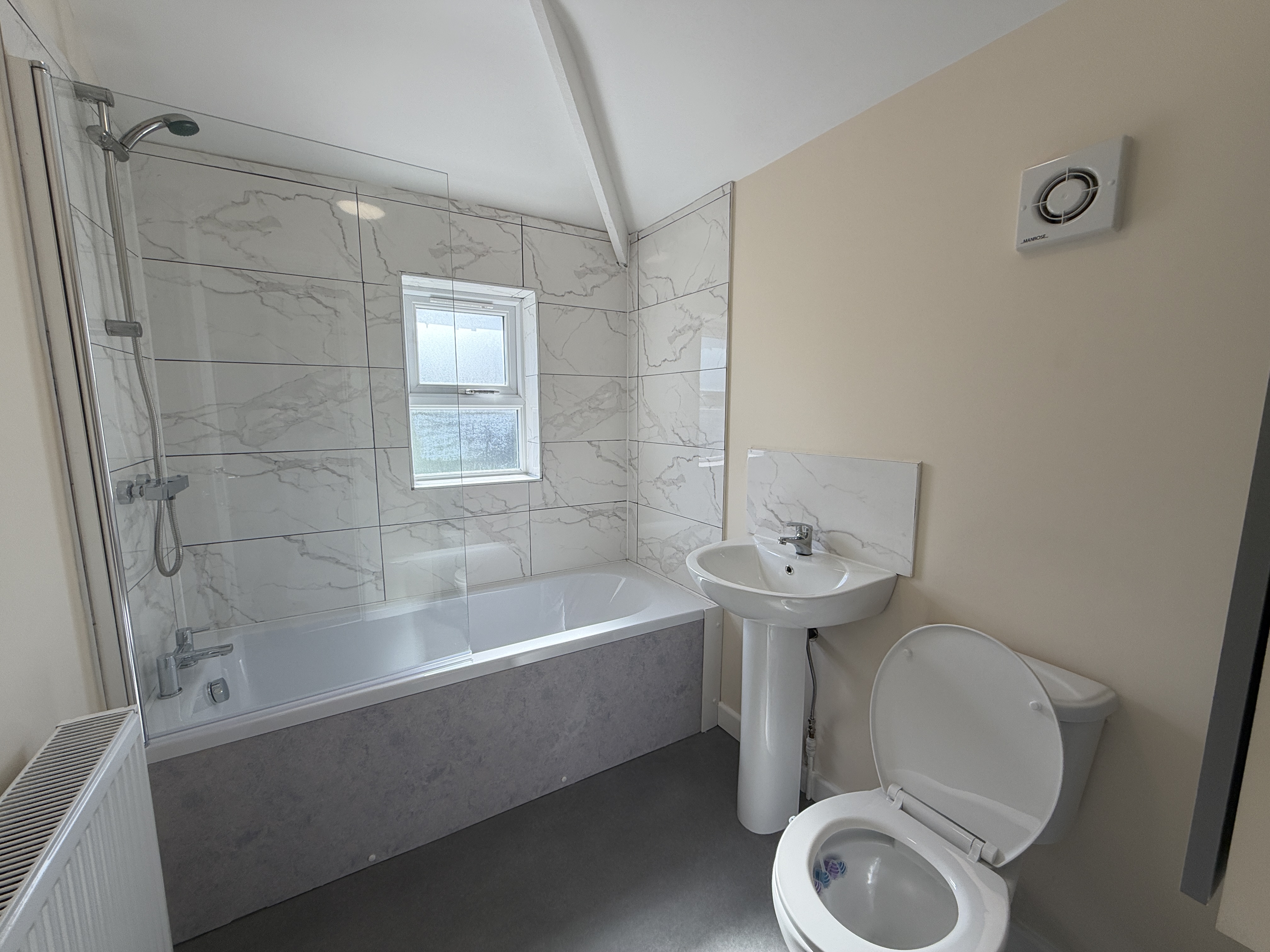 fitted bathroom with shower, wash hand basin, WC and double glazed window.