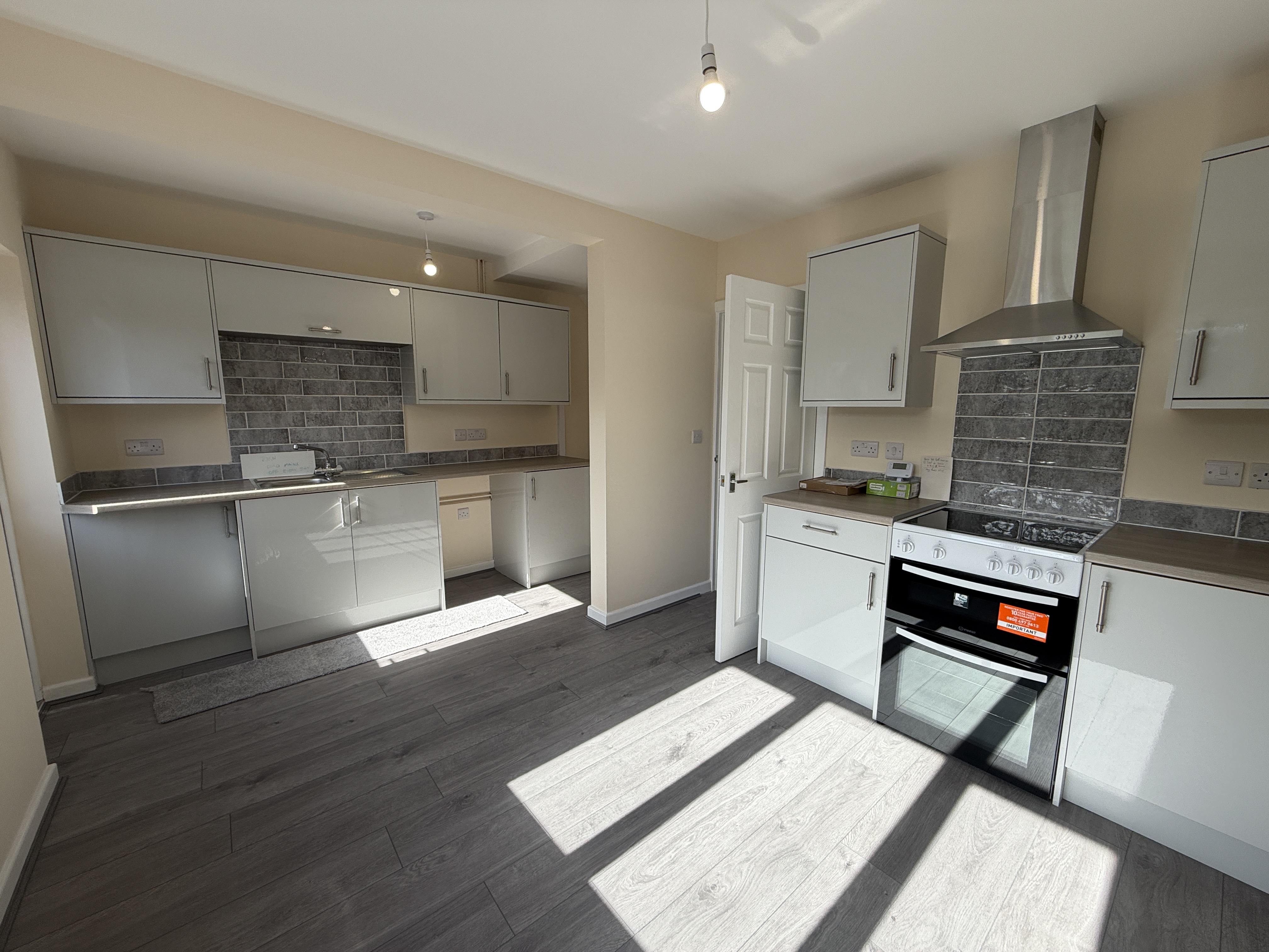 fitted kitchen with range of base and wall cupboards, work surfaces, oven and hob and double glazed window