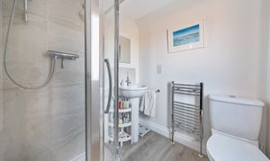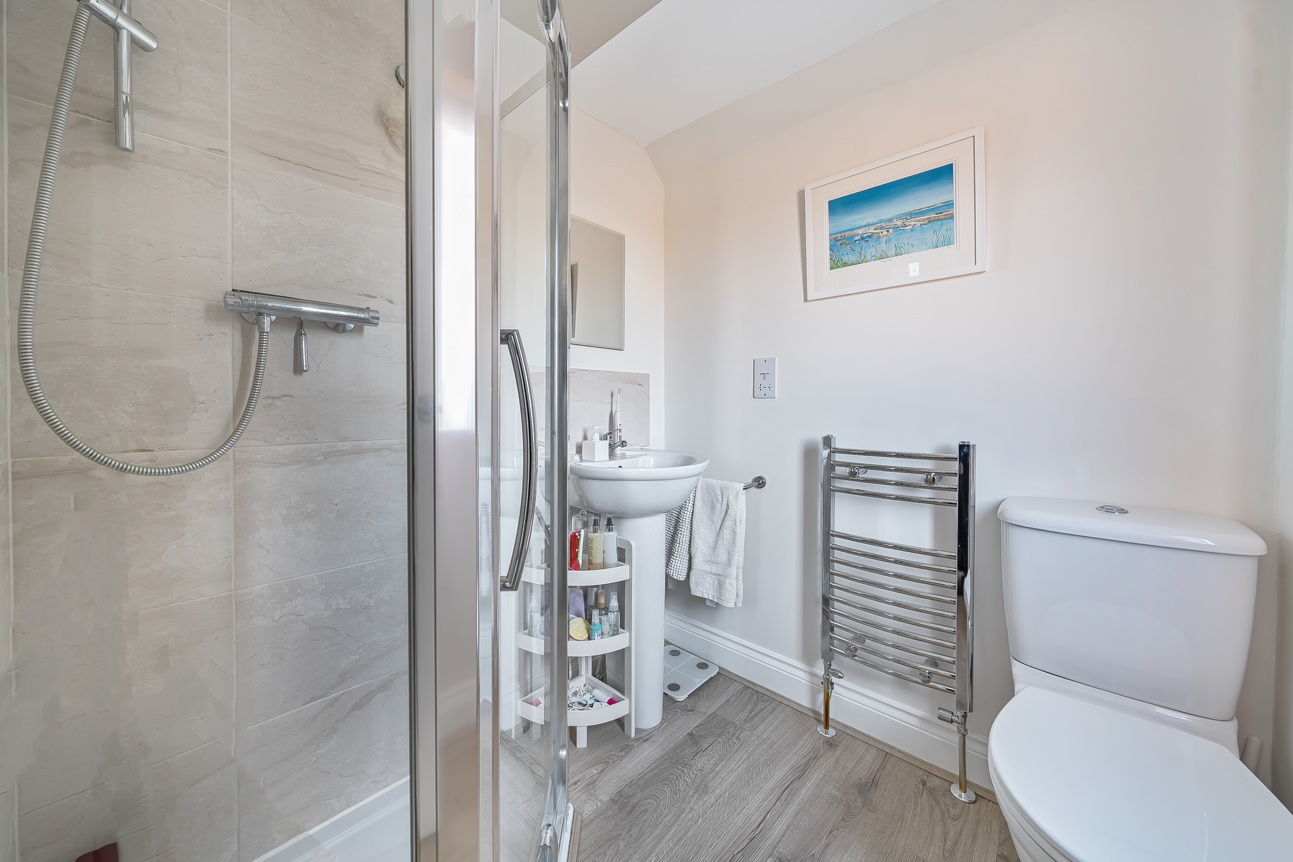 The first floor offers three bedrooms and a modern family bathroom suite with over-bath shower. The main bedroom has a well-appointed fitted en-suite shower room and built in wardrobes.
