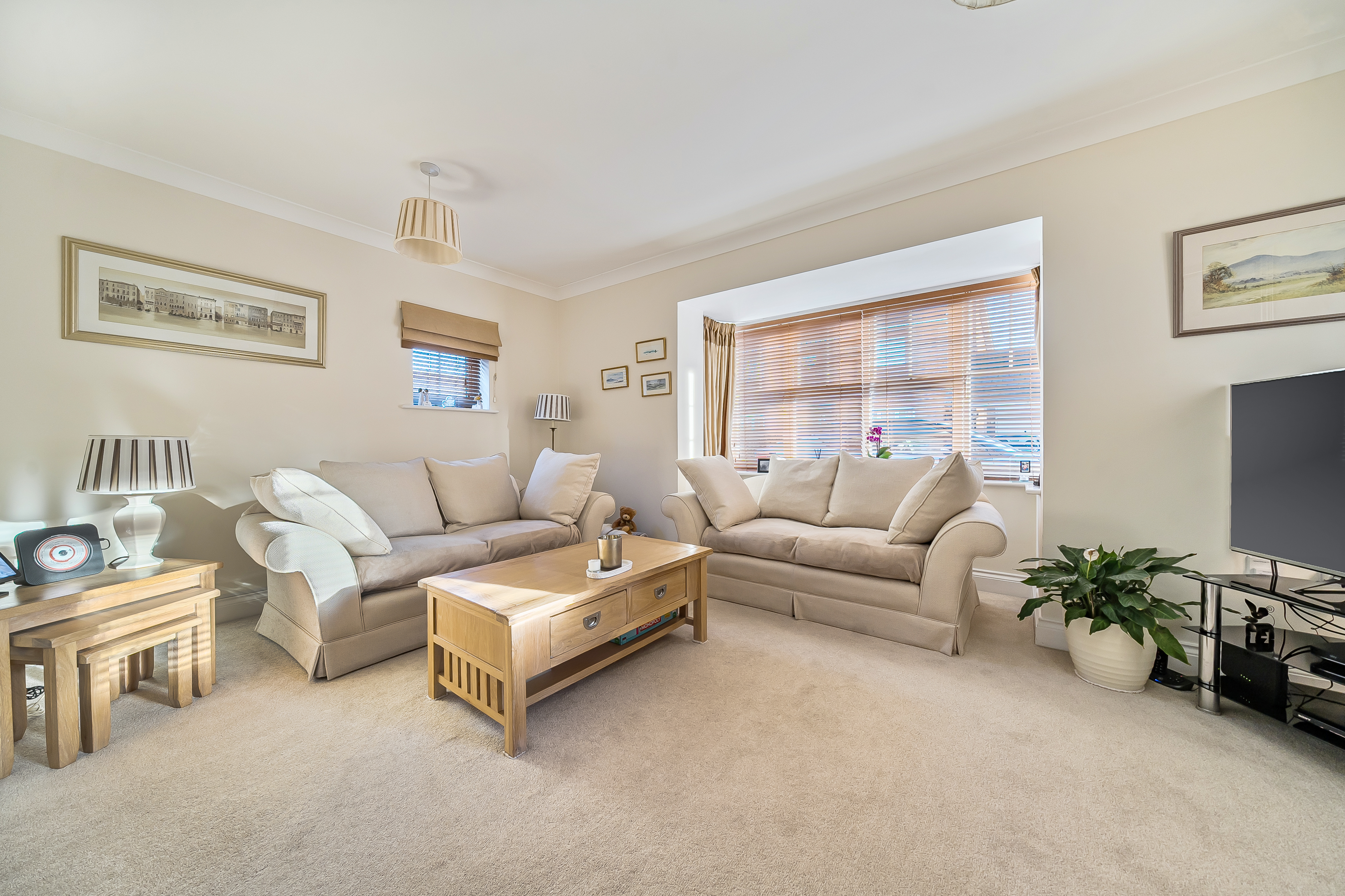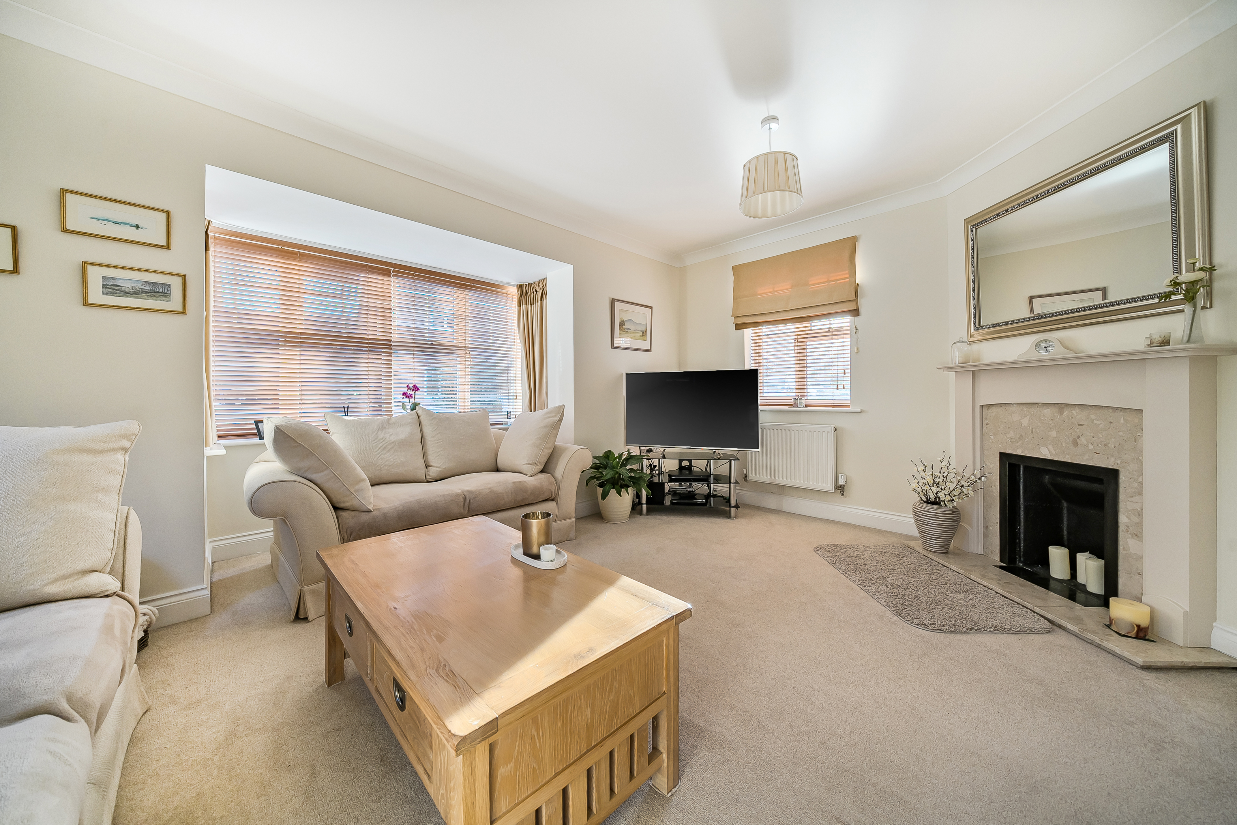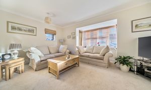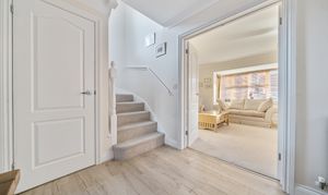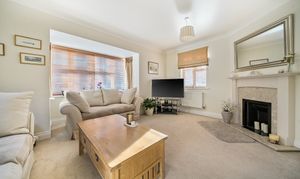 You are welcomed into a spacious hallway with a cloakroom and useful under-stairs storage. Double doors lead through into the generous light-filled living room with bay window and an attractive feature fireplace.