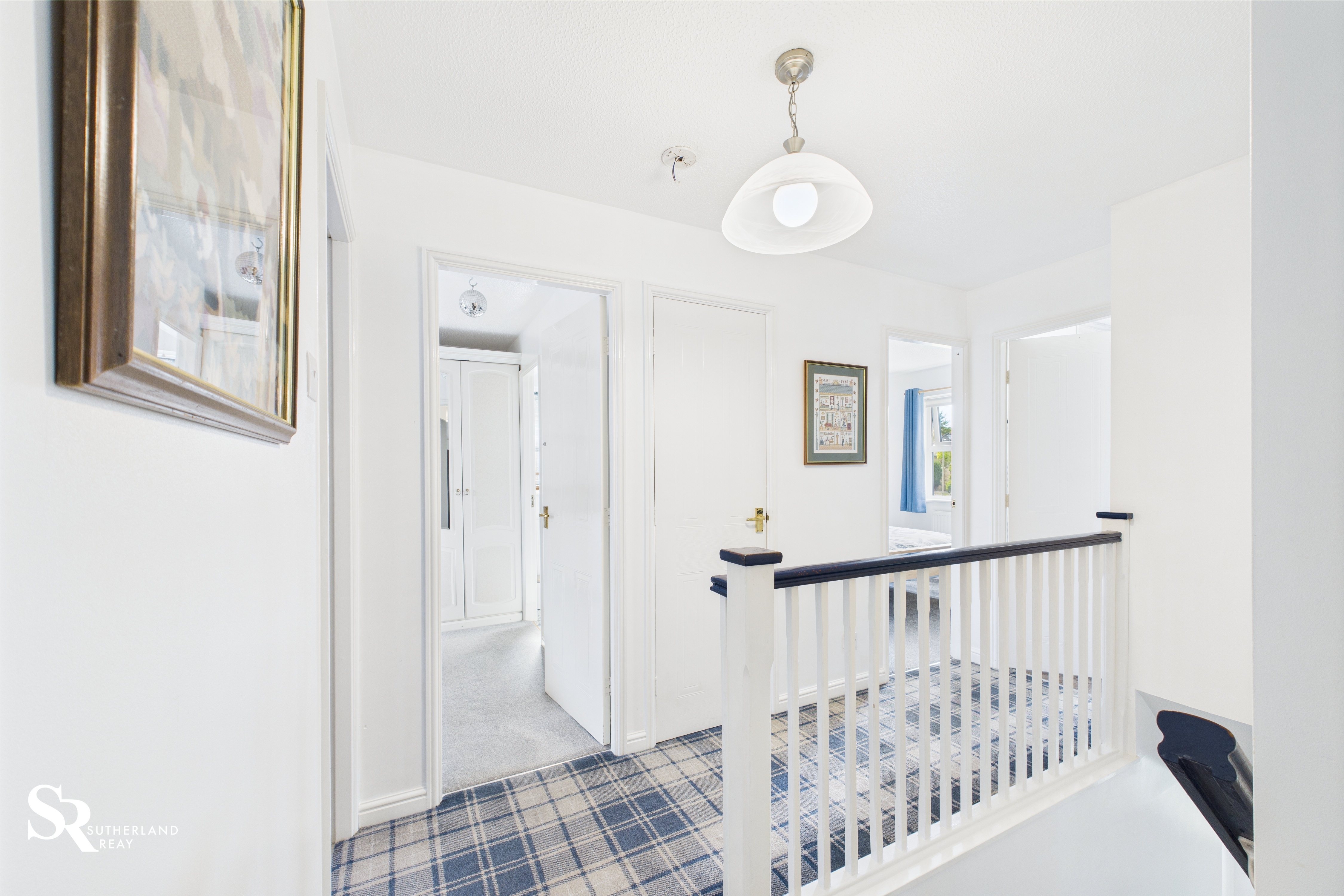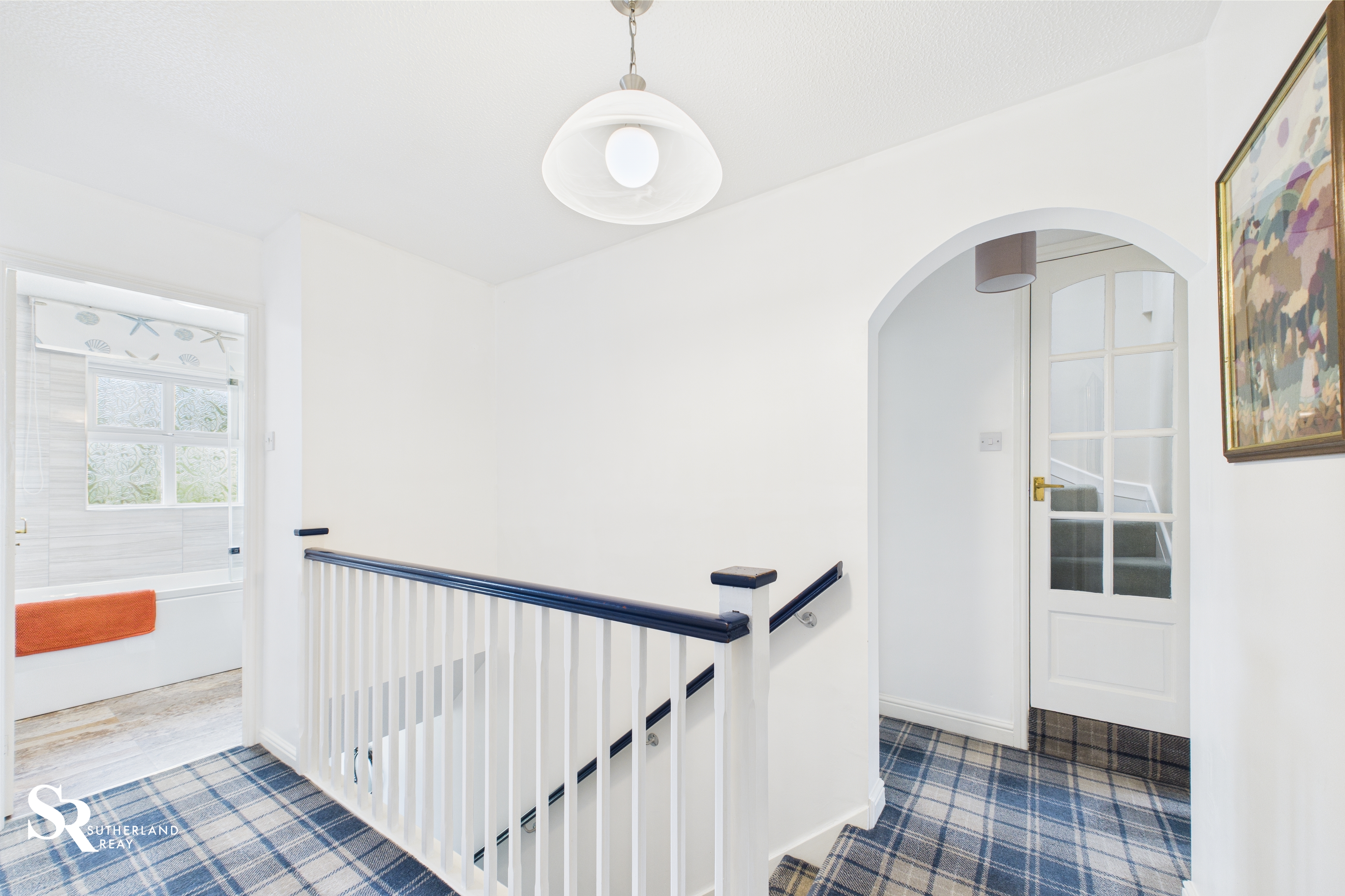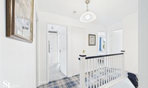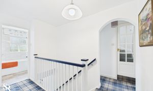 A spacious landing area, carpeted and featuring charming white-painted wooden balustrades. A useful built-in cupboard provides storage, and a cottage pane door leads to the carpeted stairs ascending to the loft room.
