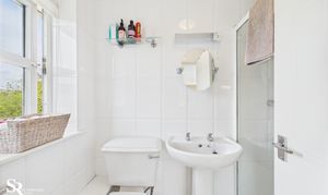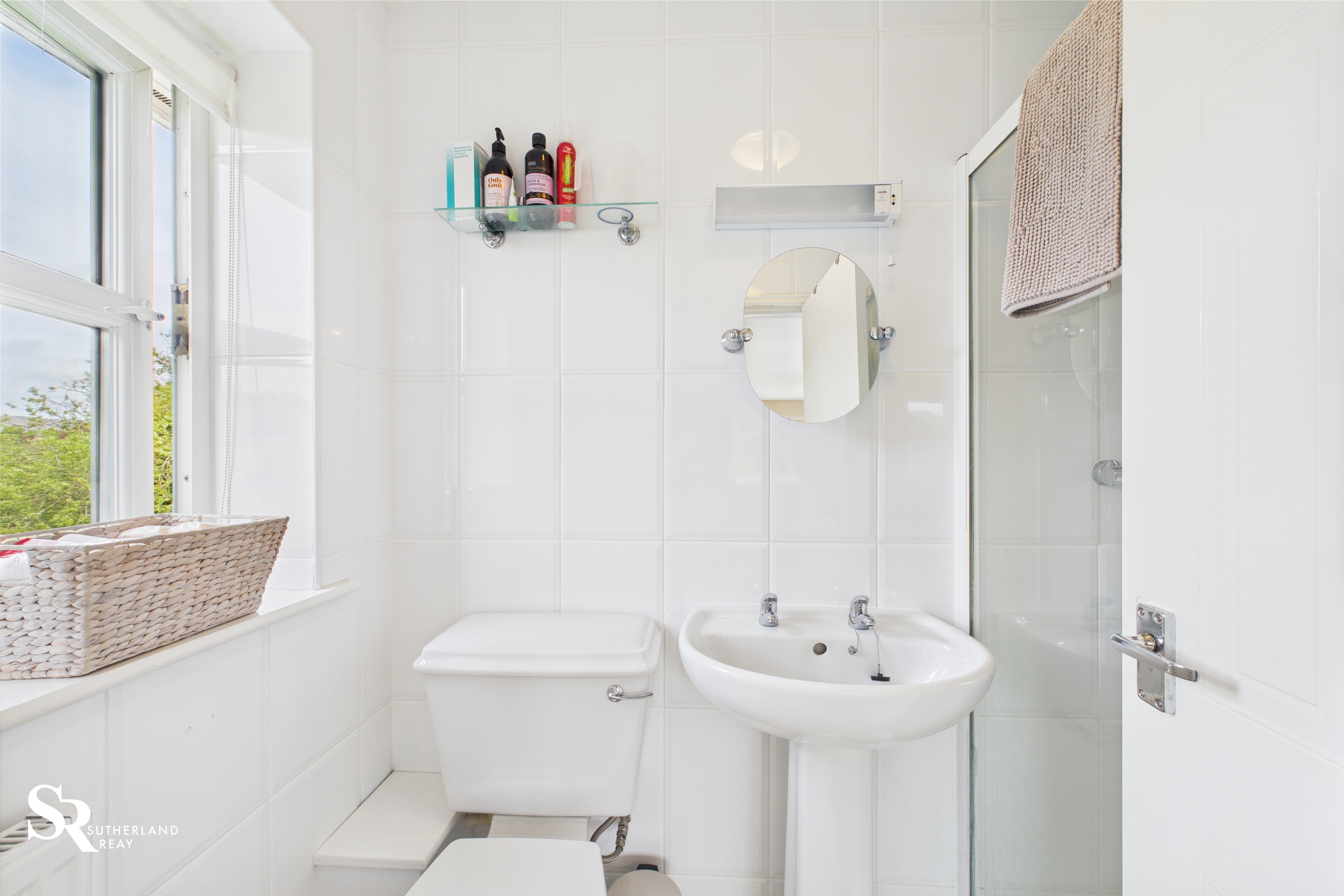 En-suite shower room, fully tiled with a shower enclosure featuring a shower glass door. Side aspect uPVC window.