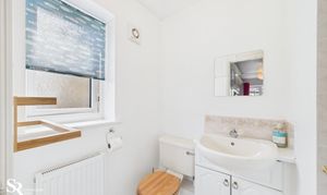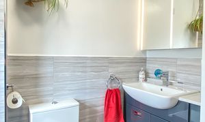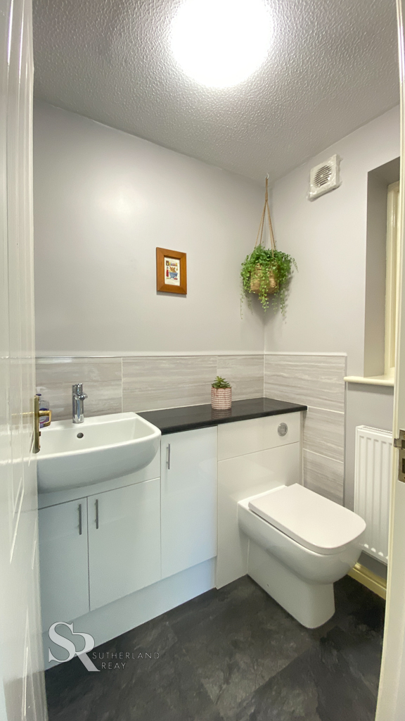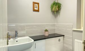 The downstairs WC features practical Karndean tile flooring and a built-in vanity unit. A clever design touch is the repurposed window frame, now serving as a unique and practical mirror.