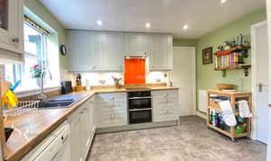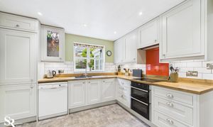Featuring a rear aspect uPVC window, this smart kitchen, installed by Buxton Wood Works in 2022, boasts luxury vinyl tile flooring and offers ample storage with a range of wall and base units. Modern wood-like countertops are complemented by a classic subway tile splashback, with space provided for an under-counter appliance. Integrated appliances include a Neff fridge, Neff double under-counter oven and grill, Neff induction hob, and extractor hood. A built-in under-stair storage cupboard provides additional storage.