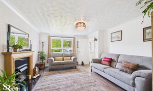 A bright and welcoming reception room boasting a large front aspect uPVC window. Finished with stylish and practical luxury vinyl tile flooring, the room features a striking wallpapered accent wall that beautifully complements the gas fireplace with its elegant black marble hearth and wooden mantel surround.