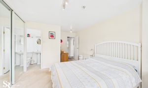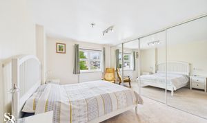 A generously sized en-suite bedroom, featuring carpet flooring and a bright front aspect with the uPVC window. Built-in wardrobes with mirrored sliding doors further enhance the feeling of space.