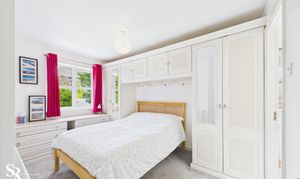 Another double bedroom featuring carpeted flooring and a rear-aspect uPVC window offering a pleasant view of the garden. Benefits from fitted wardrobes and a practical vanity table.