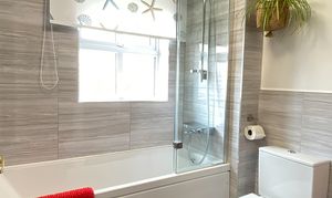 A well-presented bathroom with a front-aspect uPVC window fitted with privacy glass. The suite comprises a shower-bath with a shower screen and a built-in vanity unit. Waterproof panelling has been fitted around the bath and provides a practical splashback to the basin.