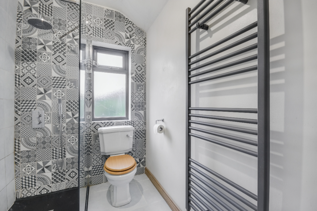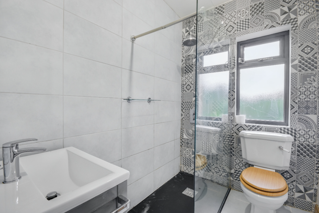 Clean and practical bathroom featuring a shower, toilet and sink. Tiled floors and walls add to the character of this home.