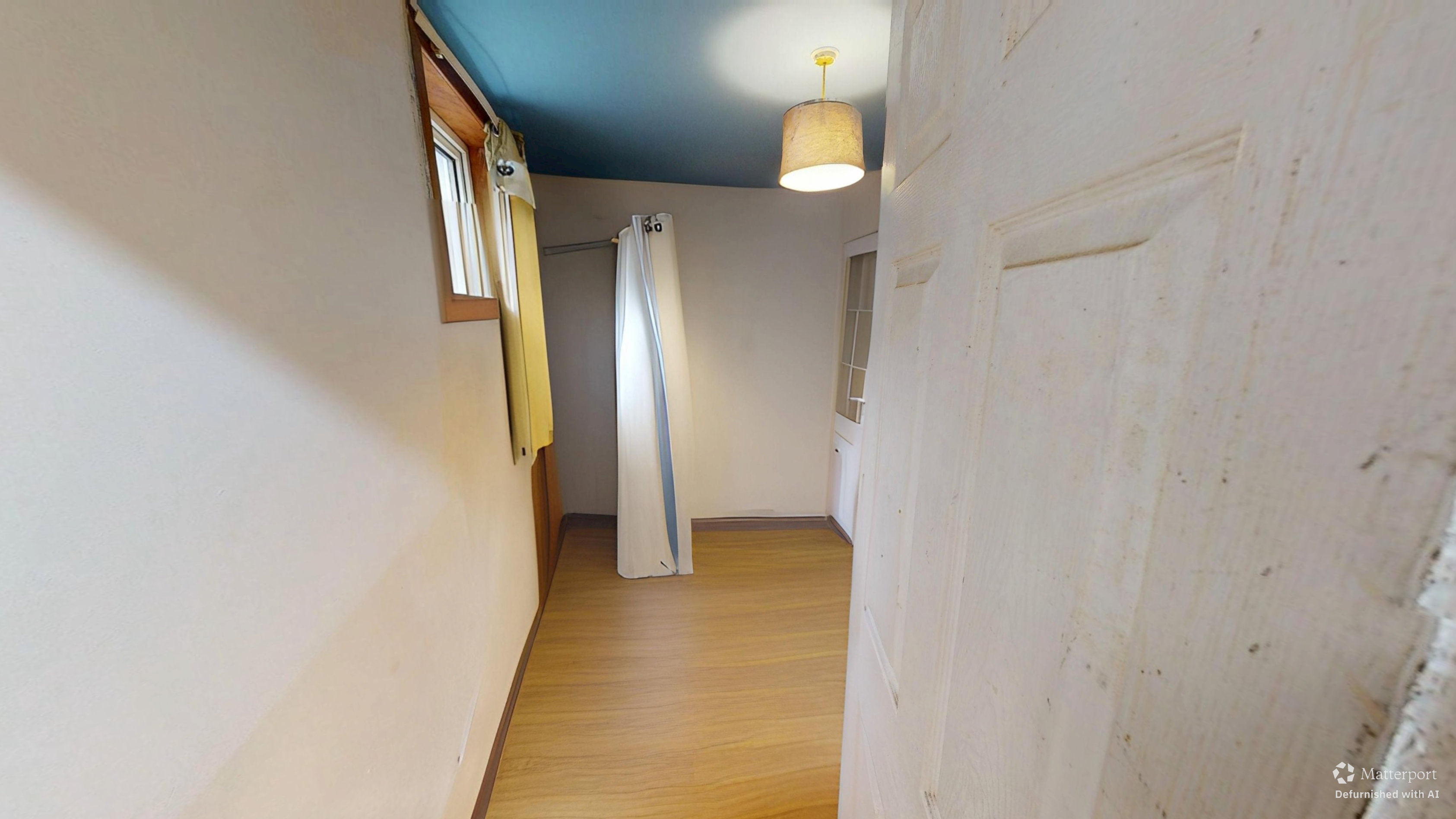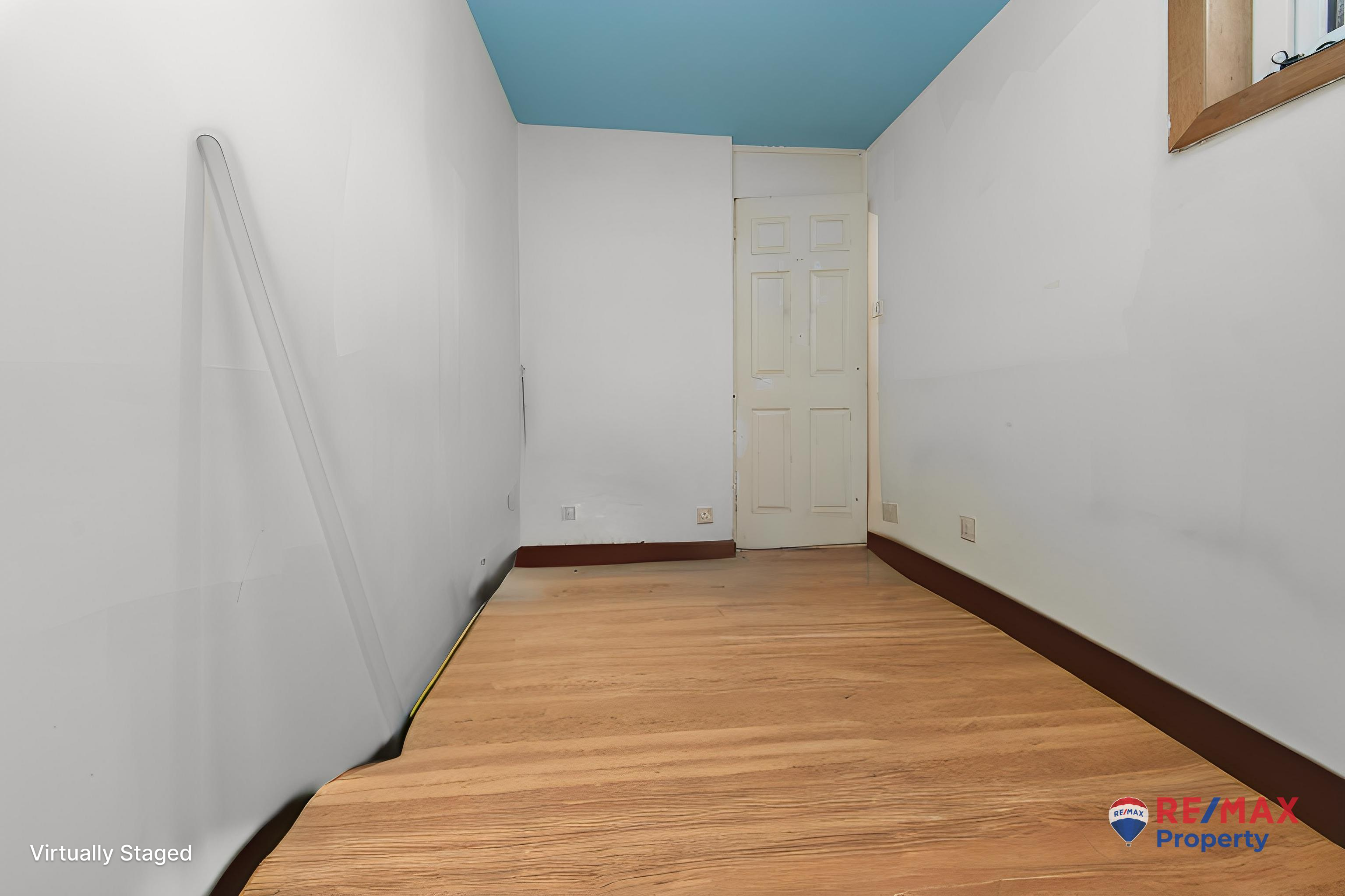 A versatile bedroom with laminate flooring, light fixtures, and electrical outlets. A medium-sized window provides views of the private courtyard, making the room bright and airy, while central heating radiator ensures comfort throughout the year — ideal for a child’s room, guest room, or home office.