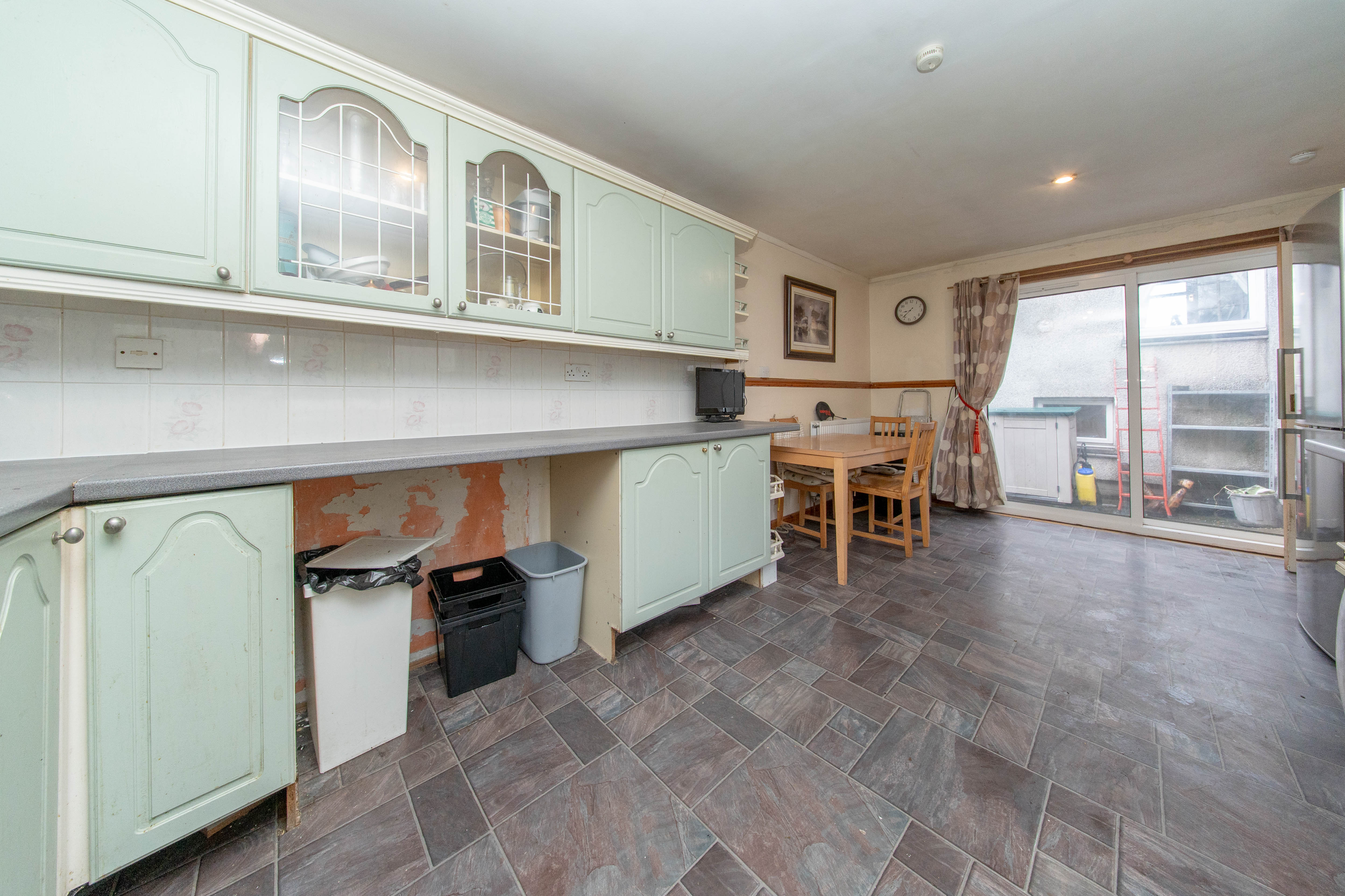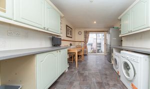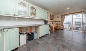A spacious and versatile kitchen/diner offering an ideal setting for family living and entertaining. The room features modern vinyl flooring and an excellent range of wall and base units, providing ample cupboard and storage space. Well-positioned electrical outlets support a variety of appliances, while contemporary light fixtures create a bright and welcoming atmosphere. A central heating radiator ensures comfort throughout the year, and elegant French doors open onto a small private courtyard — perfect for outdoor dining or relaxing in a secluded setting.