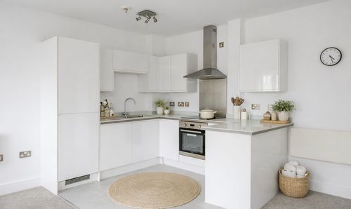 To the rear of the property, the kitchen and dining area is fitted with a range of base and wall units, built-in storage, and space for freestanding appliances. A window above the stainless-steel sink frames uninterrupted views across surrounding farmland. A side door leads out to the delightful, enclosed courtyard with two brick outbuildings and a further gate opening to the garden.