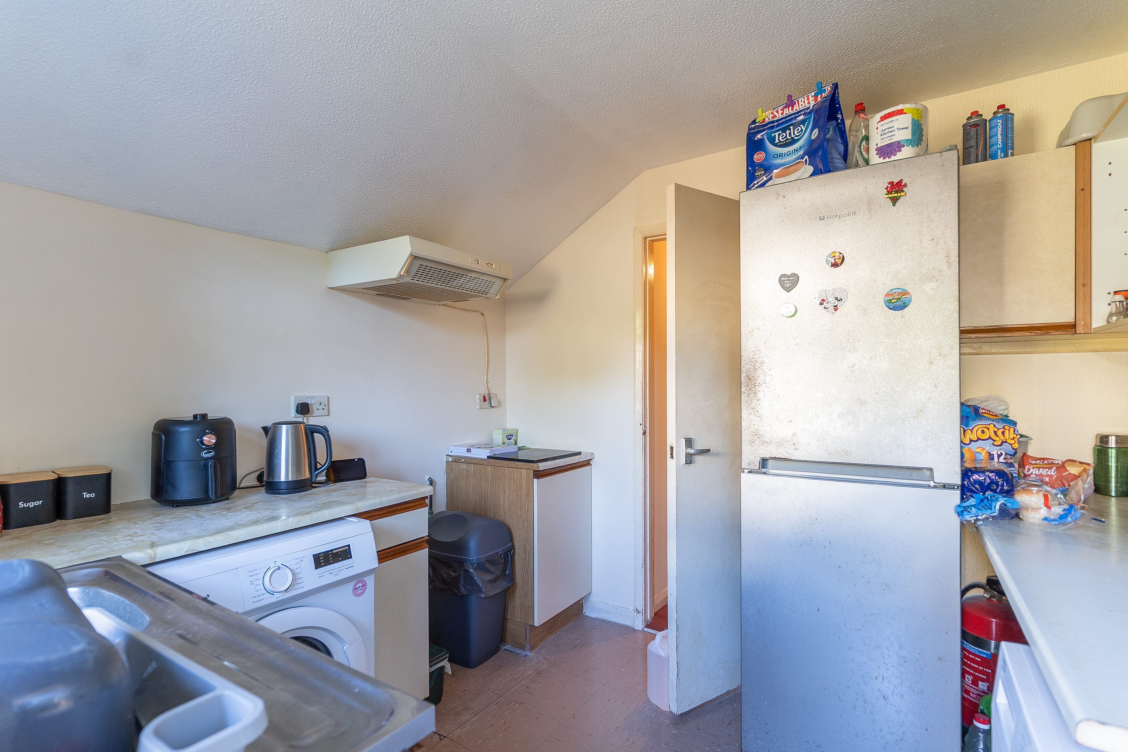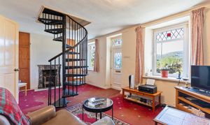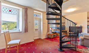 On the ground floor, the property features a welcoming open-plan lounge and dining room. Front-facing windows allow plenty of natural light to flood the space, while a feature fireplace adds warmth and character, creating a cosy yet versatile living area. A striking spiral staircase rises to the first floor, while steps from the lounge lead to a useful hall area providing storage. From here, there is access to a well-proportioned kitchen and a spacious family bathroom.