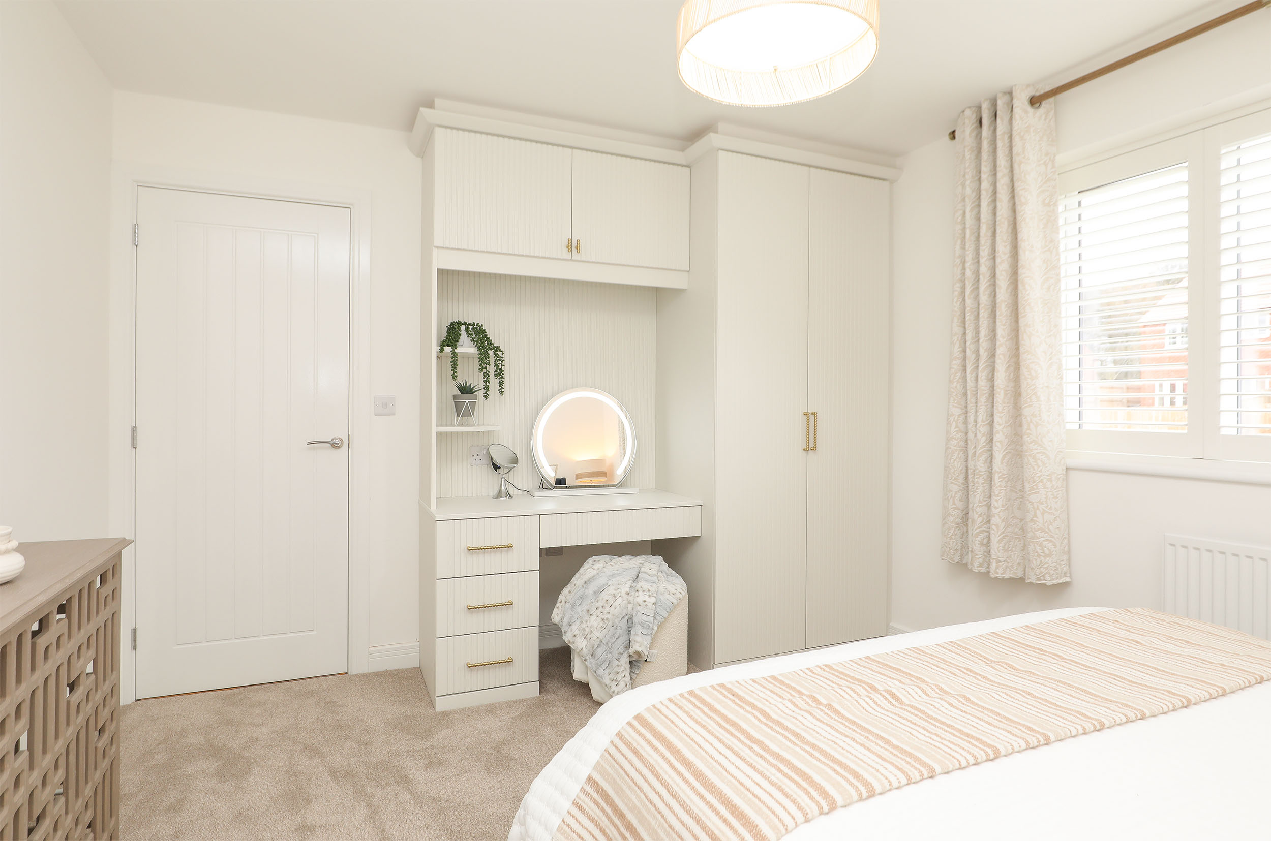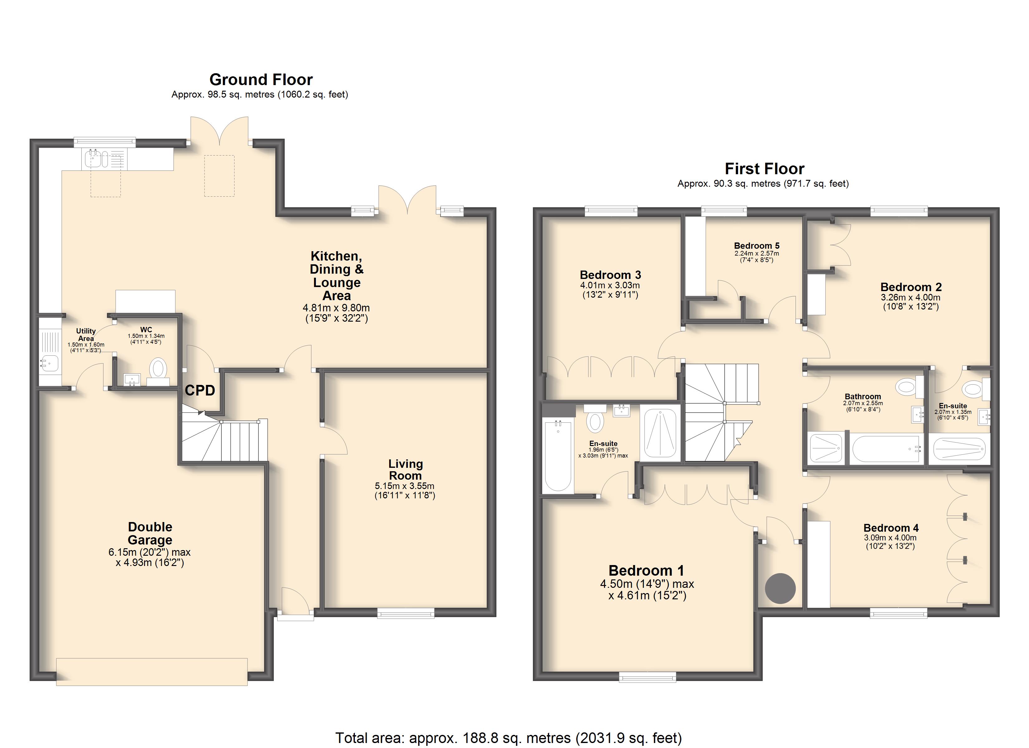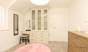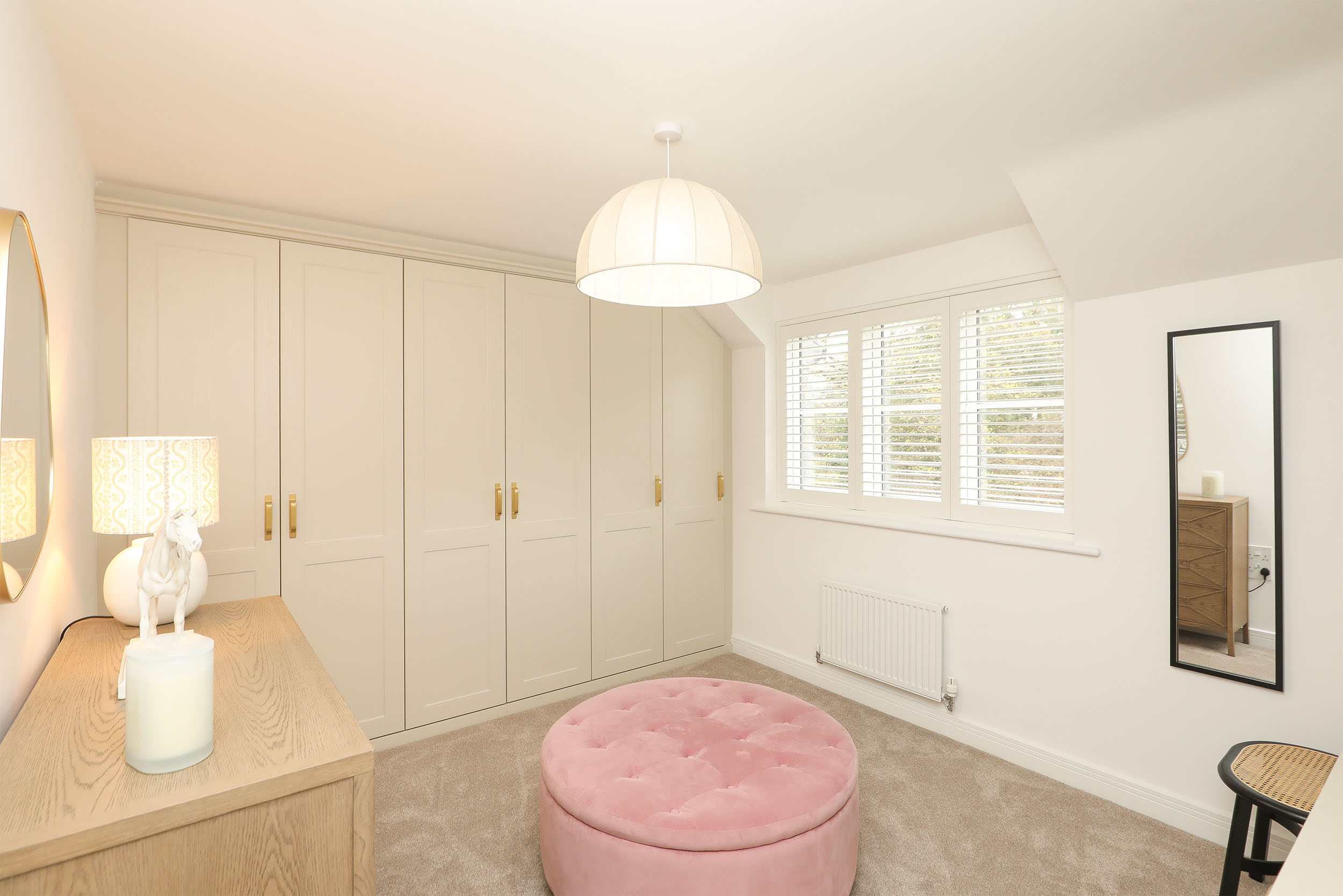 The first floor is accessed via a bright and airy landing and accommodates all five bedrooms, each beautifully appointed and thoughtfully designed. The principal bedroom is a magnificent private suite, complete with bespoke fitted wardrobes and furniture, along with an elegant en-suite bathroom. Bedroom two also benefits from its own stylish en-suite shower room, while the remaining three bedrooms all feature bespoke fitted wardrobes, offering excellent storage and flexibility for family living, guests, or home working.