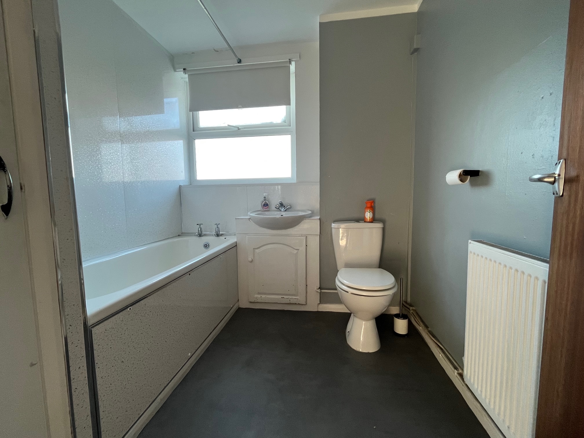 with low level WC, wash hand basin, bath and shower, double glazed window and radiator