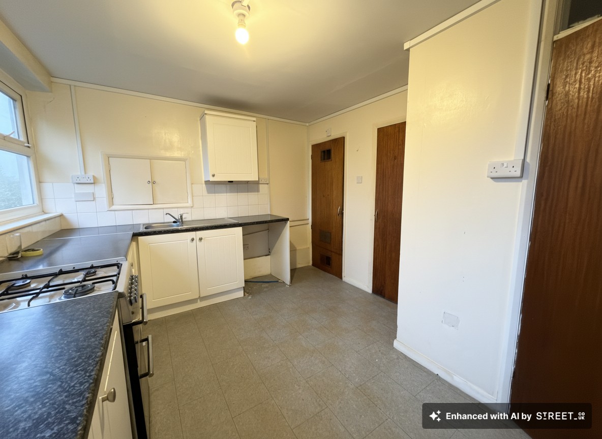 Kitchen with range of base and wall cupboards, work surfaces, double glazed windows and cupboard housing central heating boiler