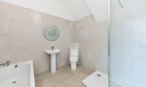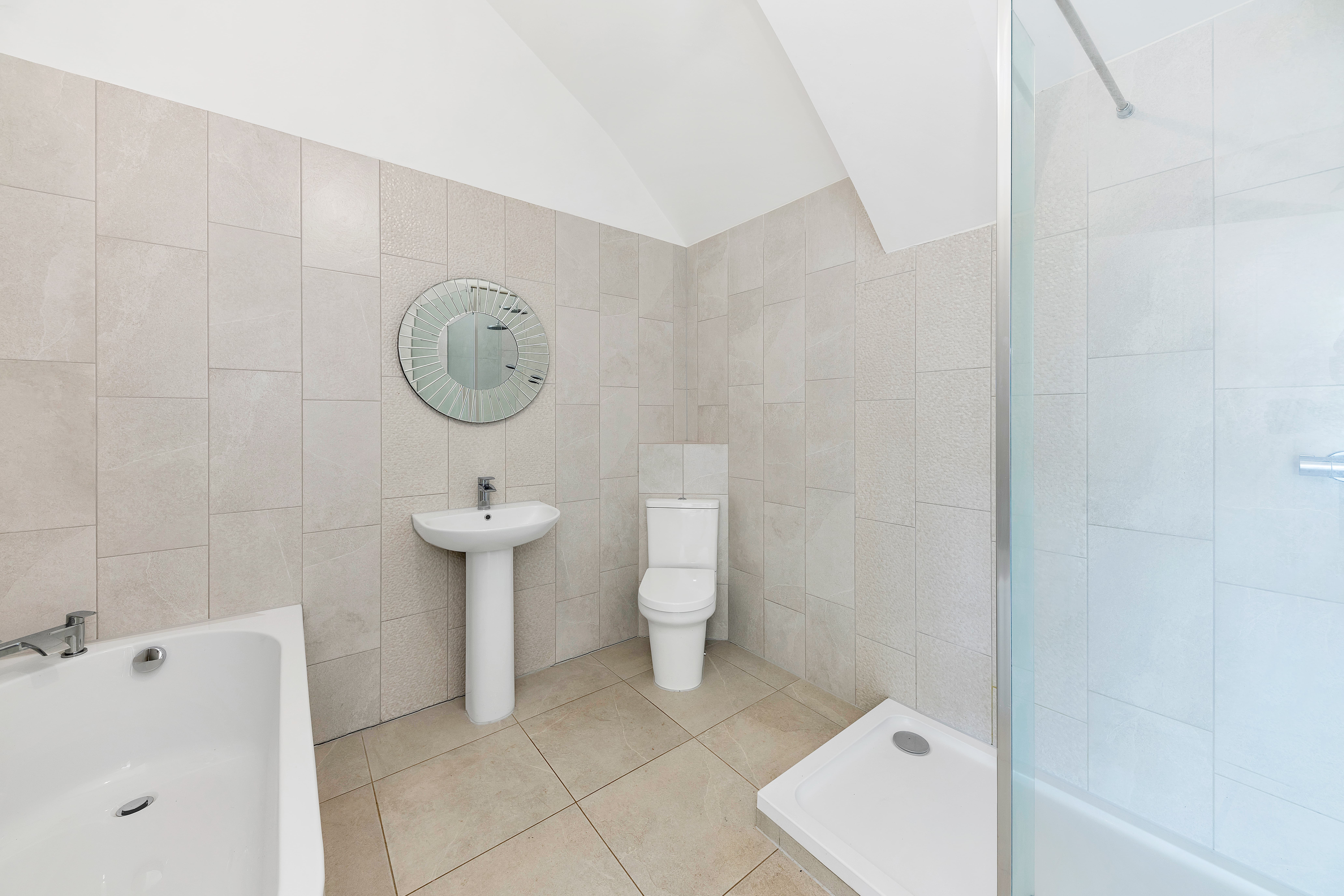 Through to the rest of the sleeping quarters, this lovely home continues to impress, with a further large double bedroom, and a beautiful family bathroom, fully tiled with vaulted ceilings and comprising a shower, a bathroom, a WC, a hand wash basin, and a heated towel rail.