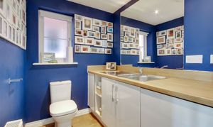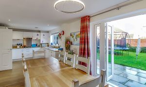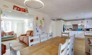 The entrance hall leads through to a bright sitting room with a fireplace, and a separate room that can be used as a study or playroom. There’s good storage under the stairs, plus a utility room with a WC. At the rear, the kitchen and breakfast space opens straight onto the garden, so it becomes the centre of the house day to day.