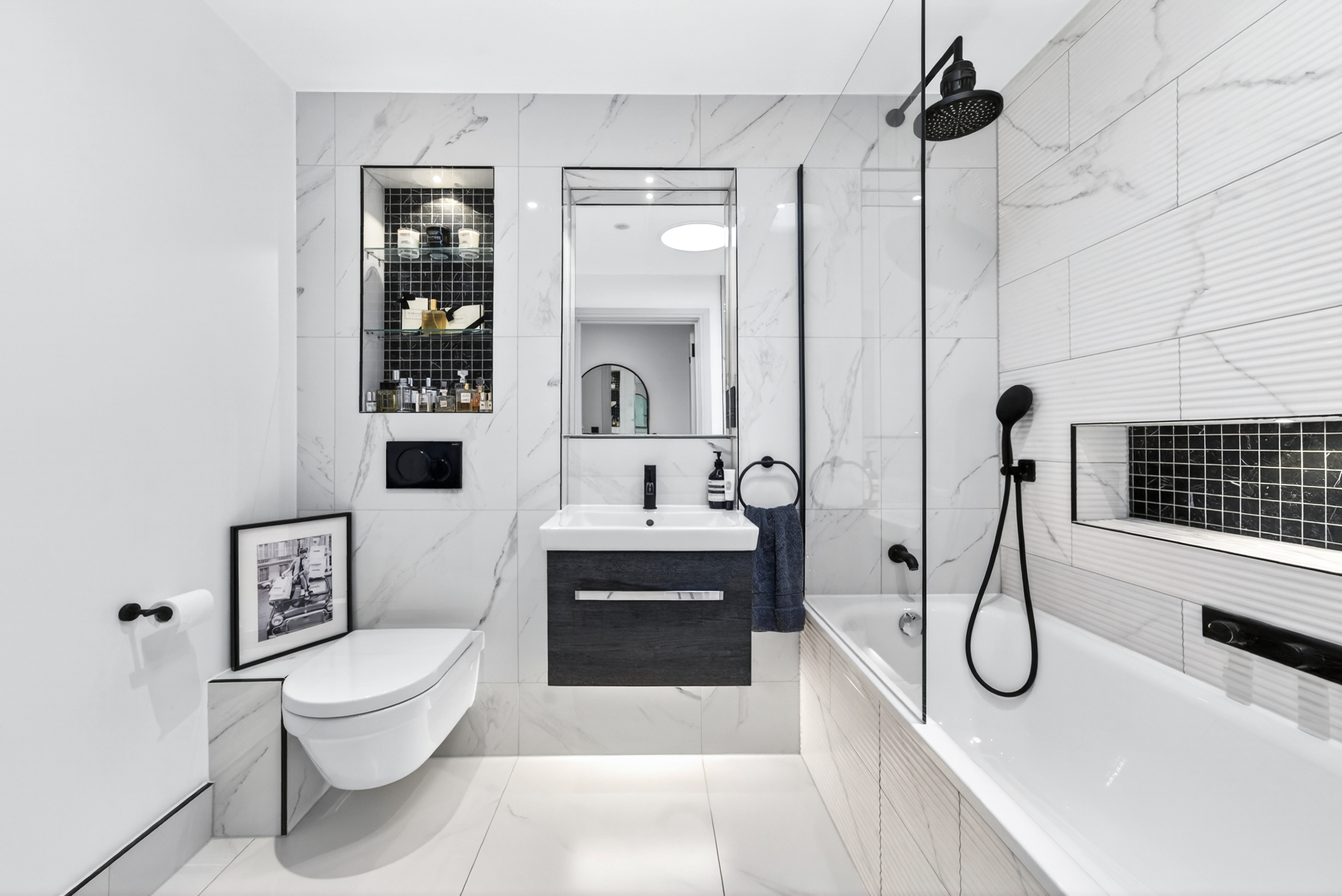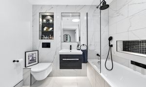 The bathroom is well proportioned for the size of the property, with a full-length bath and a light well for natural light.