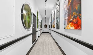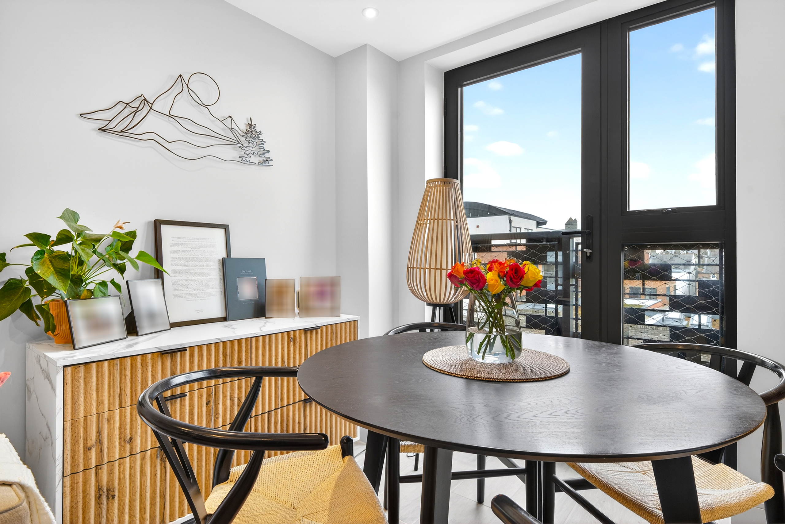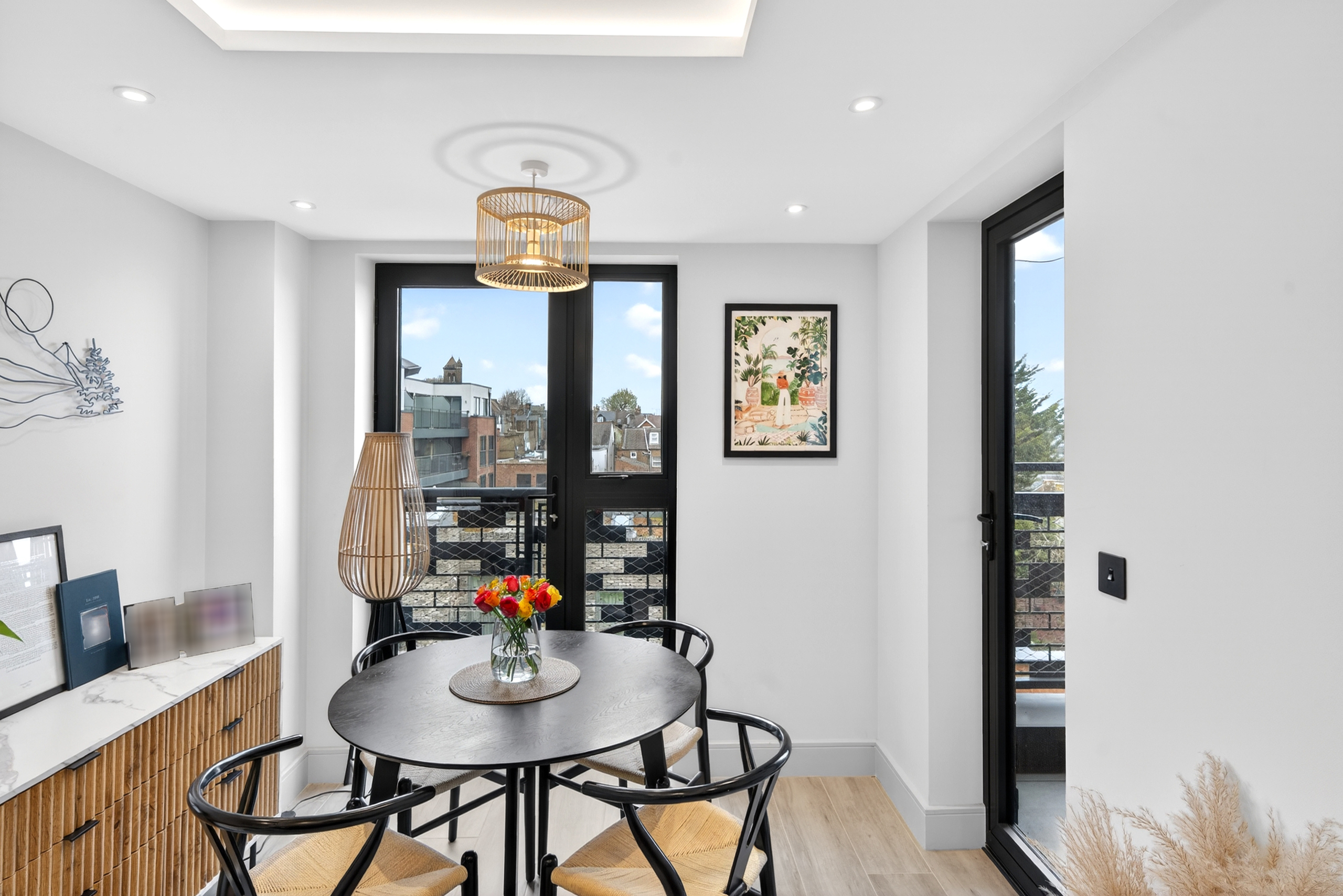 The open-plan reception with floor-to-ceiling windows and a Juliet balcony naturally draws your attention as you walk in and gives you a sense of space with the uninterrupted views towards Alexander Palace and North London.