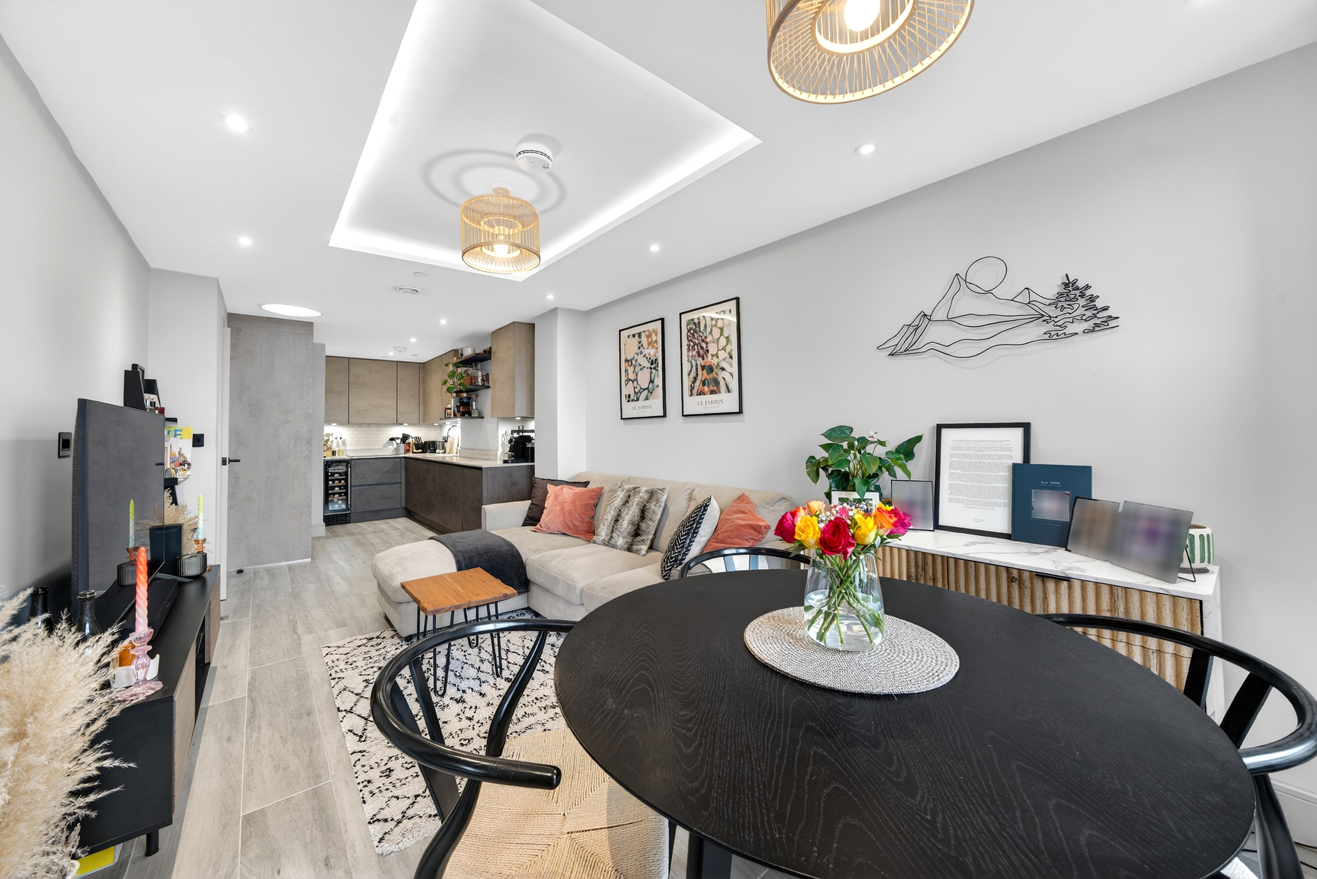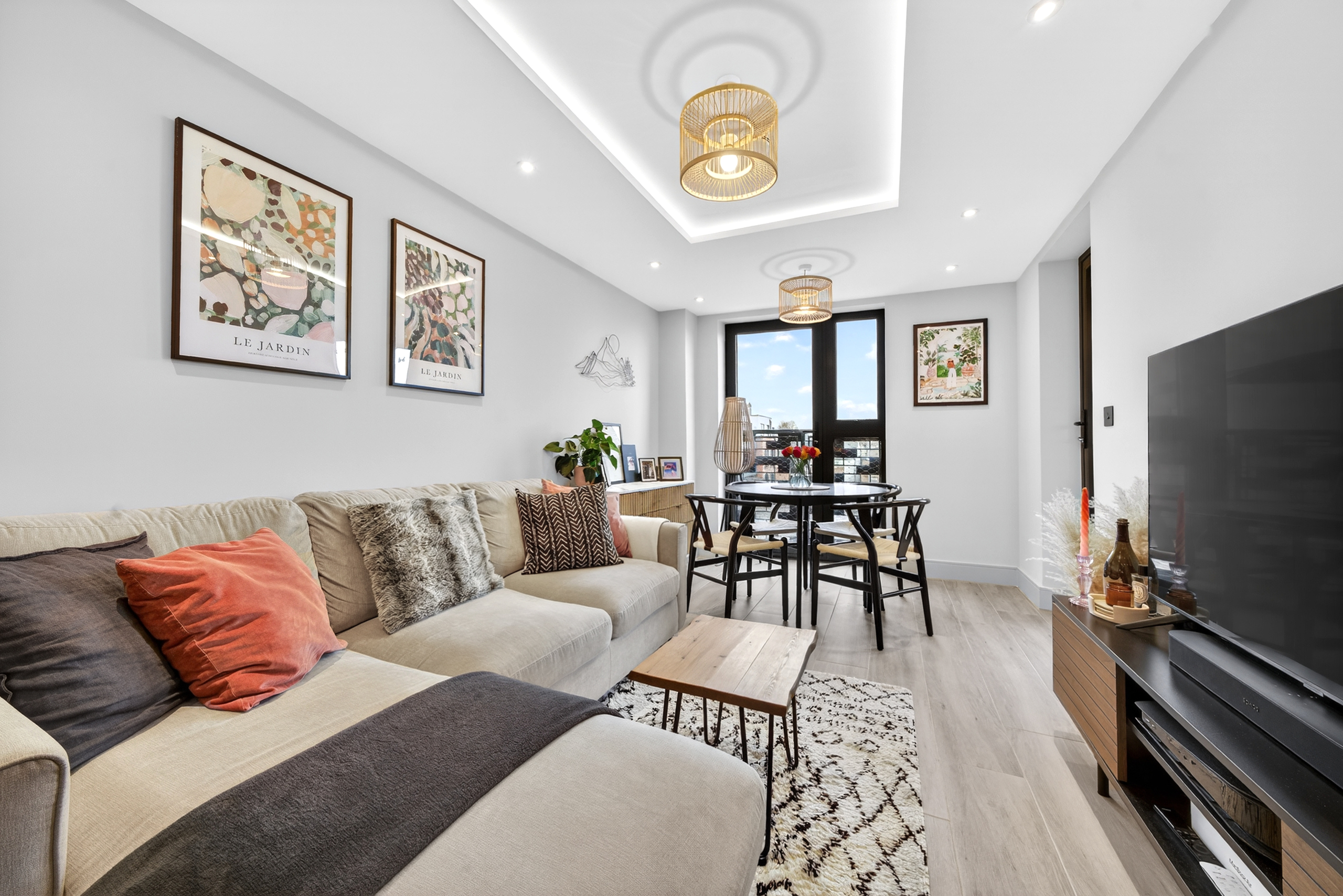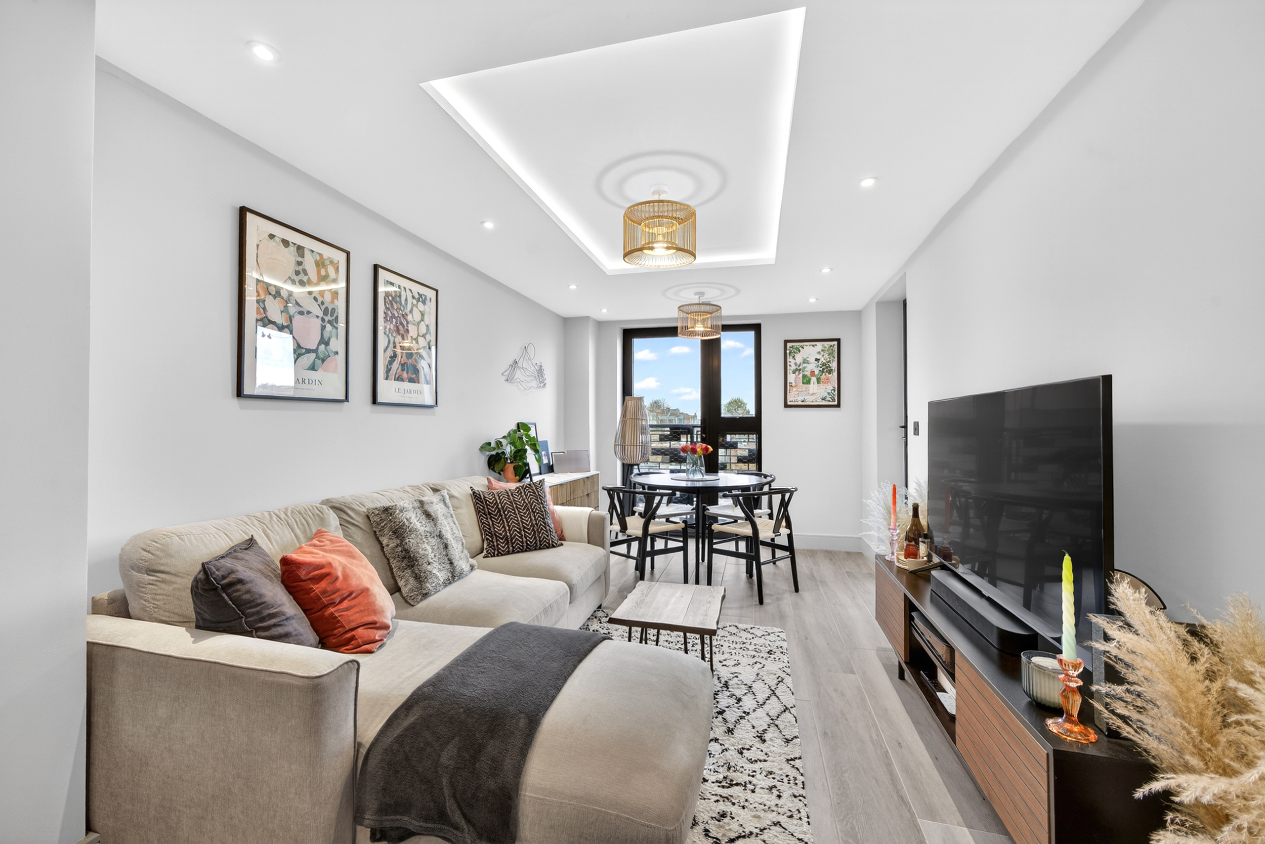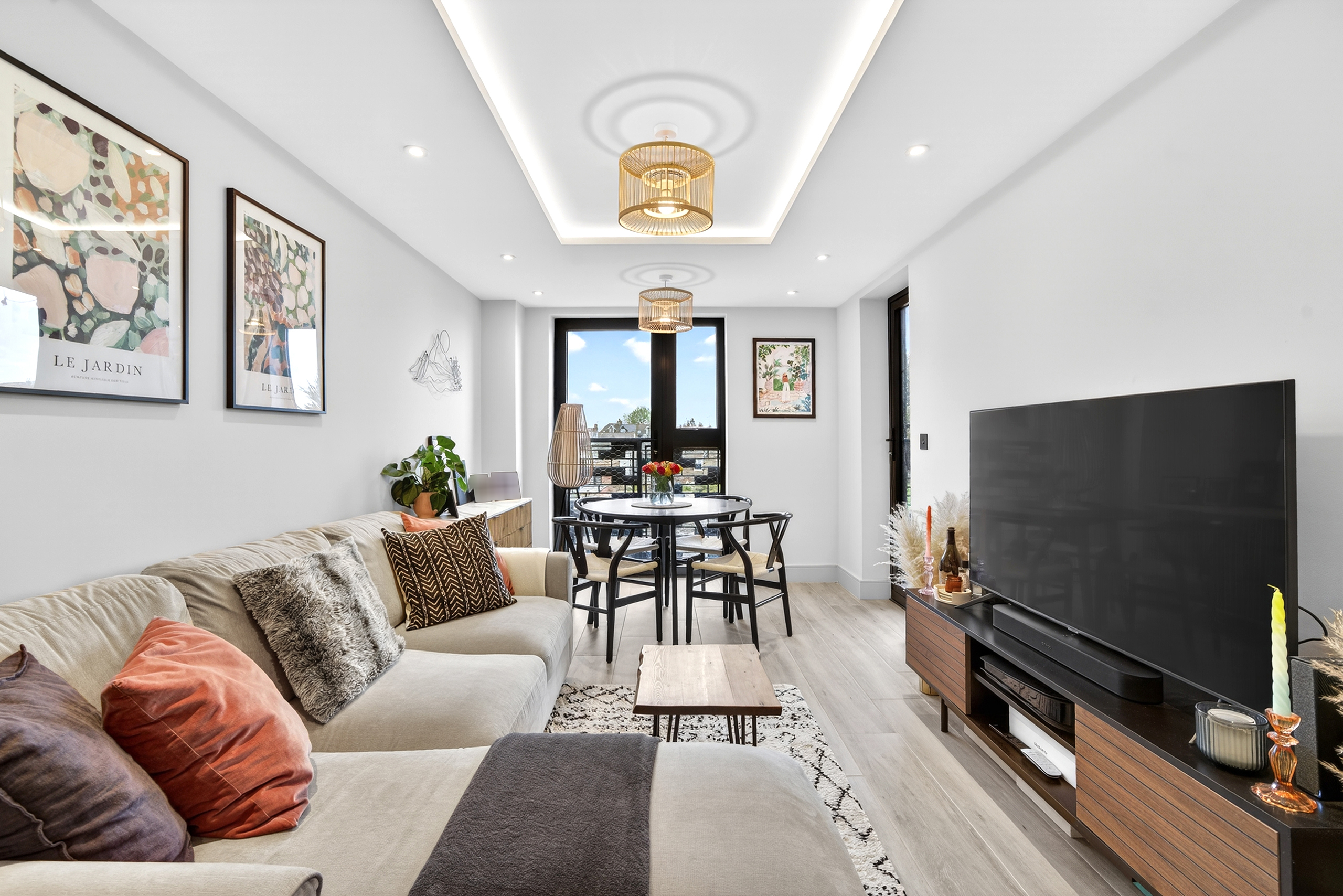 There is ample space for a dining table, making it ideal for relaxing, entertaining, and it can double up as a desk for those working from home.