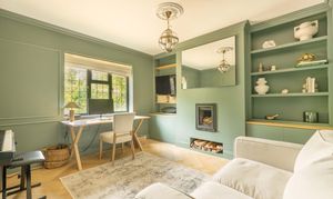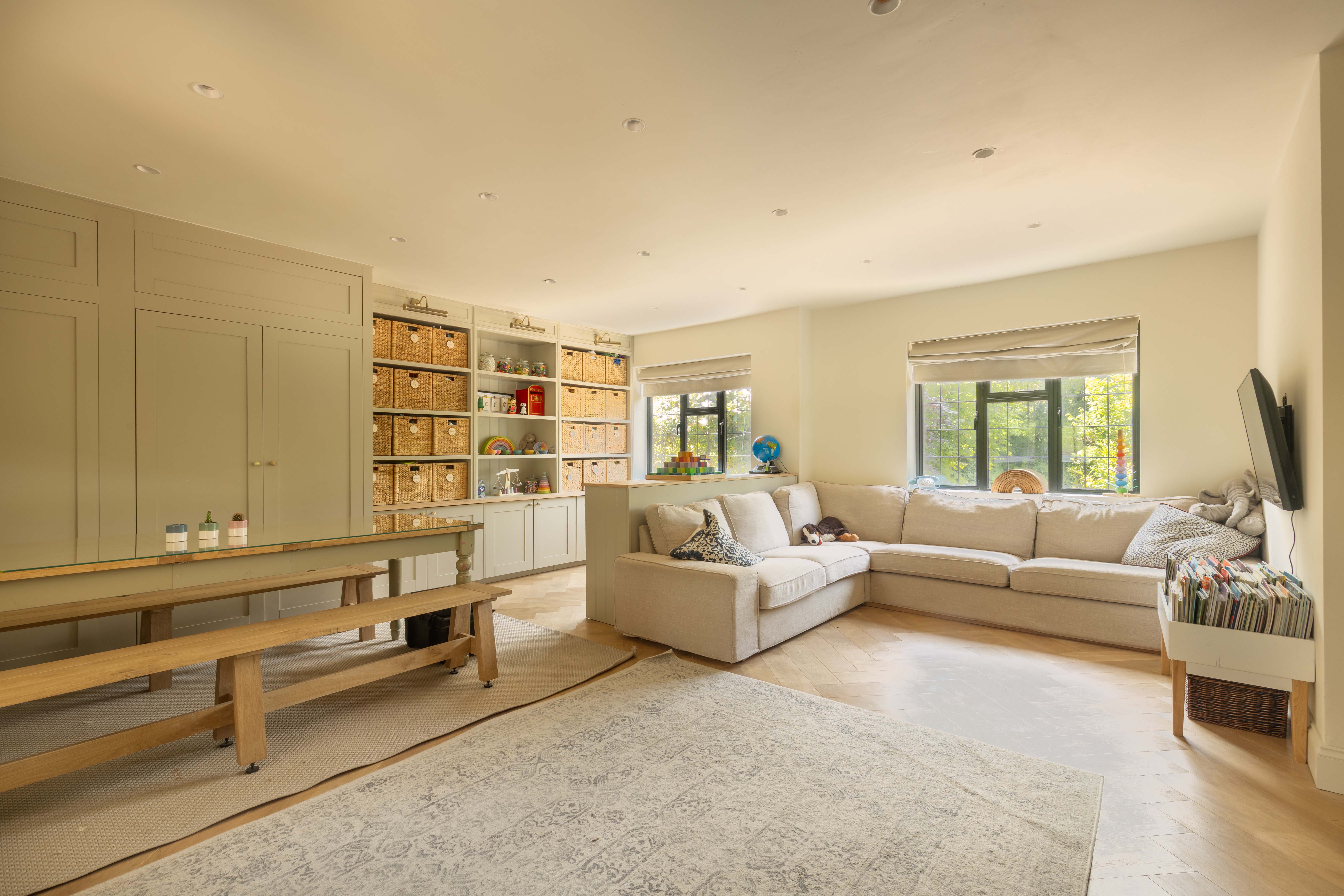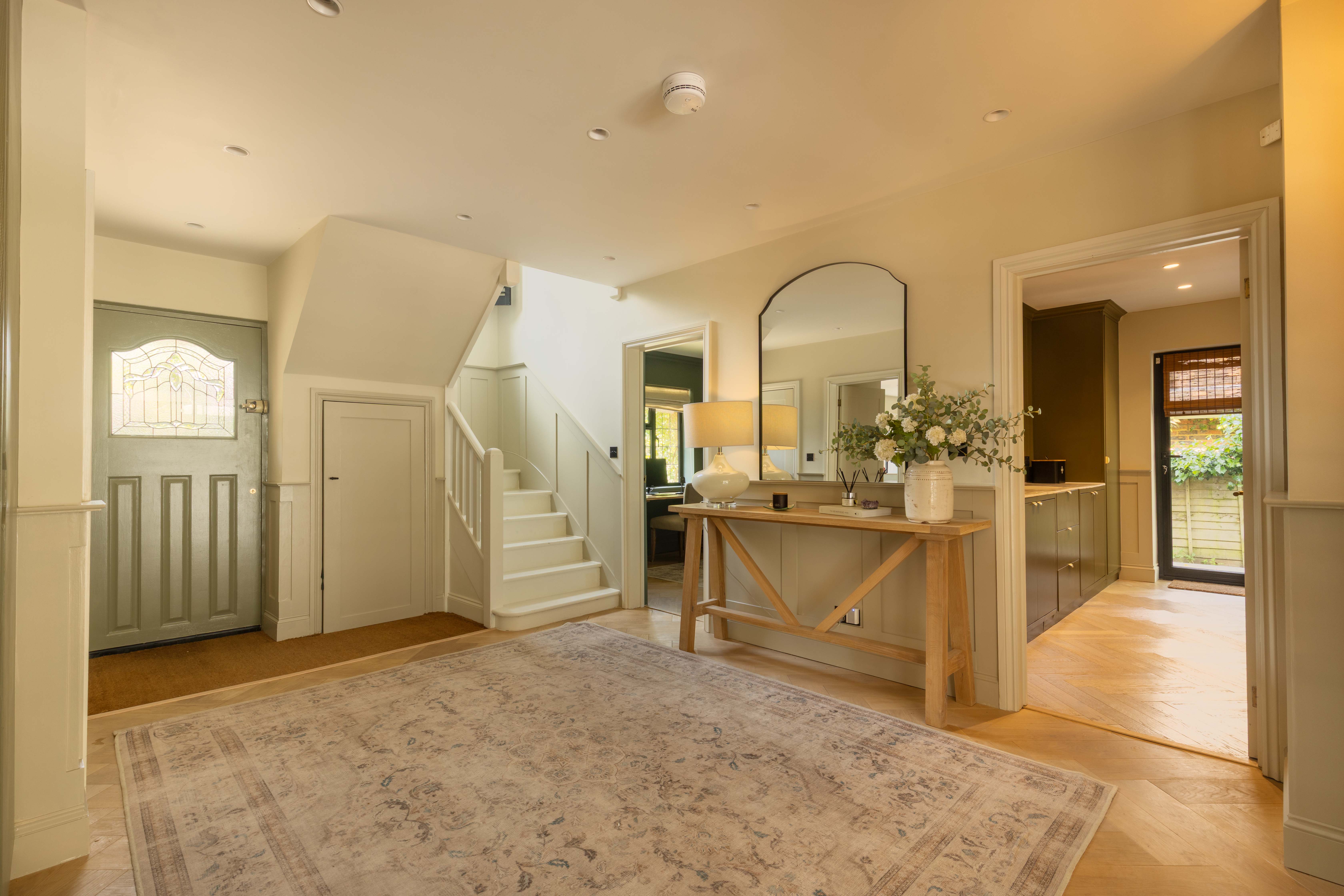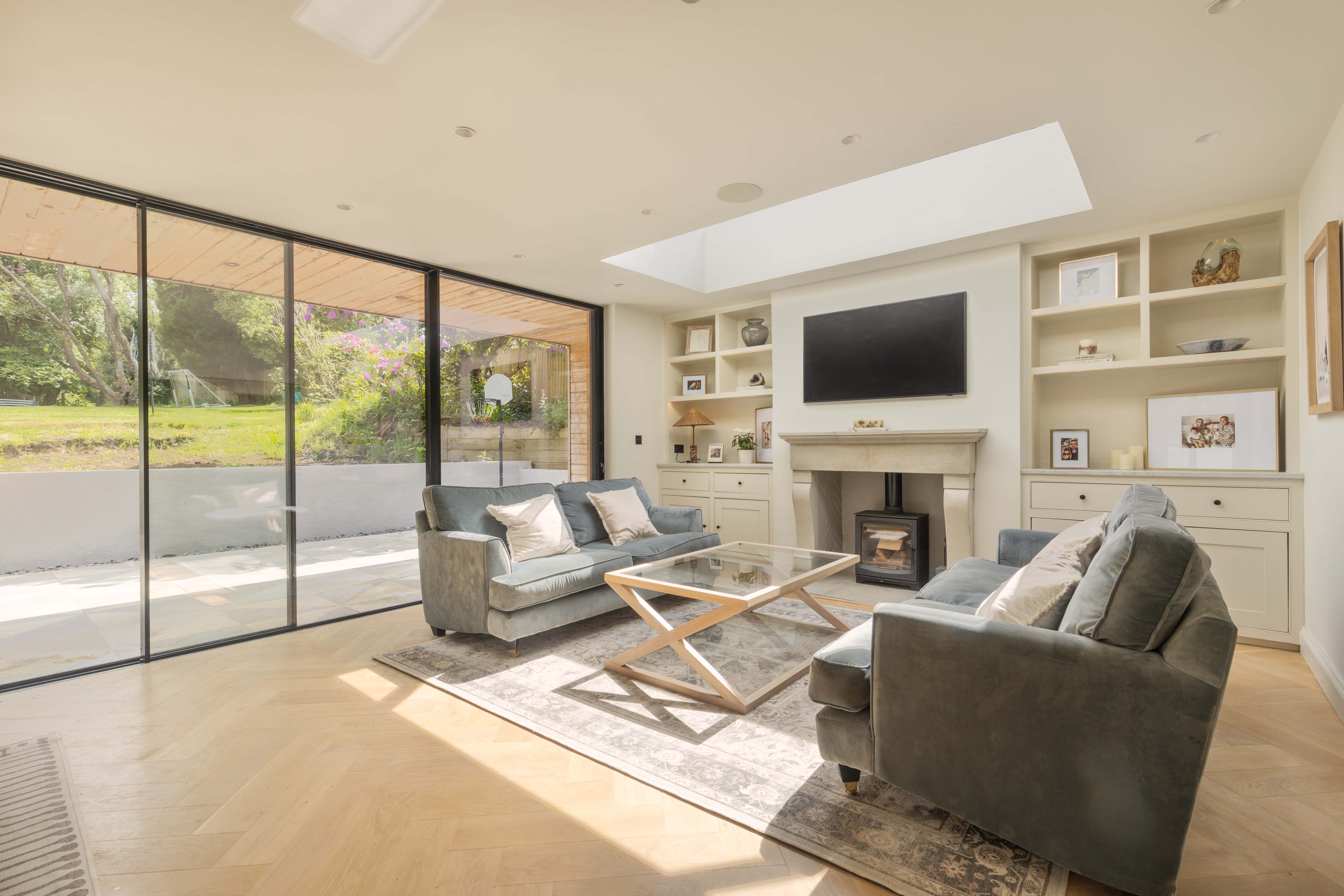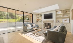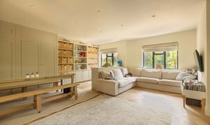 The welcoming entrance hall features practical storage and leads through double doors into the breathtaking main living space. This light-filled area is perfect for family life and entertaining, with a wall of glazing and doors opening directly onto the rear garden to create a true indoor-outdoor flow. The kitchen is a cook’s dream, fitted with premium Siemens appliances including a steam oven, microwave, induction hob, and Quooker tap, alongside a Fisher & Paykel fridge/freezer and twin dishwashers to make entertaining a breeze. Contrasting cabinetry, a statement island with light wood tones and stainless steel worksurfaces, together with herringbone oak flooring add to the sophisticated aesthetic, while a roof lantern floods the space with natural light. The adjoining sitting area includes a wood burner, bespoke shelving, flush ceiling speakers to either end of the room and ample space for a large dining table. Additional ground floor accommodation includes a spacious family room—ideal as a formal sitting area, playroom or teen den—a cosy snug/home office with wood burner, a generous utility room, and a cloakroom with WC and basin.