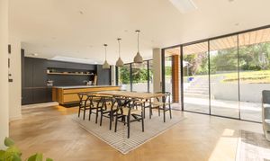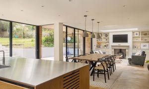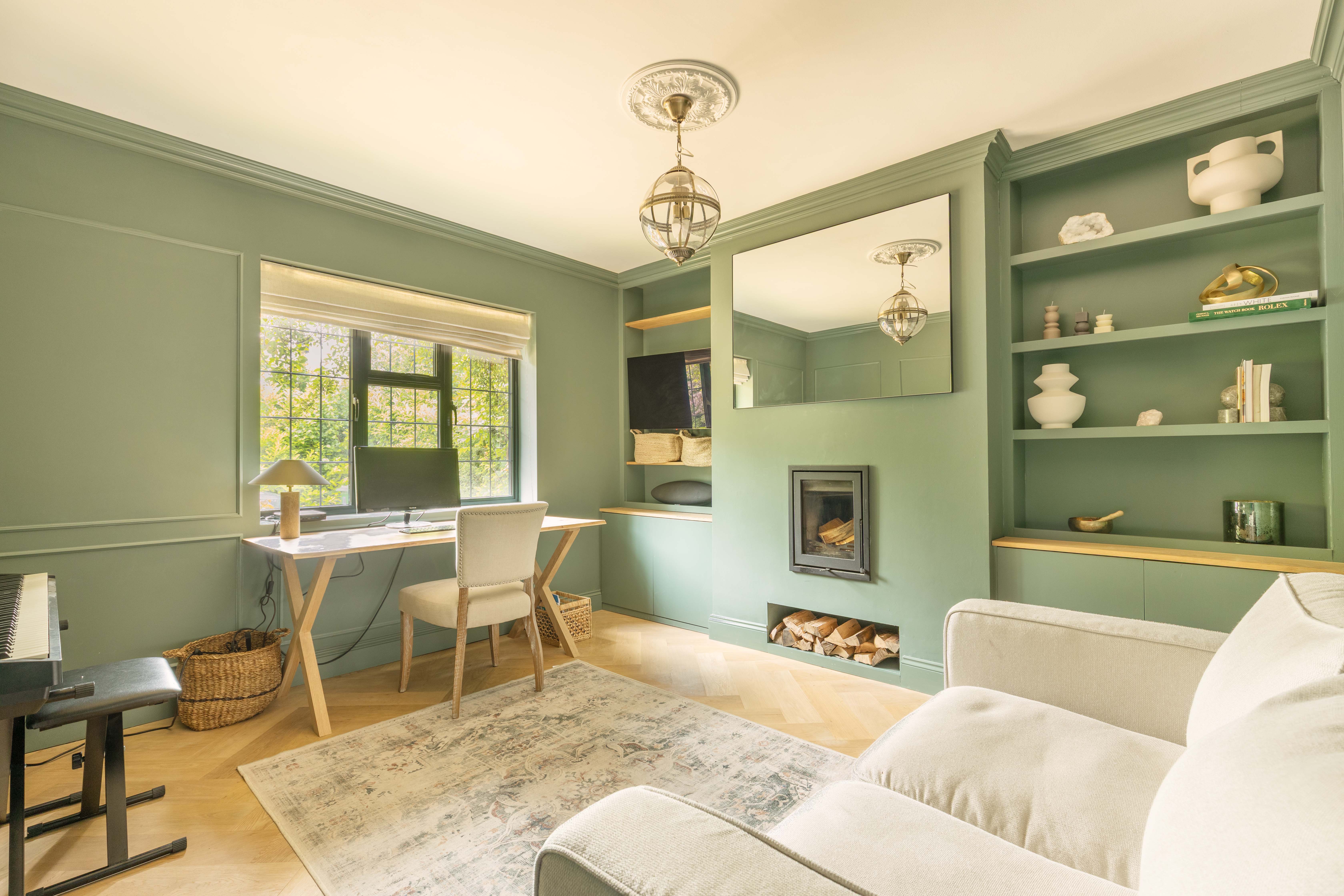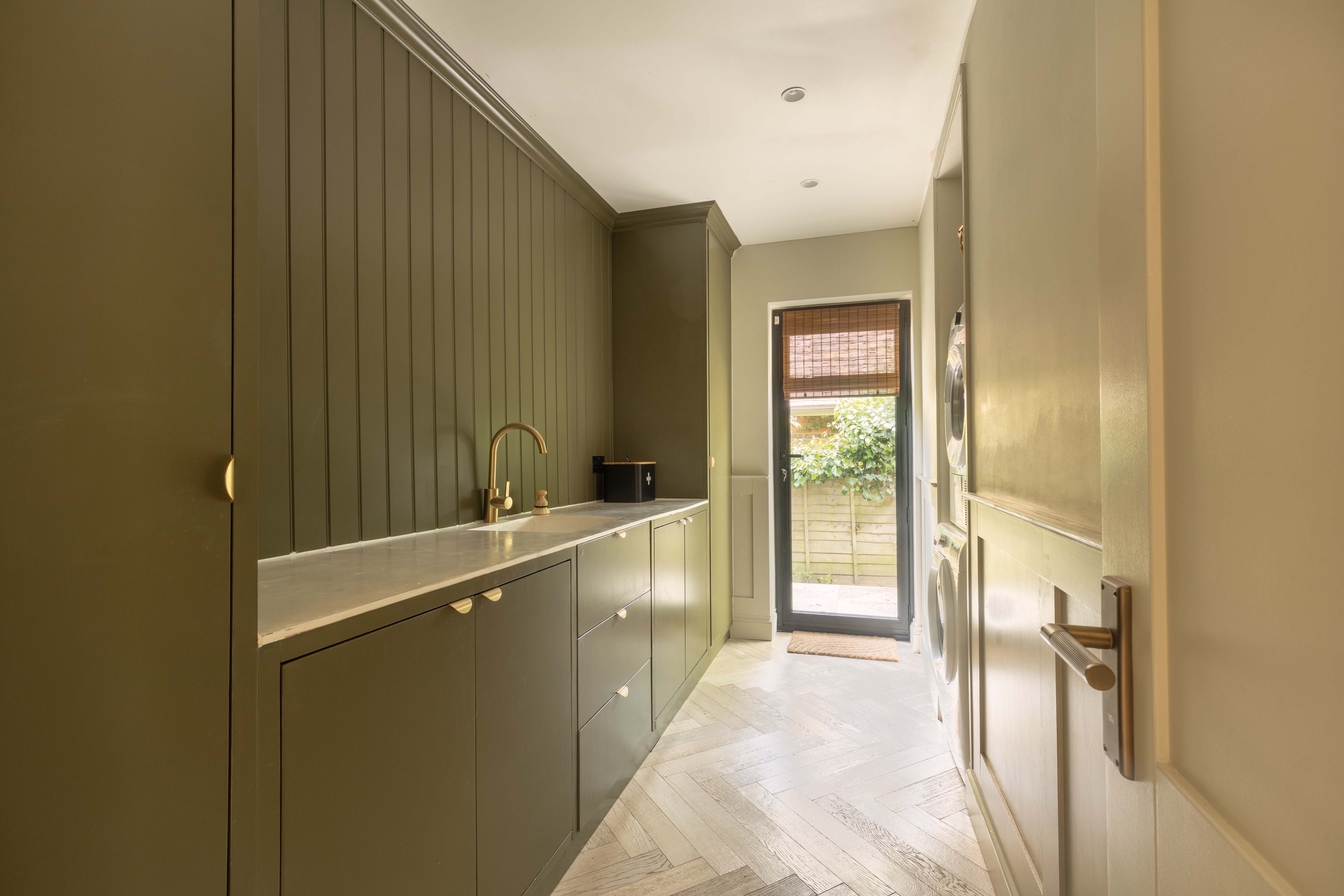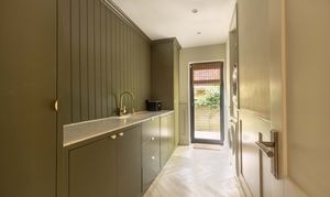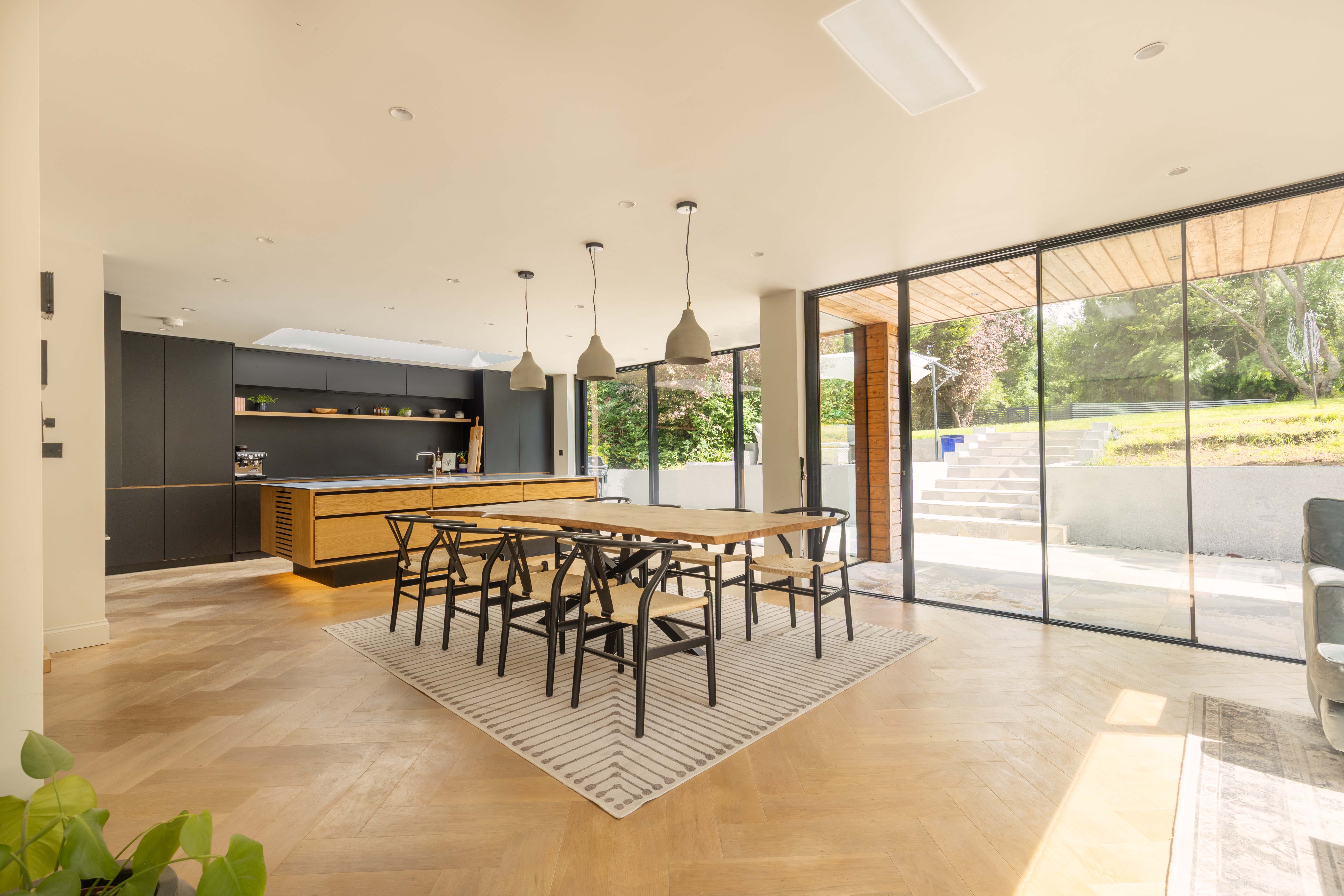 The welcoming entrance hall features practical storage and leads through double doors into the breathtaking main living space. This light-filled area is perfect for family life and entertaining, with a wall of glazing and doors opening directly onto the rear garden to create a true indoor-outdoor flow. The kitchen is a cook’s dream, fitted with premium Siemens appliances including a steam oven, microwave, induction hob, and Quooker tap, alongside a Fisher & Paykel fridge/freezer and twin dishwashers to make entertaining a breeze. Contrasting cabinetry, a statement island with light wood tones and stainless steel worksurfaces, together with herringbone oak flooring add to the sophisticated aesthetic, while a roof lantern floods the space with natural light. The adjoining sitting area includes a wood burner, bespoke shelving, flush ceiling speakers to either end of the room and ample space for a large dining table. Additional ground floor accommodation includes a spacious family room—ideal as a formal sitting area, playroom or teen den—a cosy snug/home office with wood burner, a generous utility room, and a cloakroom with WC and basin.